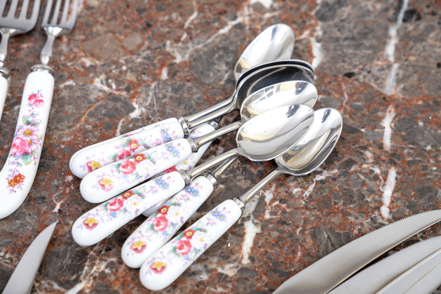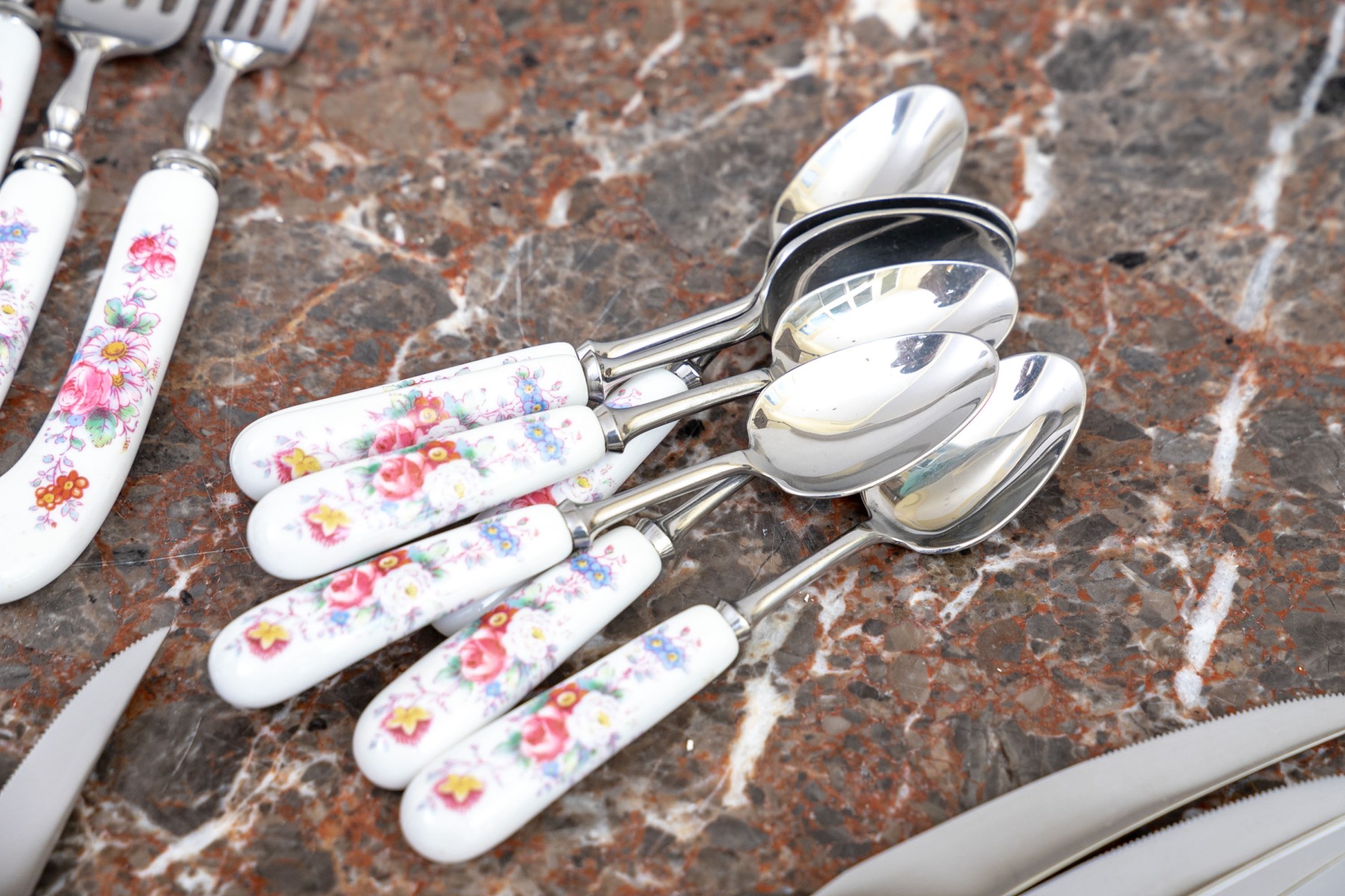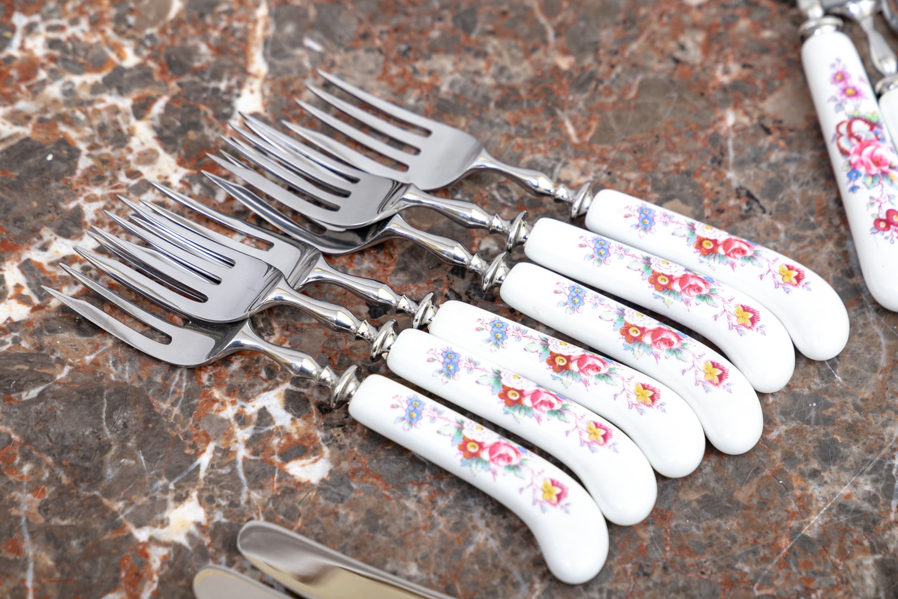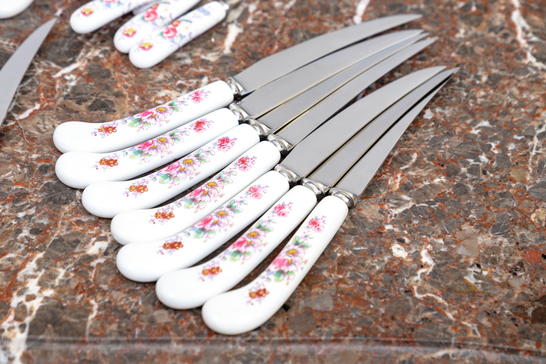 The service features blades marked "Royal Crown Derby / Made In England". All pieces feature polychrome floral sprays on "J" form white china handles.
