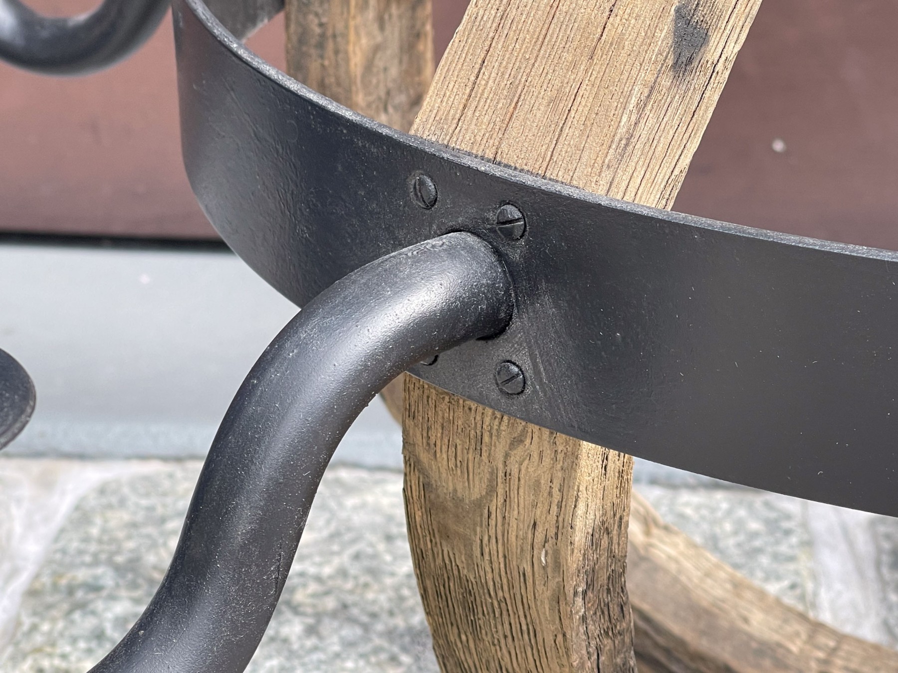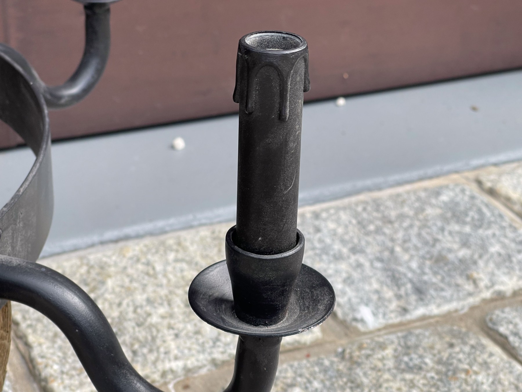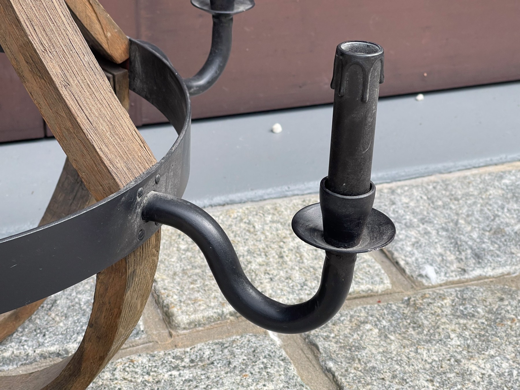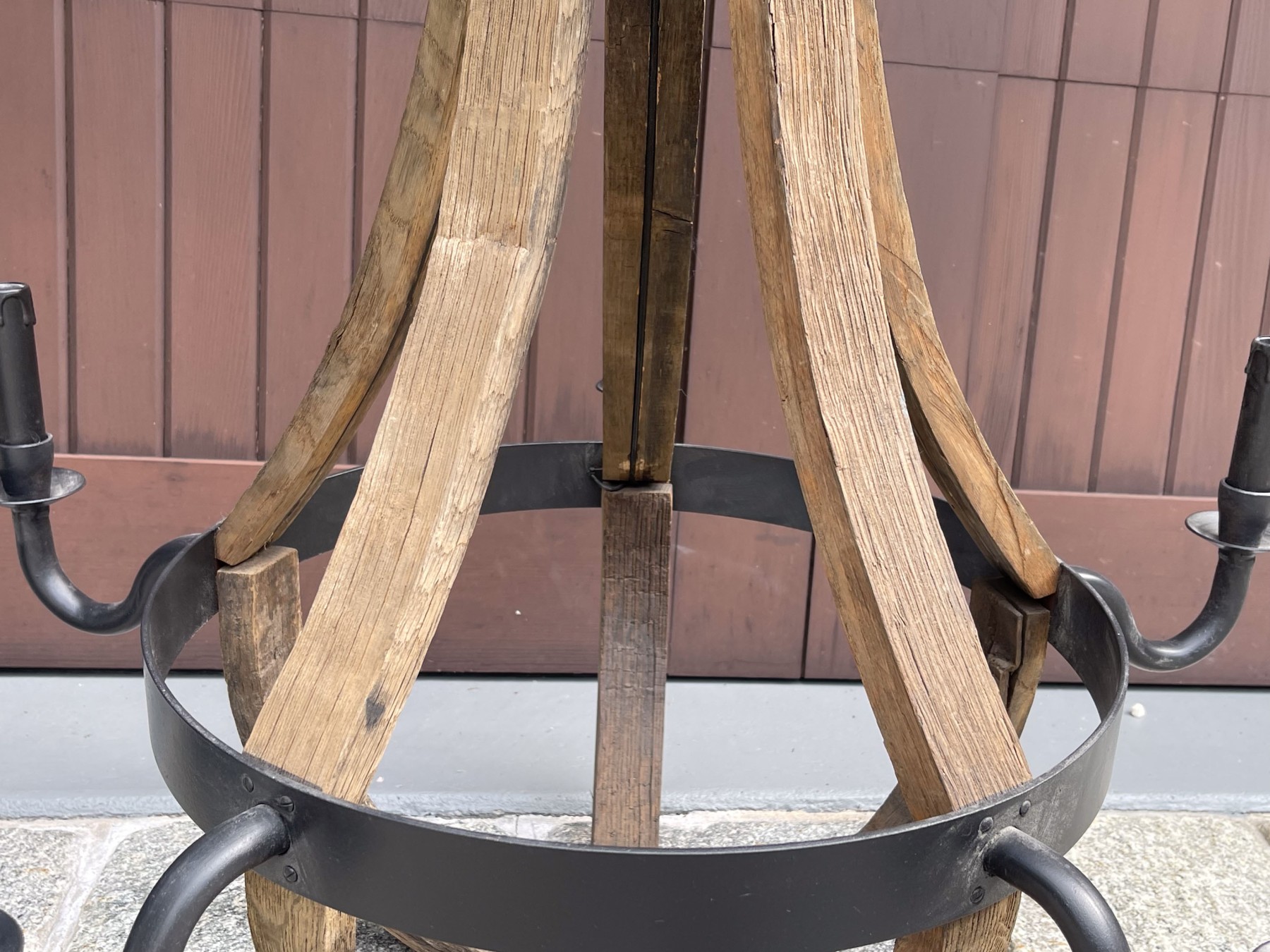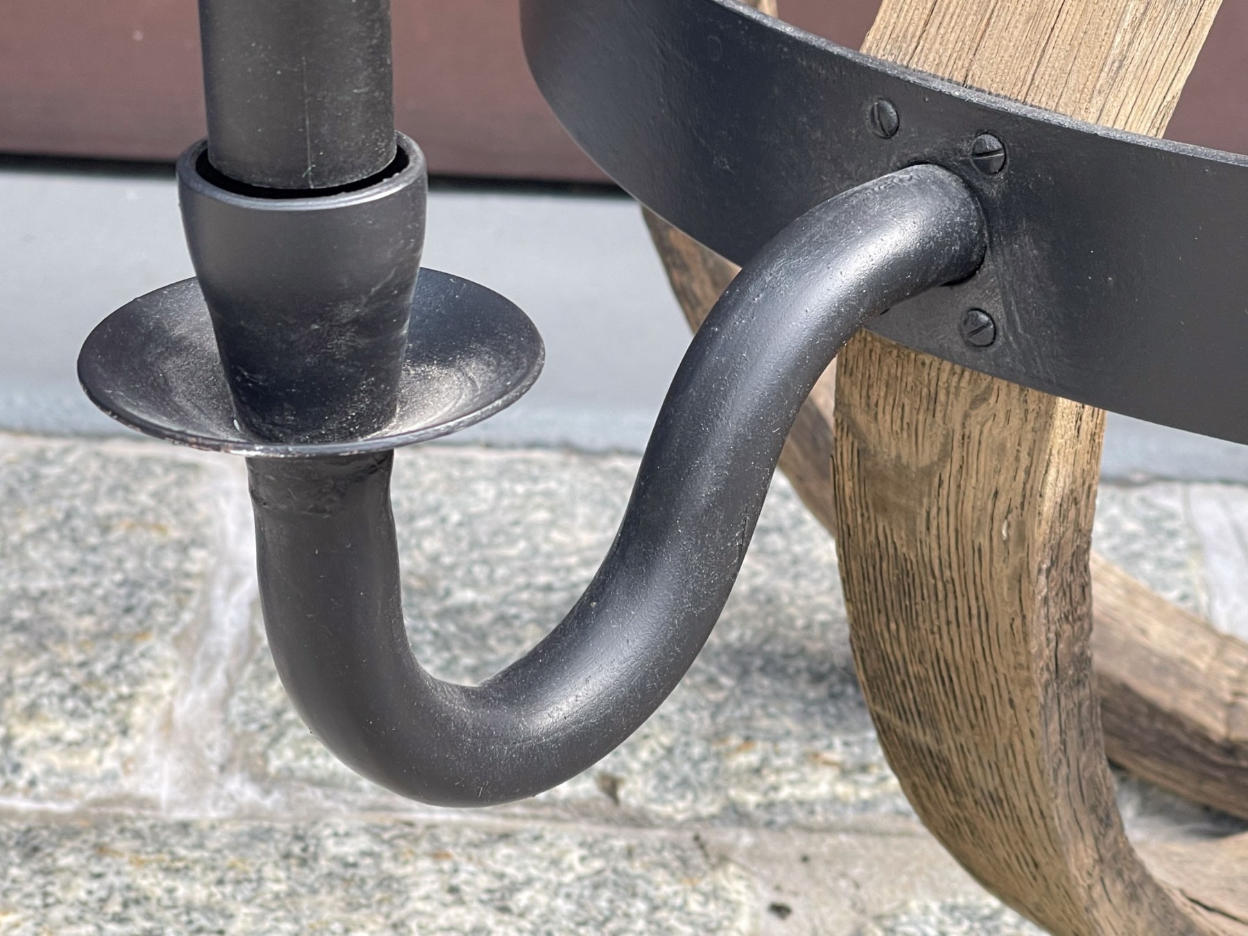 A delightfully distinguished chandelier with eye-catching lodge and farmhouse appeal. Sports a rusti, curving wood body encircled by a black iron ring supporting five black candle sockets.
