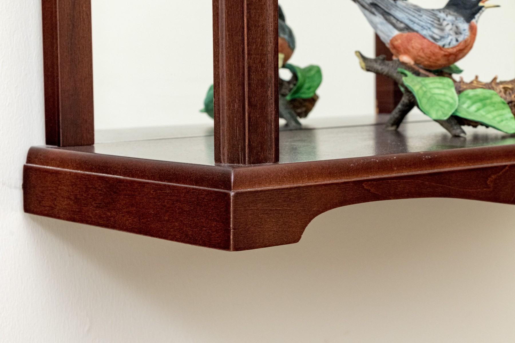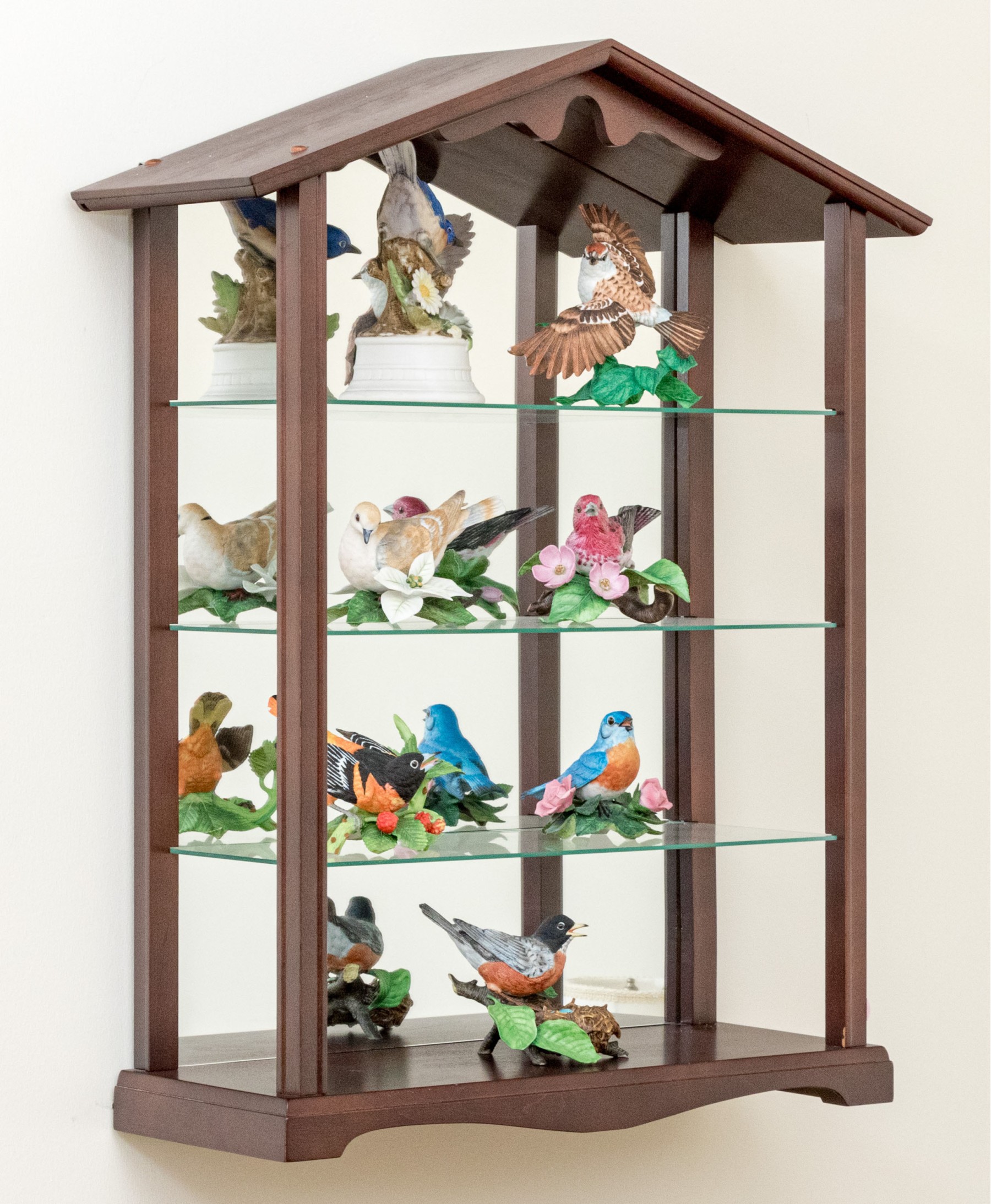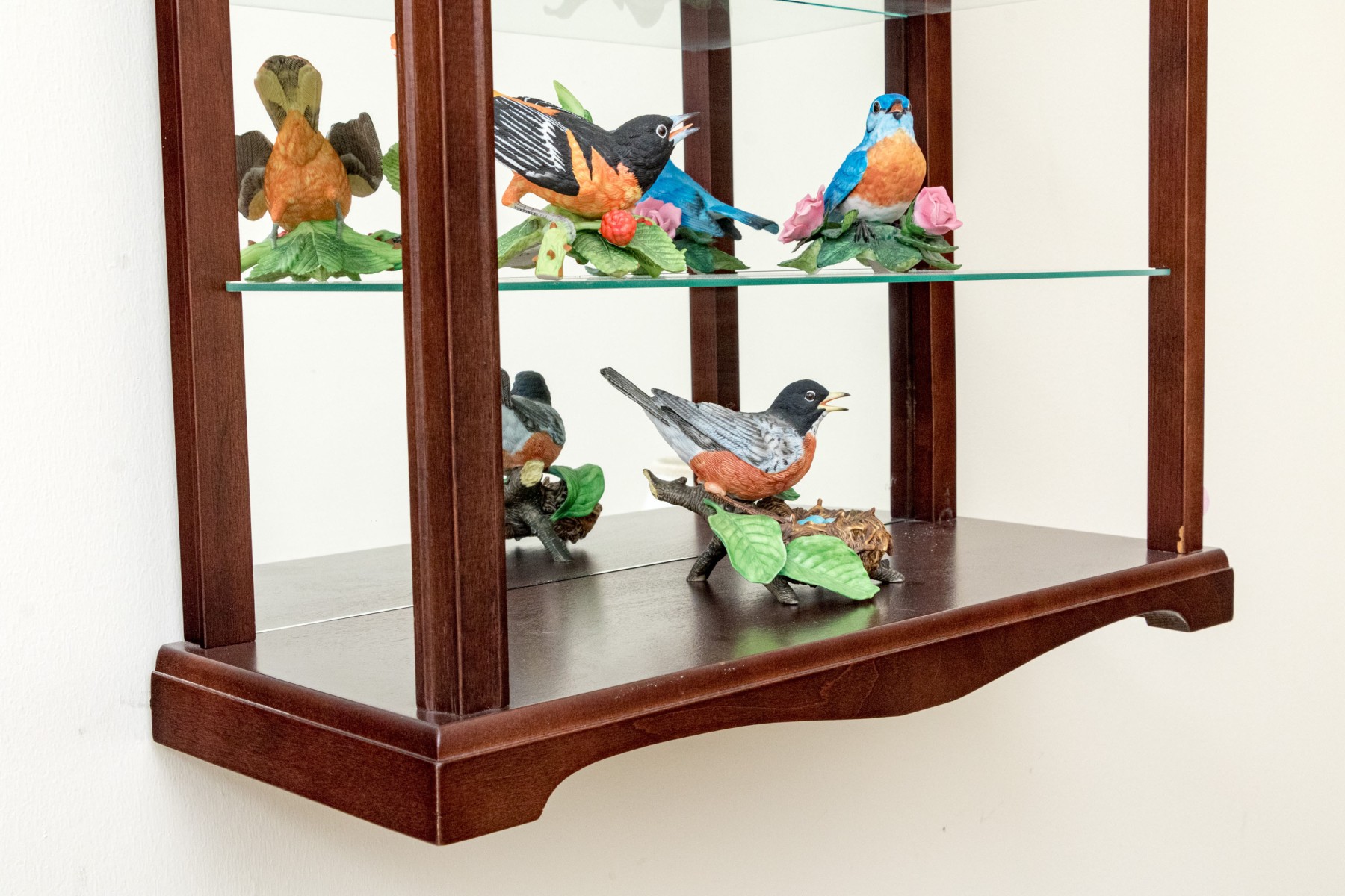 A delightful wall mounted wood and glass etagere with seven porcelain bird figurines. With a handful of Lenox figures including "Purple Finch," "American Robin," "Baltimore Oriole" and "Eastern Bluebird"