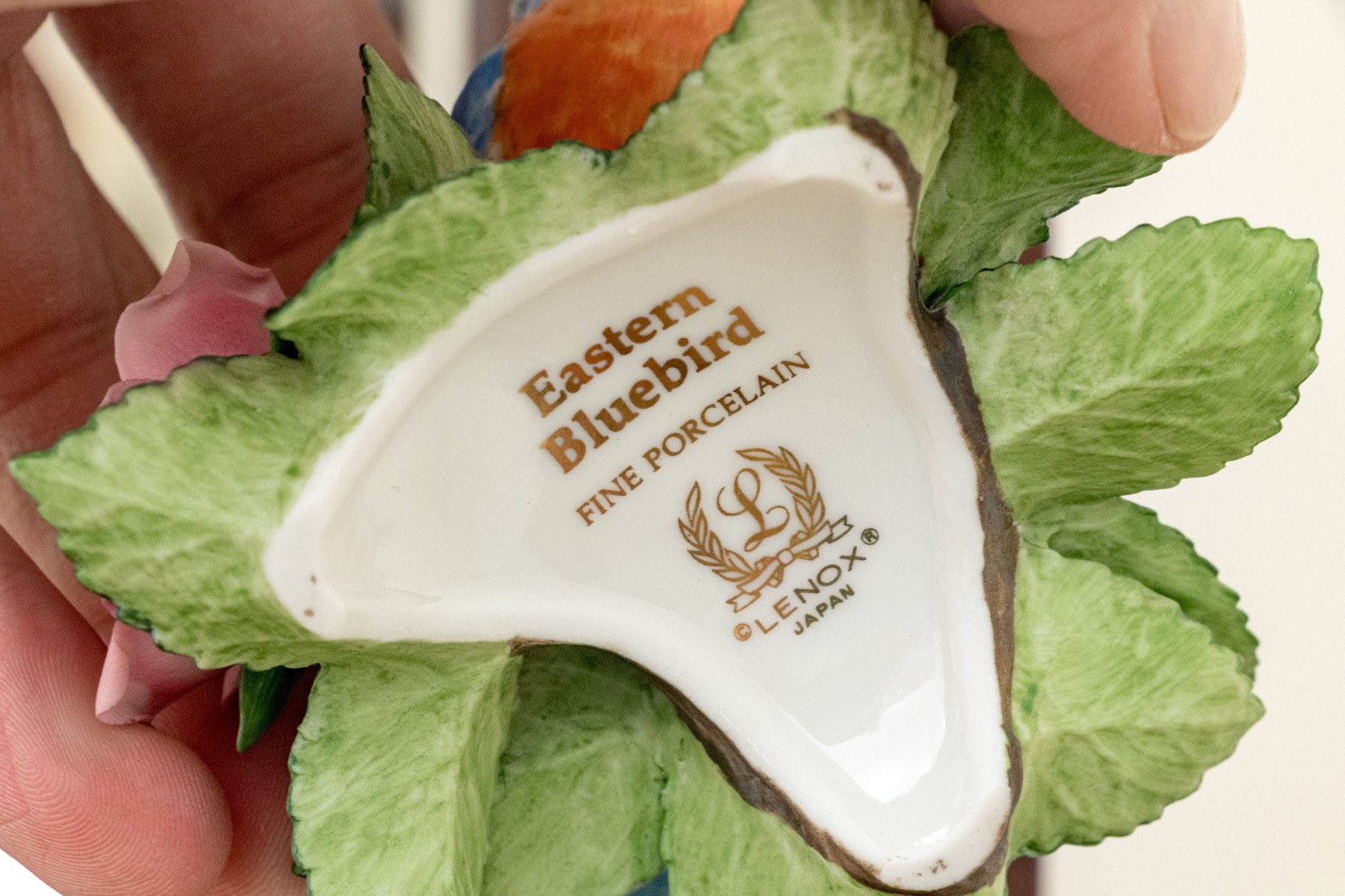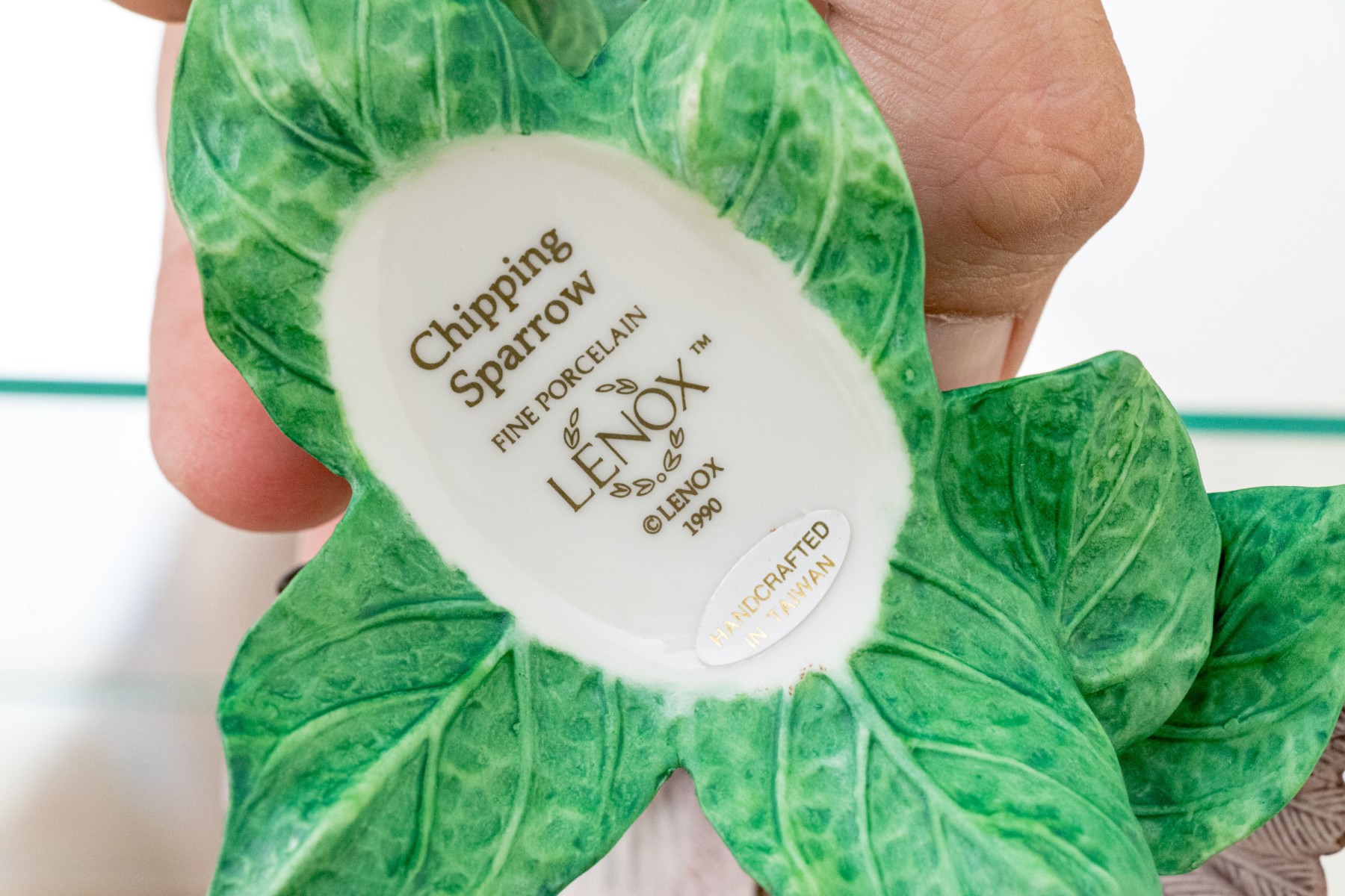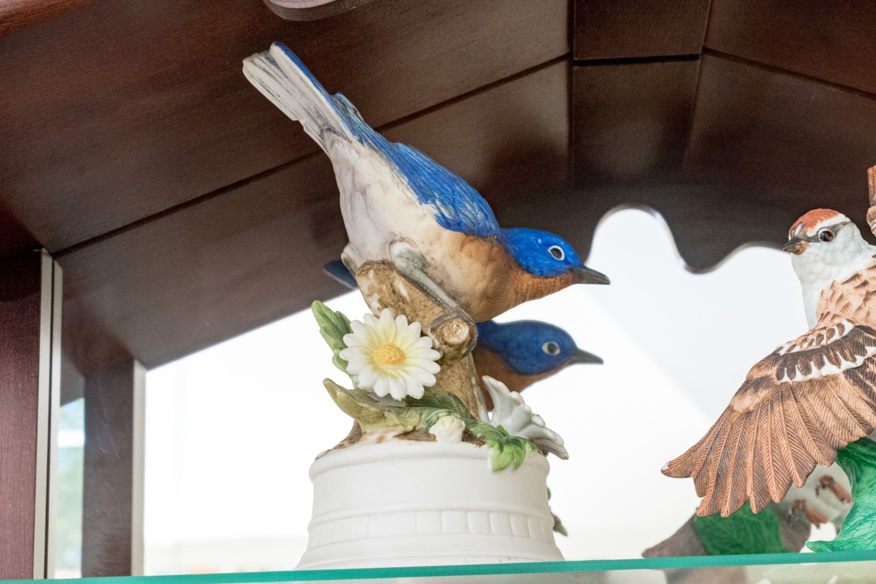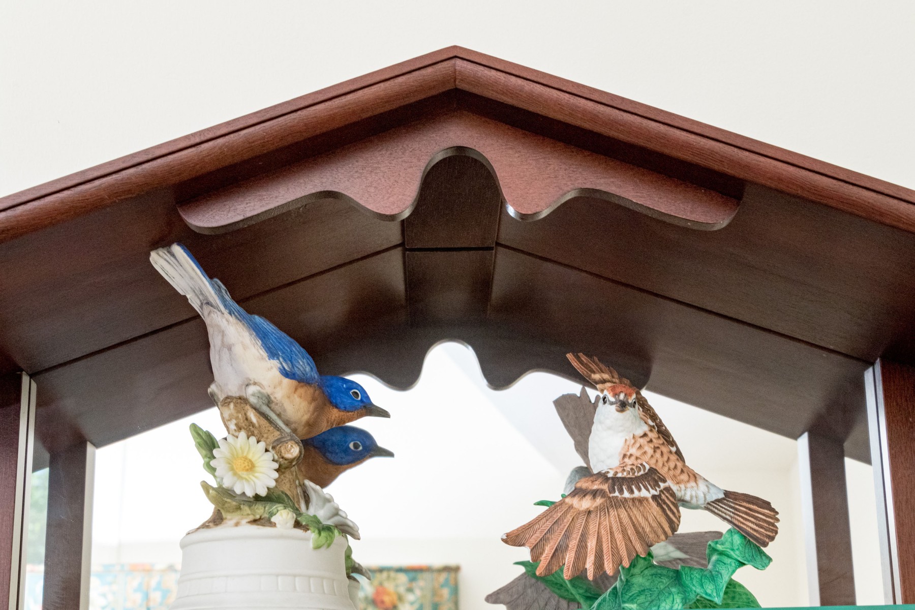 A delightful wall mounted wood and glass etagere with seven porcelain bird figurines. With a handful of Lenox figures including "Purple Finch," "American Robin," "Baltimore Oriole" and "Eastern Bluebird"
