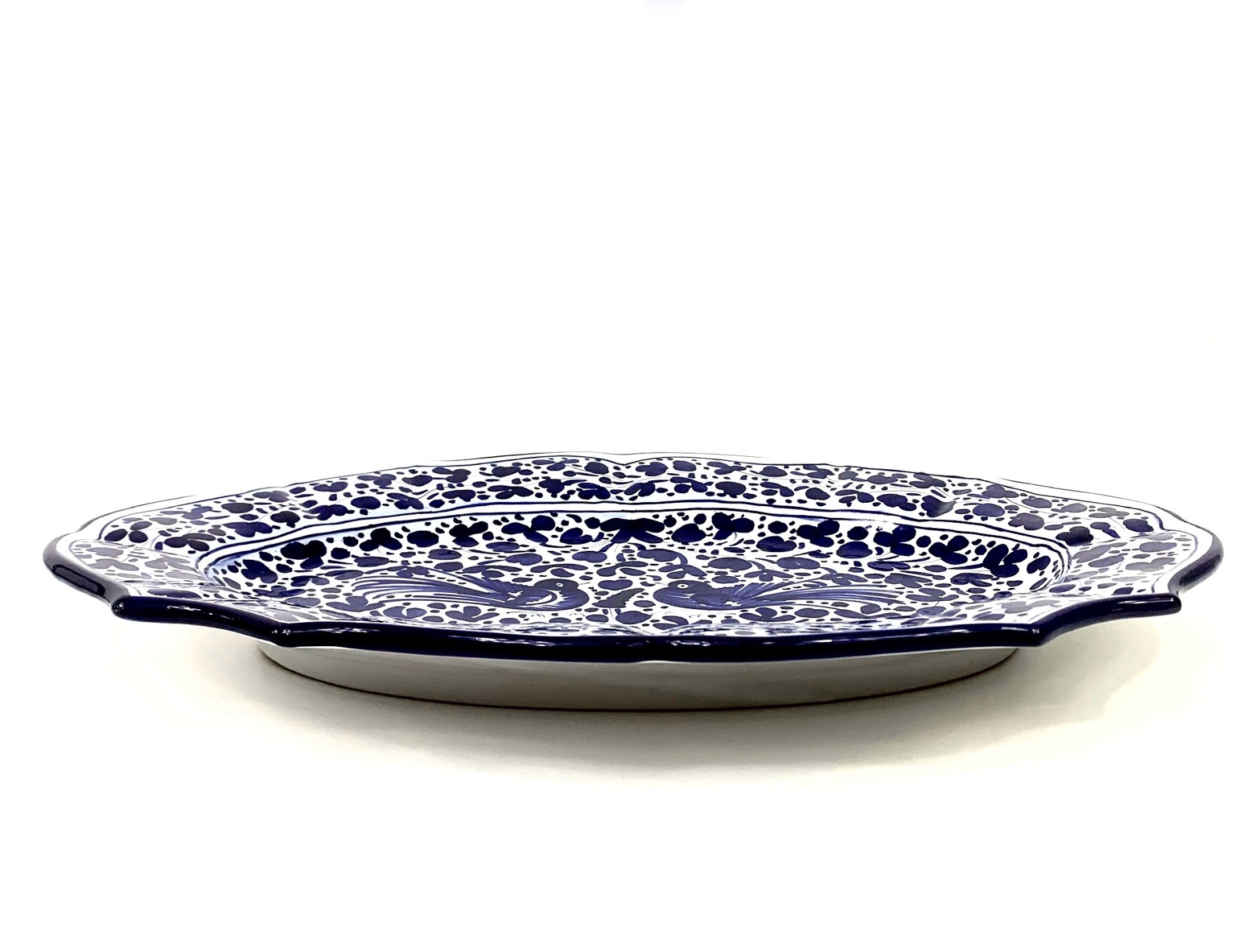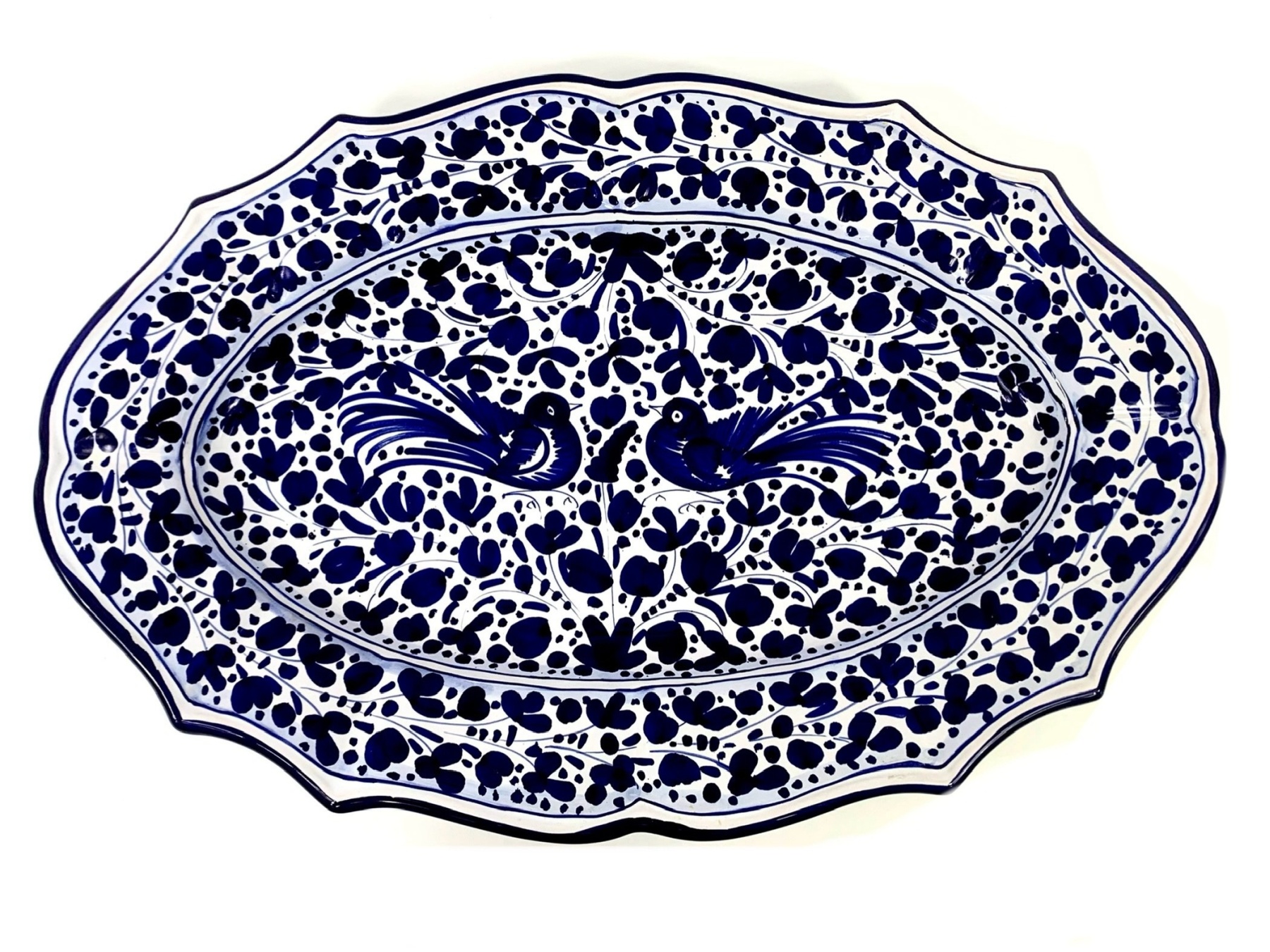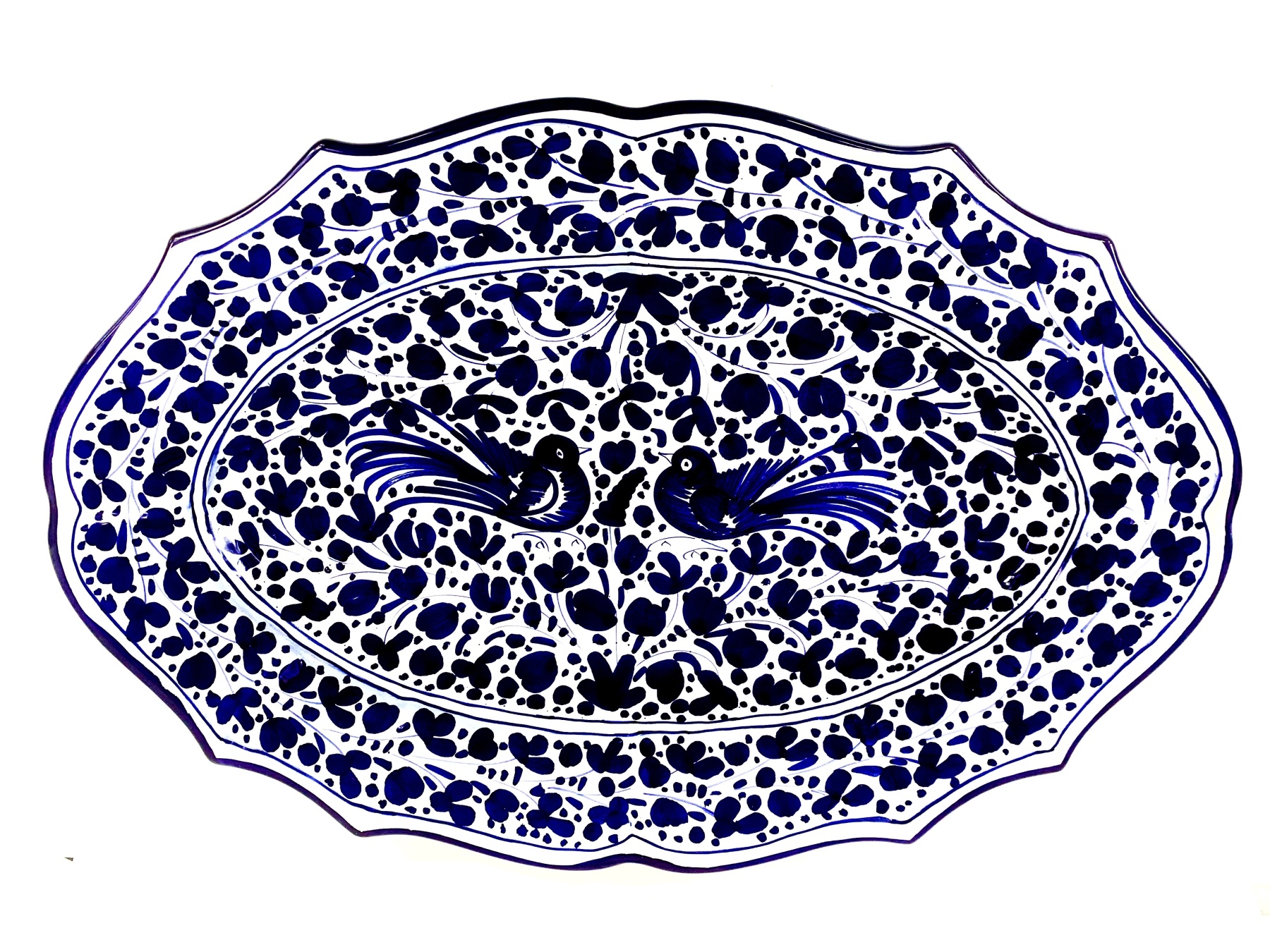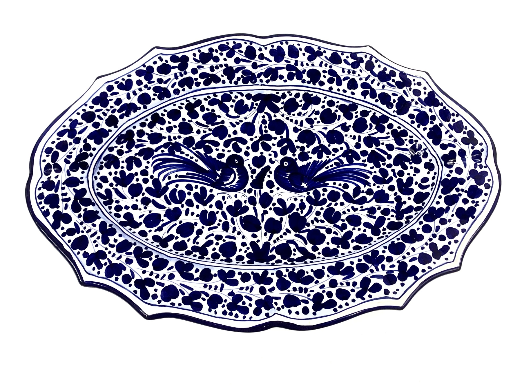 A large oval blue and white hand painted platter with scalloped rim, two birds on a white ground within a field of blue flowers with blue trim. The platter is hand-crafted in Italy by Deruta in the classic "Arabesco Blu" or "Love Birds" pattern.