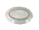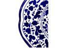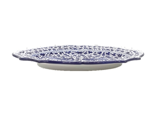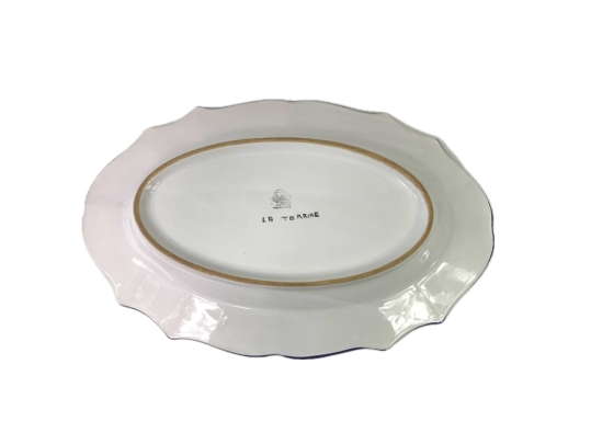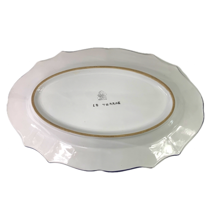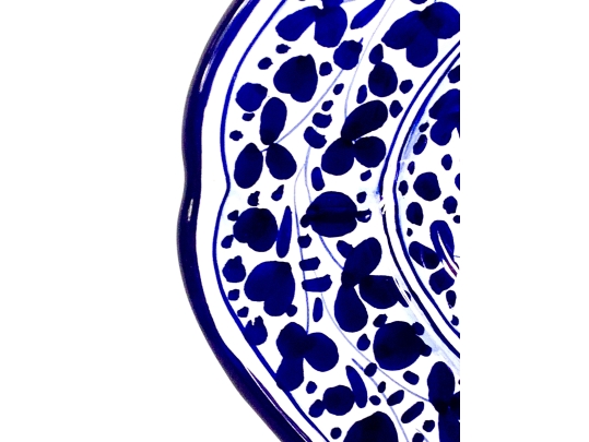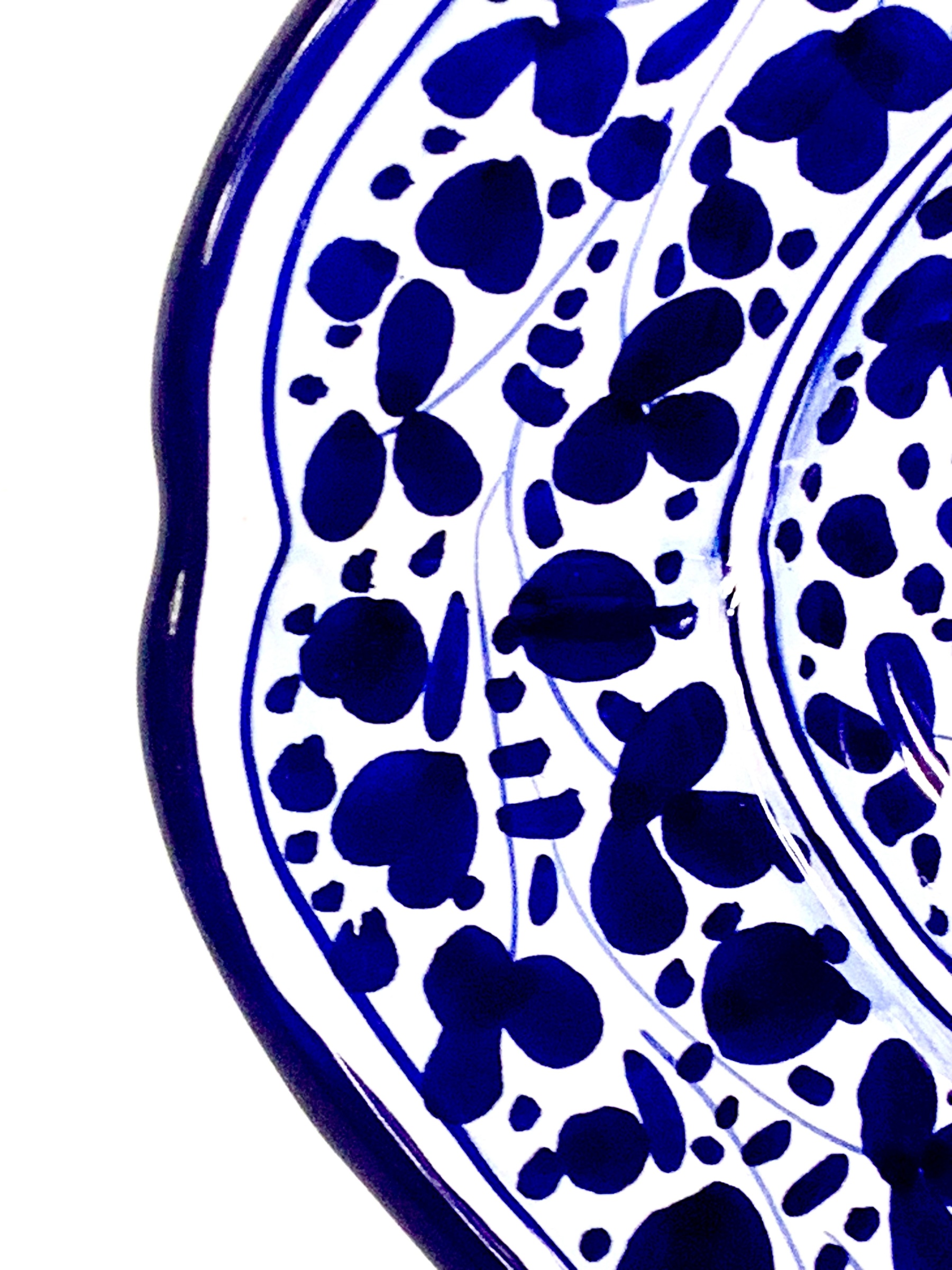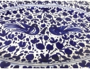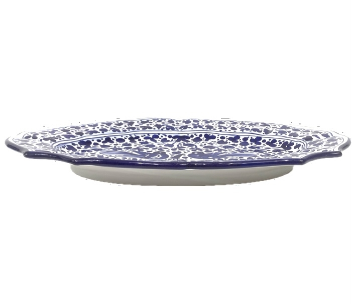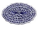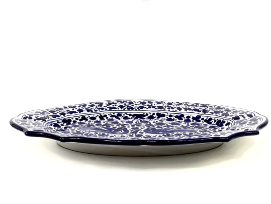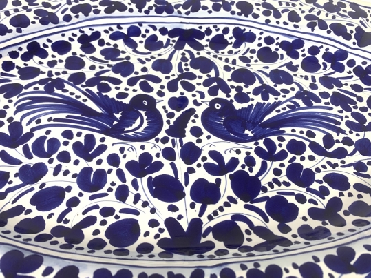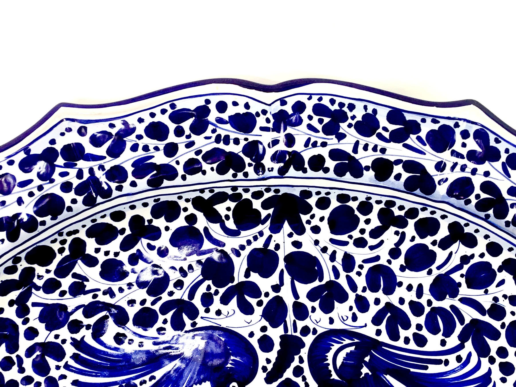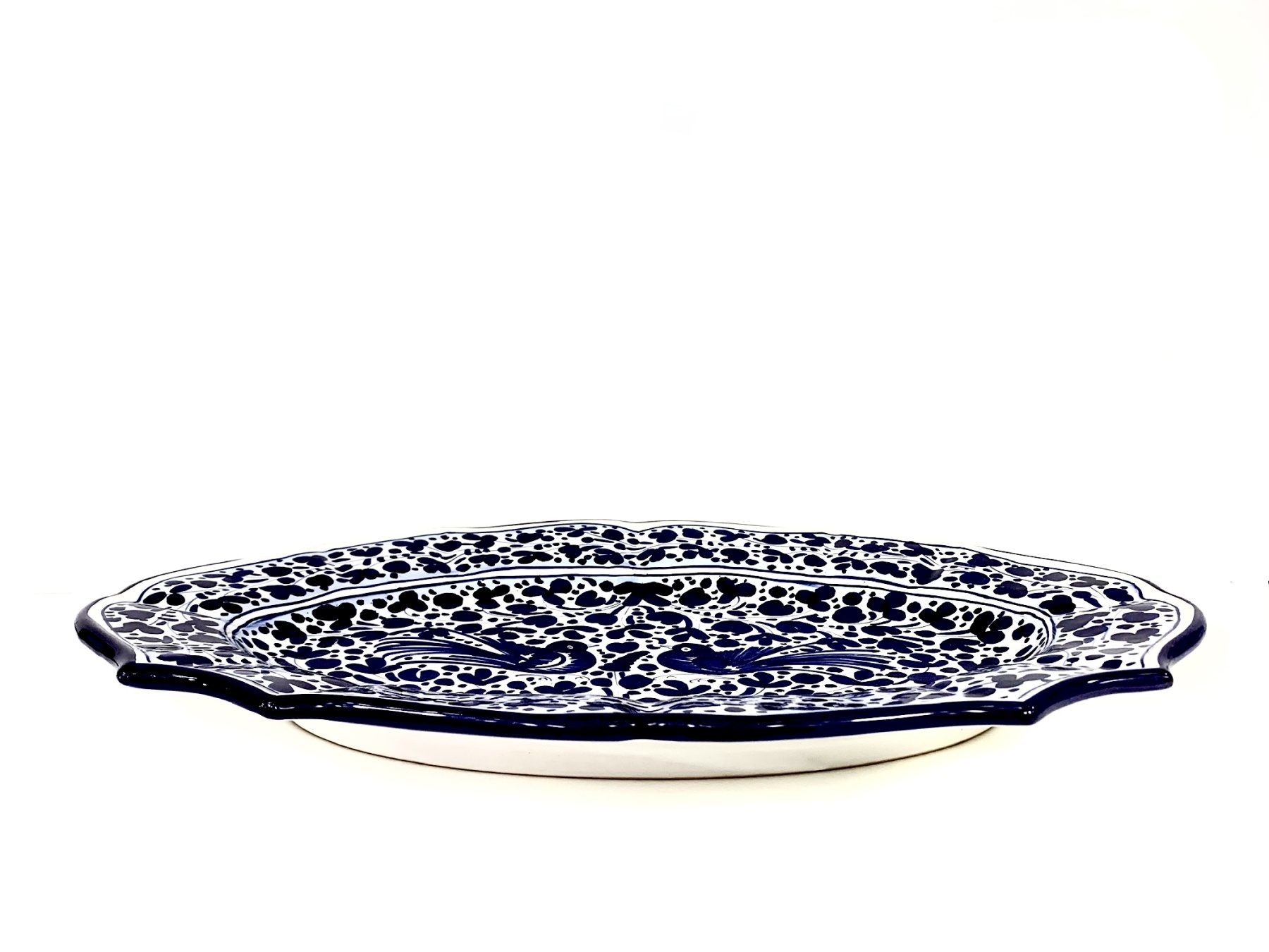 A large oval blue and white hand painted platter with scalloped rim, two birds on a white ground within a field of blue flowers with blue trim. The platter is hand-crafted in Italy by Deruta in the classic "Arabesco Blu" or "Love Birds" pattern.