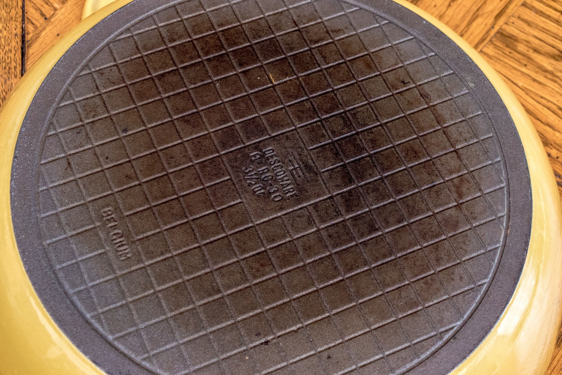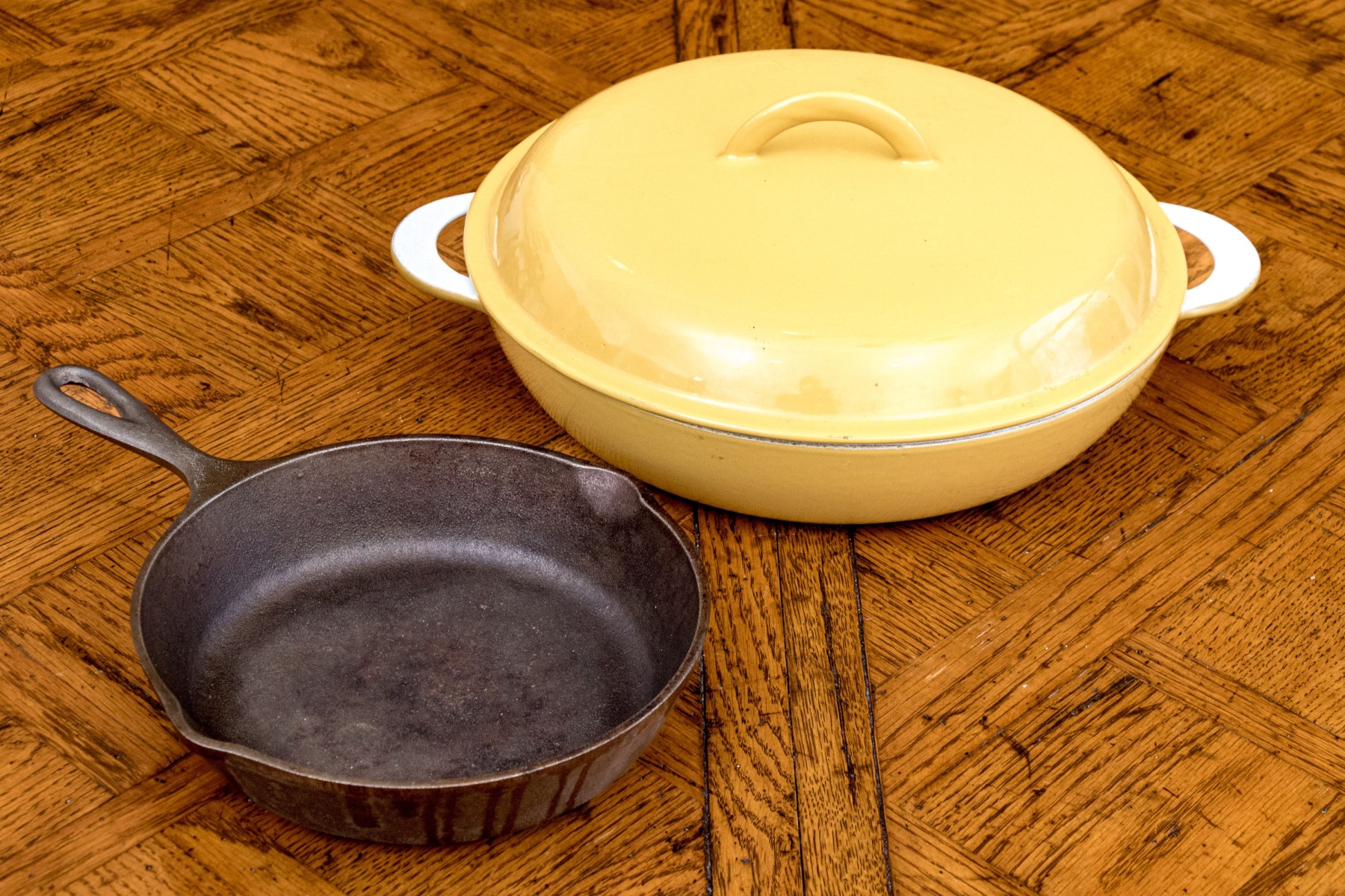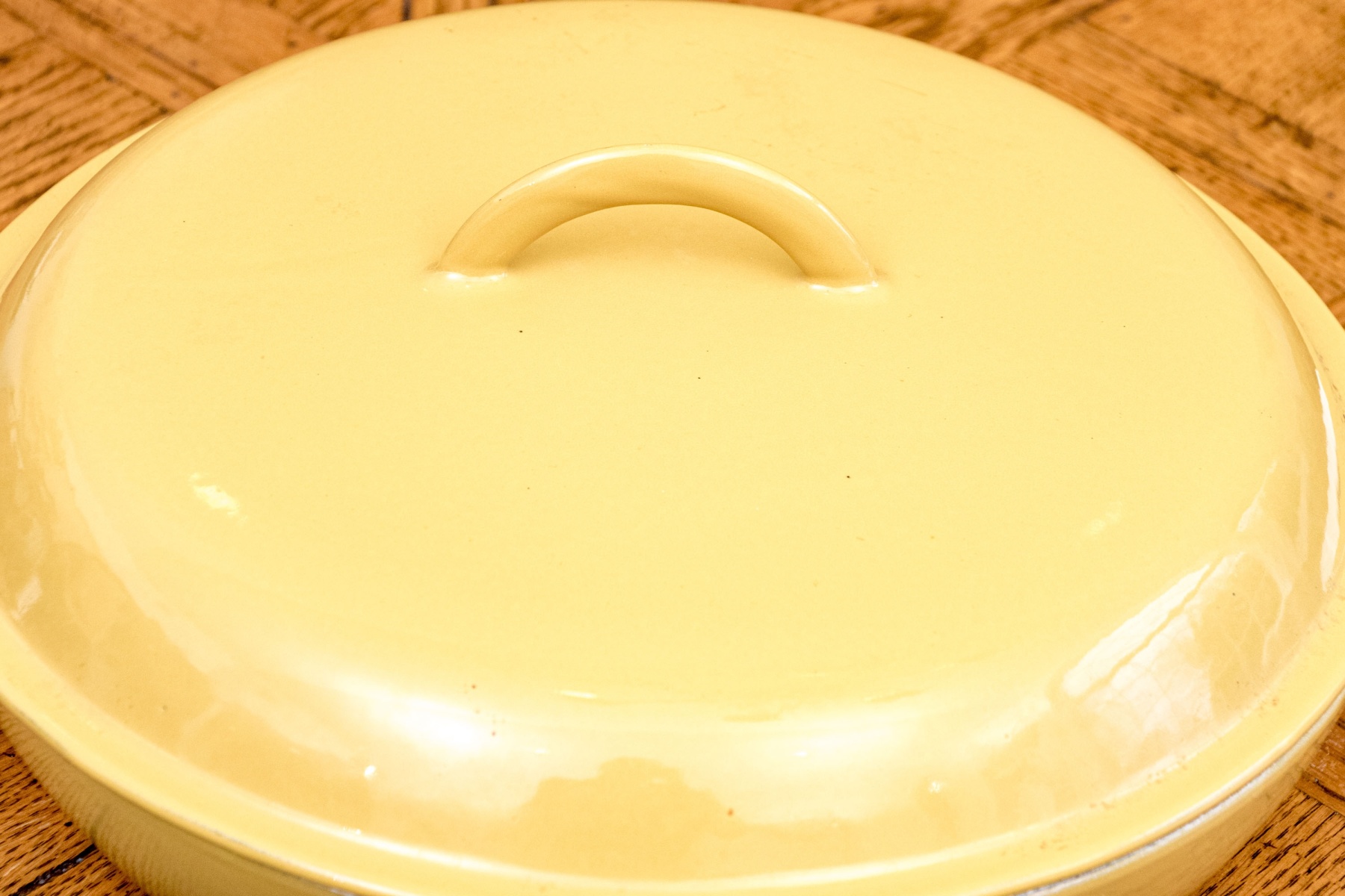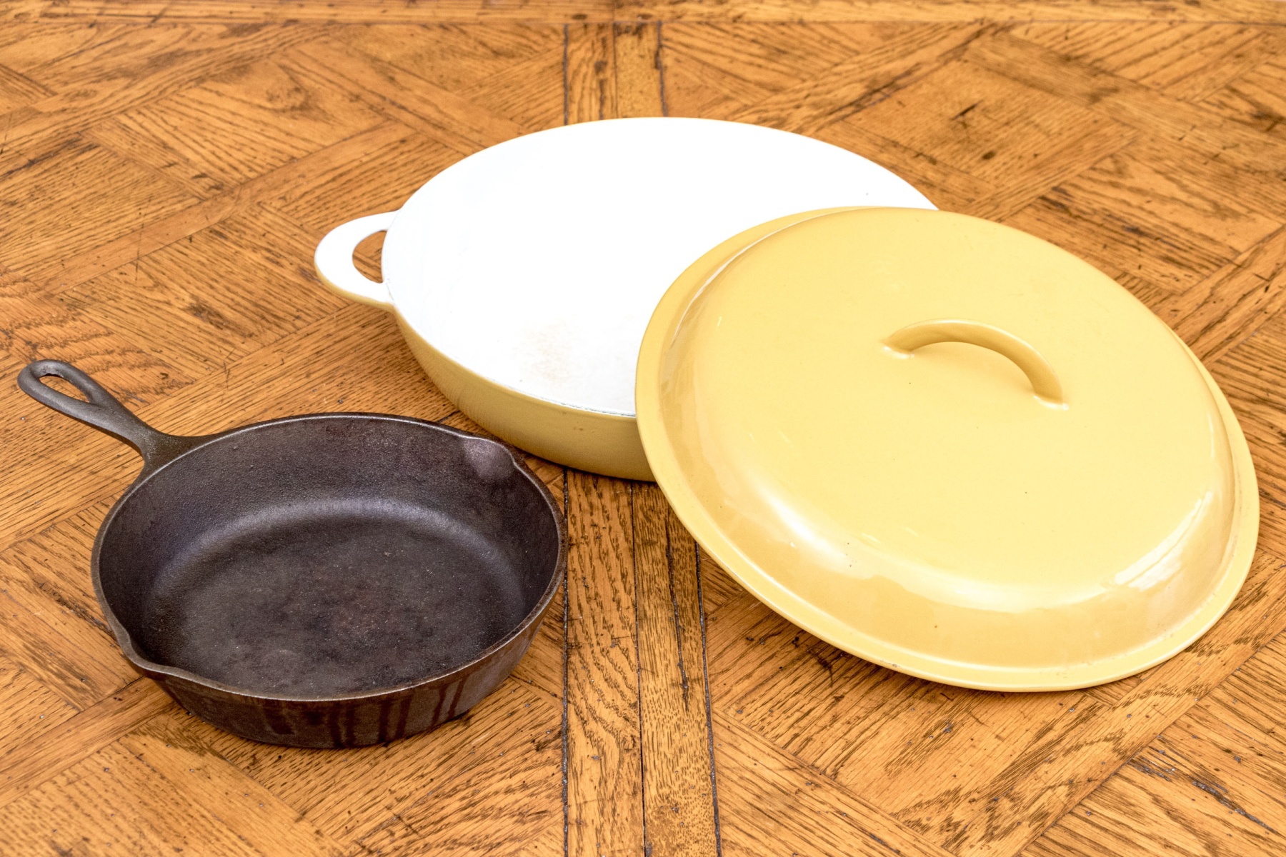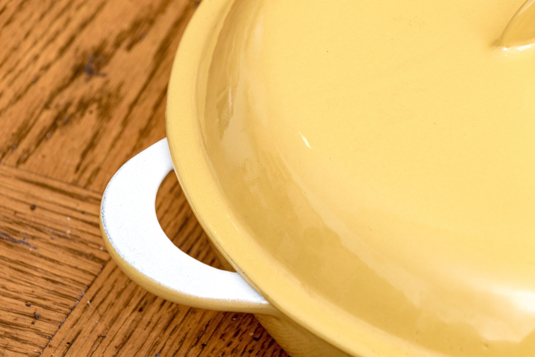 A fabulous duo of cookware including a yellow and white enameled Descoware lidded casserole and a vintage Lodge cast iron skillet with a pierced handle and double spout design.