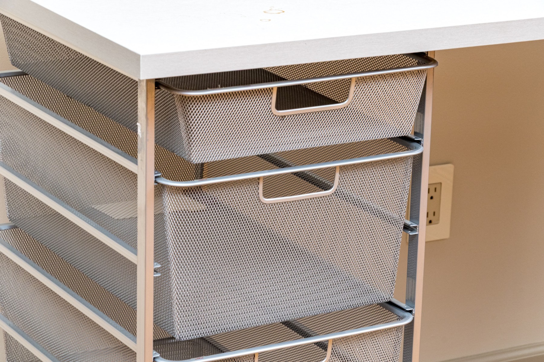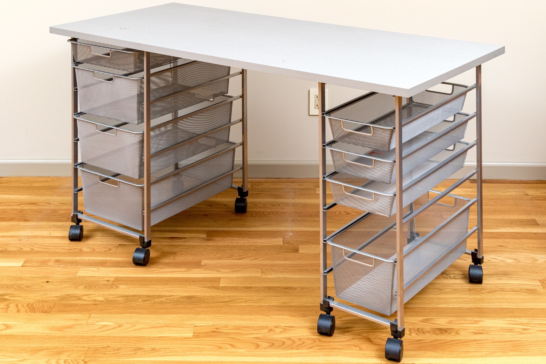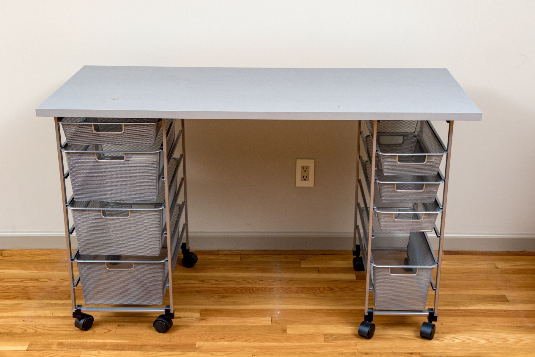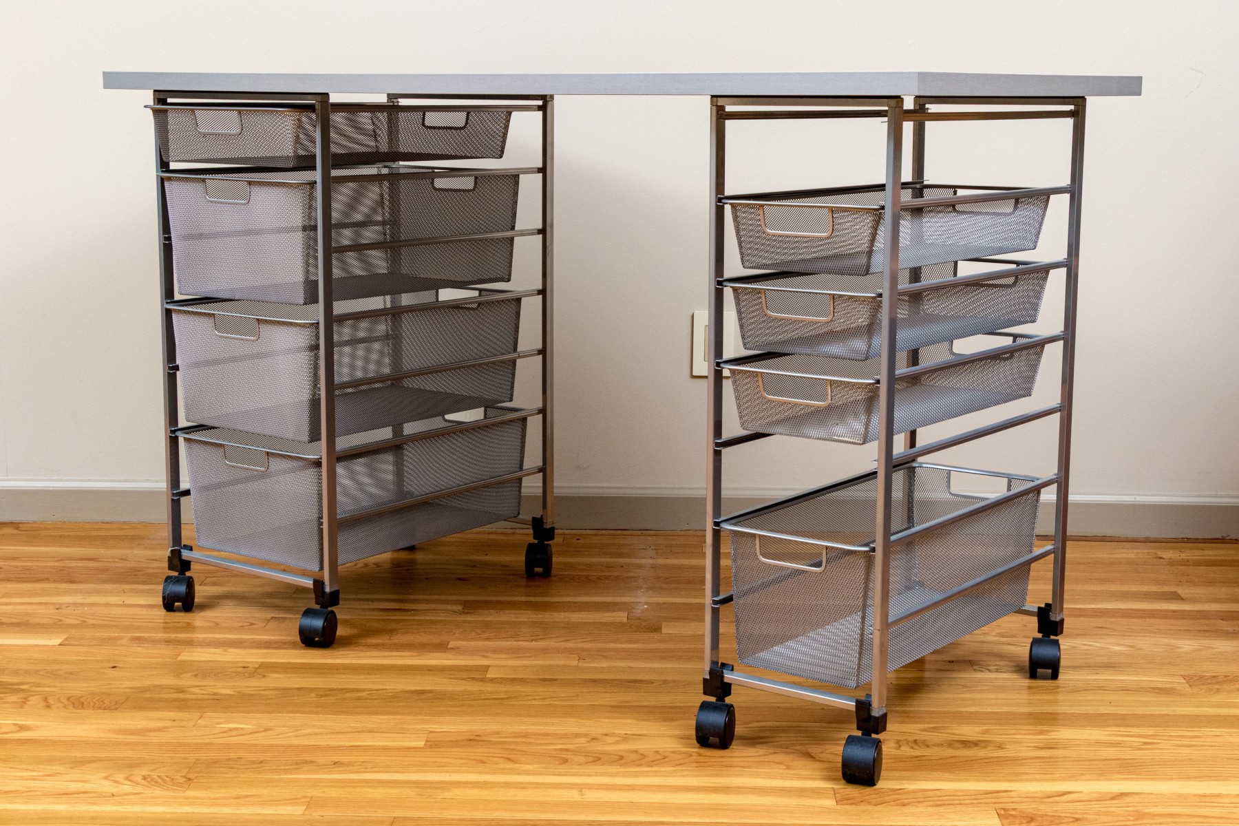 A handy utilitarian work table with a minimalist gray metal rectangular top over a kneehole arrangement of eight wire mesh drawers with integrated handles. raised over large black casters for easy mobility.