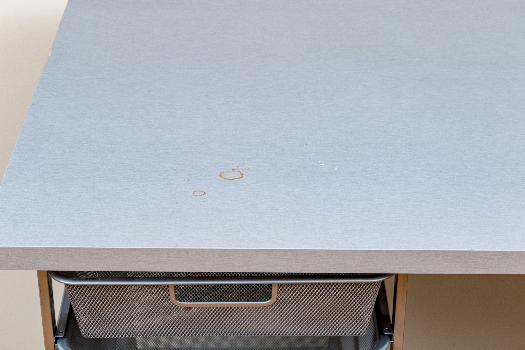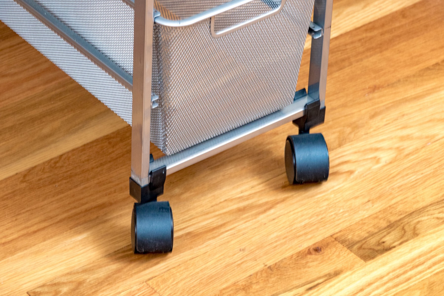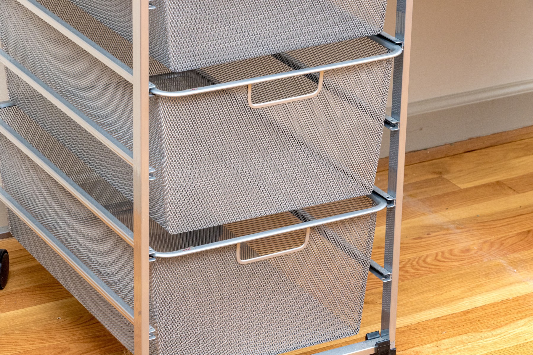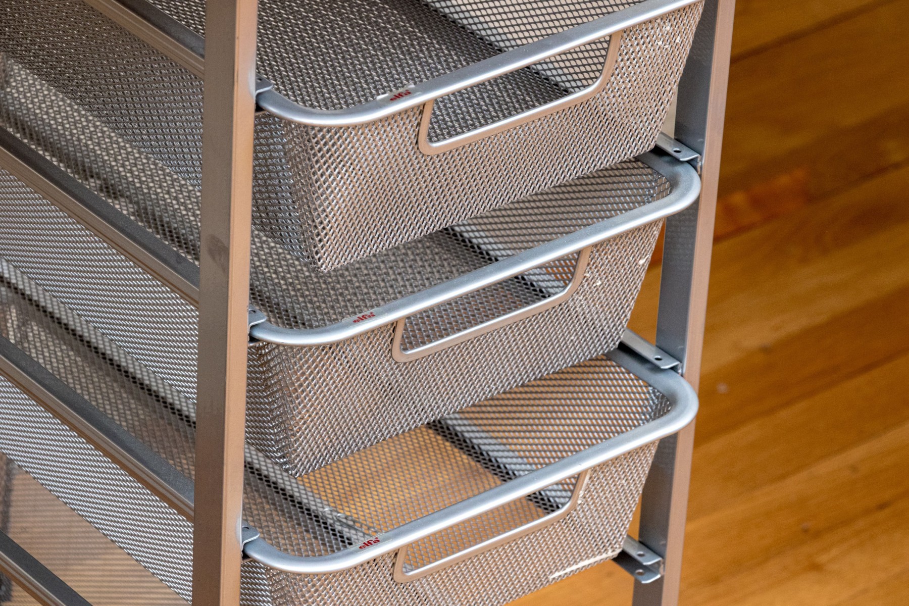 A handy utilitarian work table with a minimalist gray metal rectangular top over a kneehole arrangement of eight wire mesh drawers with integrated handles. raised over large black casters for easy mobility.