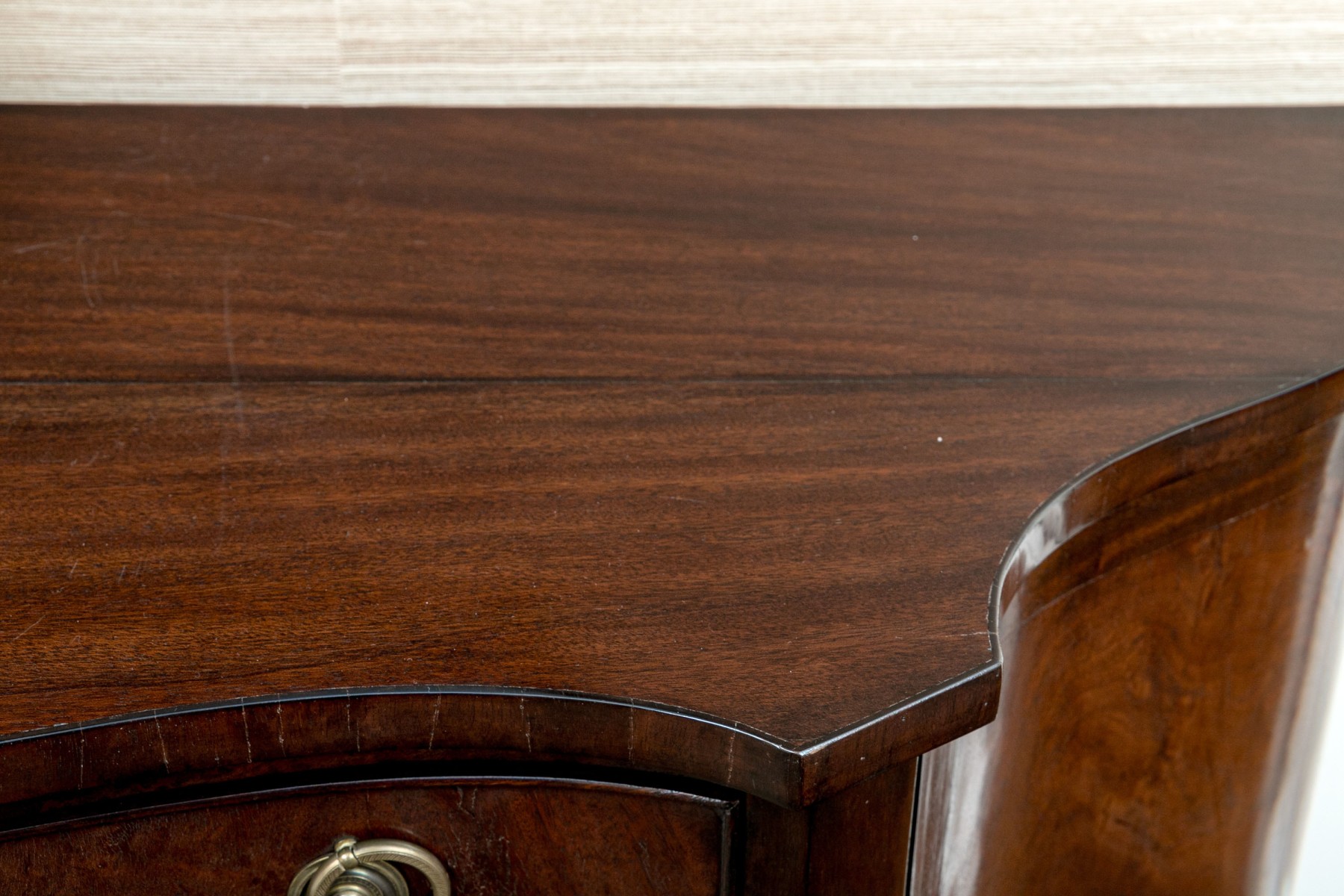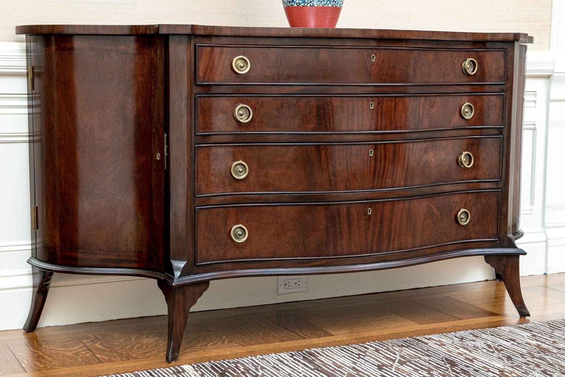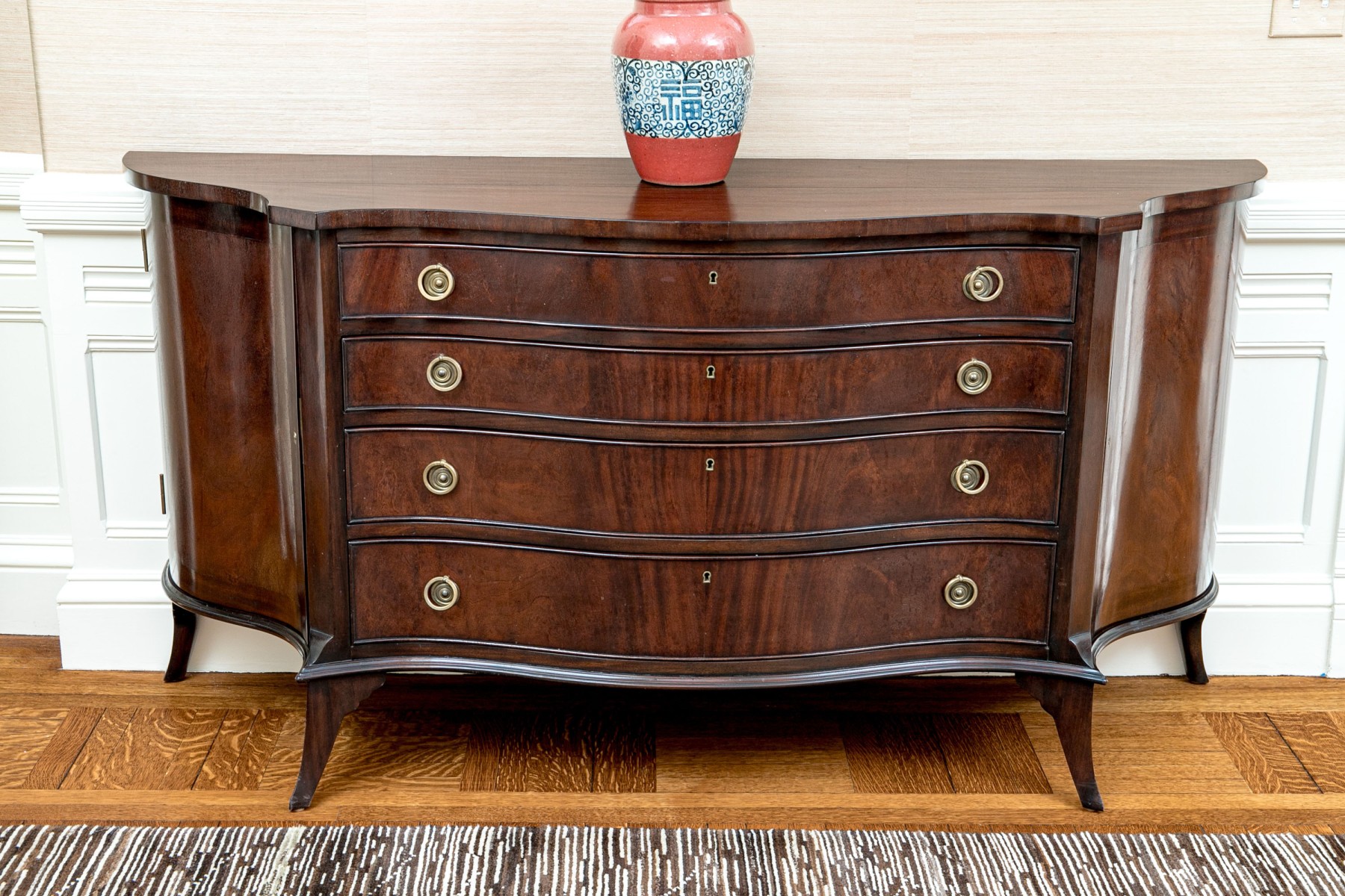 Stunning and in very good condition. Mahogany/crotch mahogany flame veneers; curved bombe front. Four expansive drawers; double oiled brass pulls and key holes for locking. Original purchase price +$18,000.