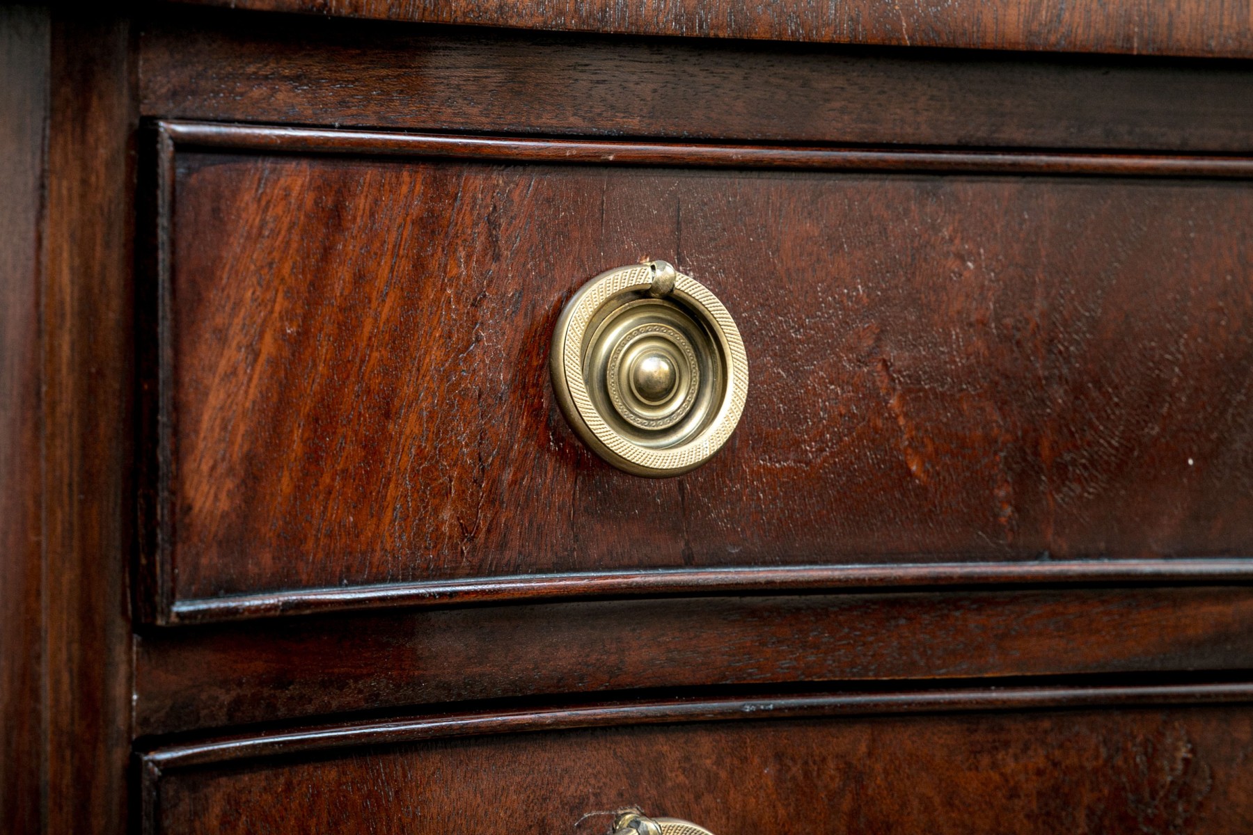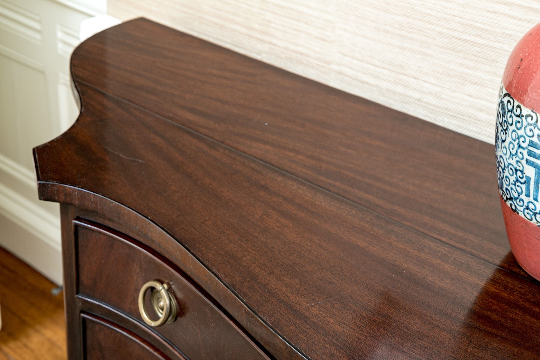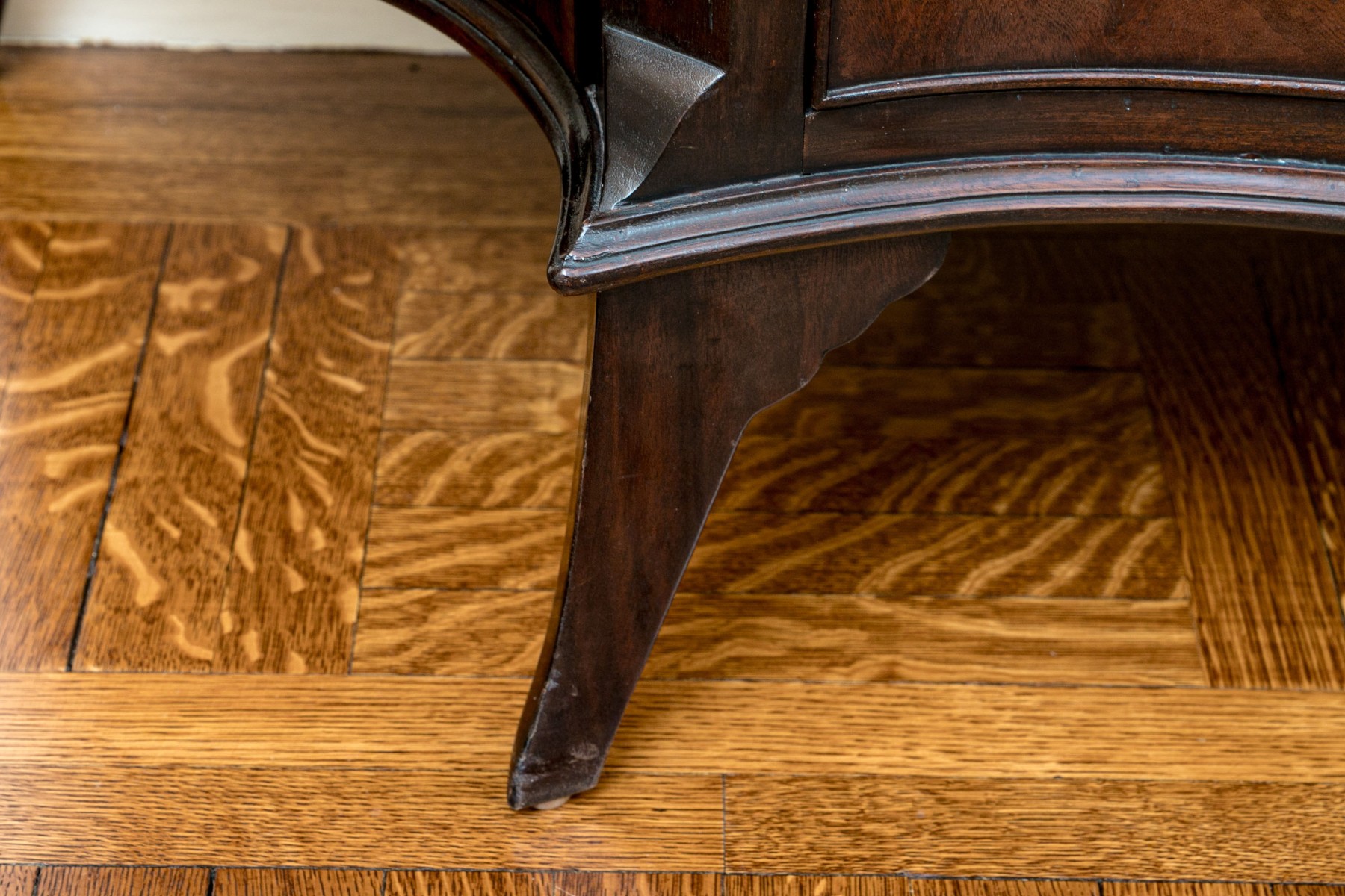 Stunning and in very good condition. Mahogany/crotch mahogany flame veneers; curved bombe front. Four expansive drawers; double oiled brass pulls and key holes for locking. Original purchase price +$18,000.