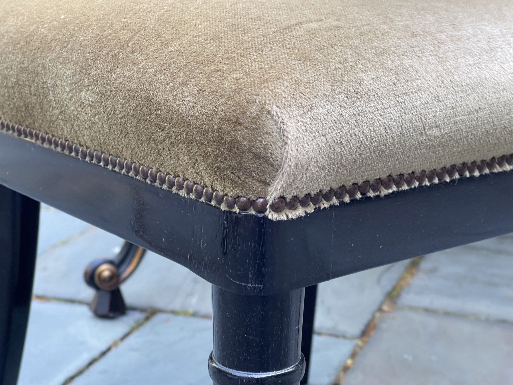 Wool and silk mohair velvet. Petite nailhead trim and exposed wood legs. Original purchase price $3,800