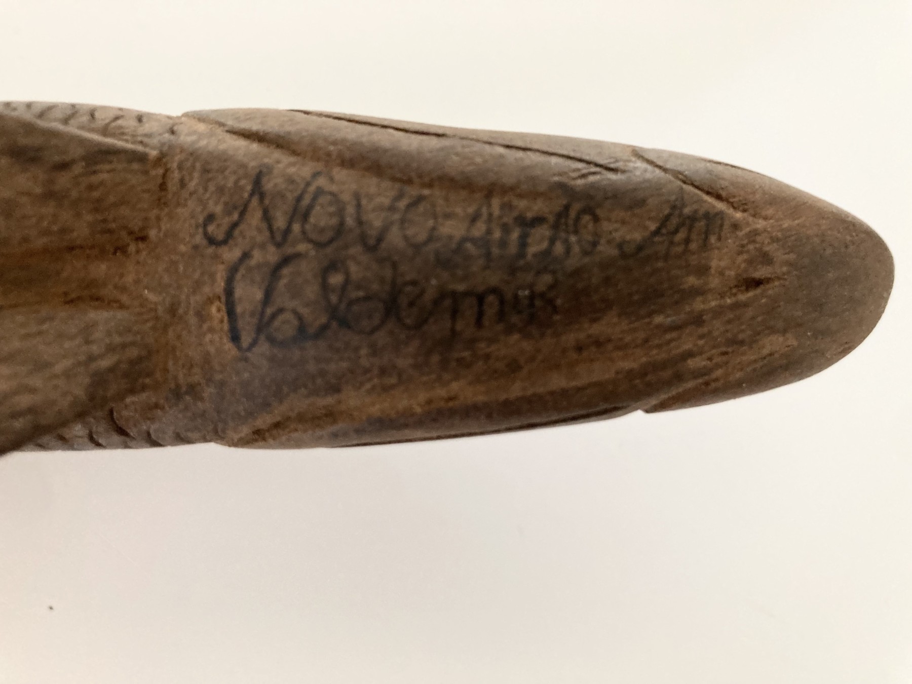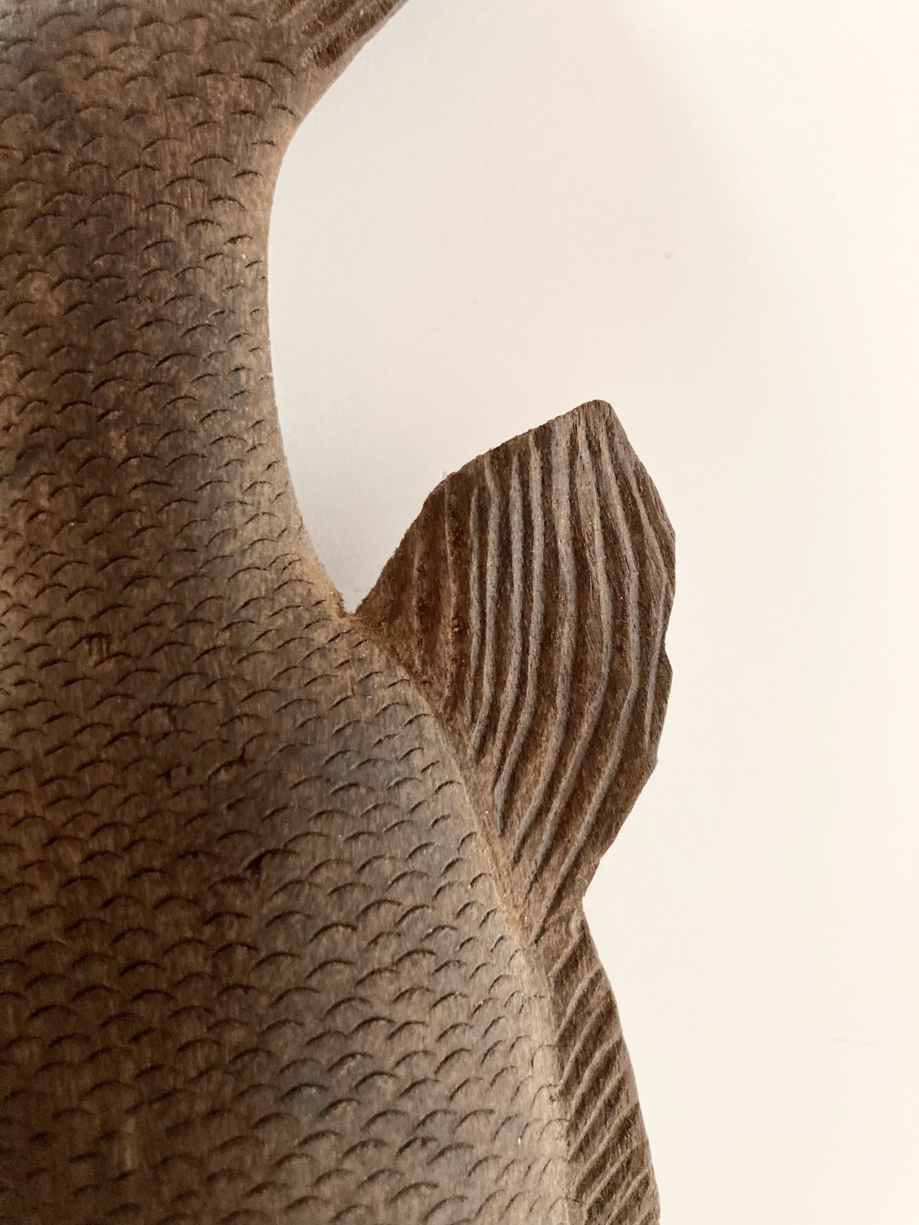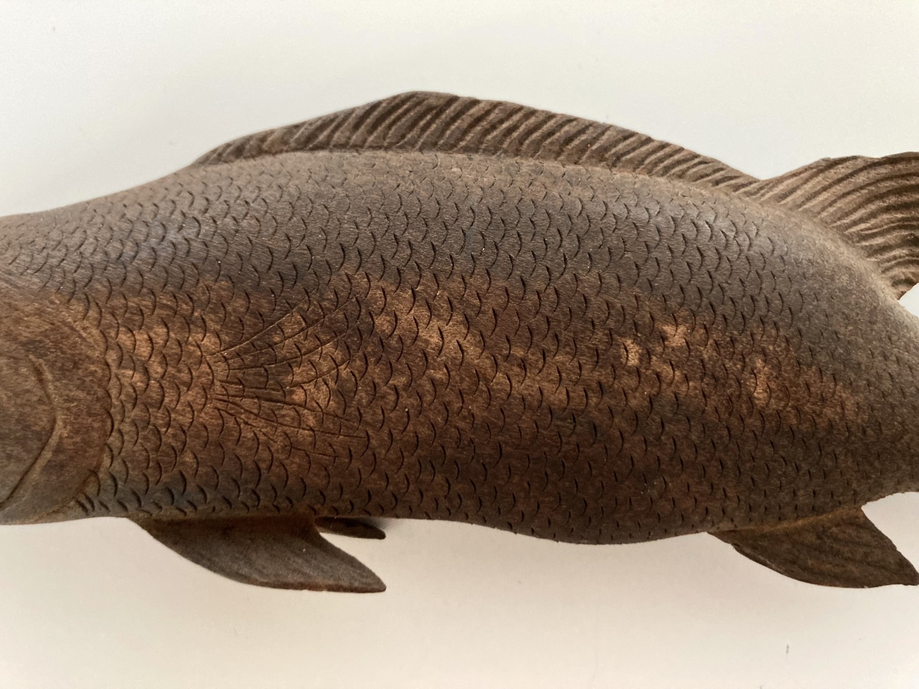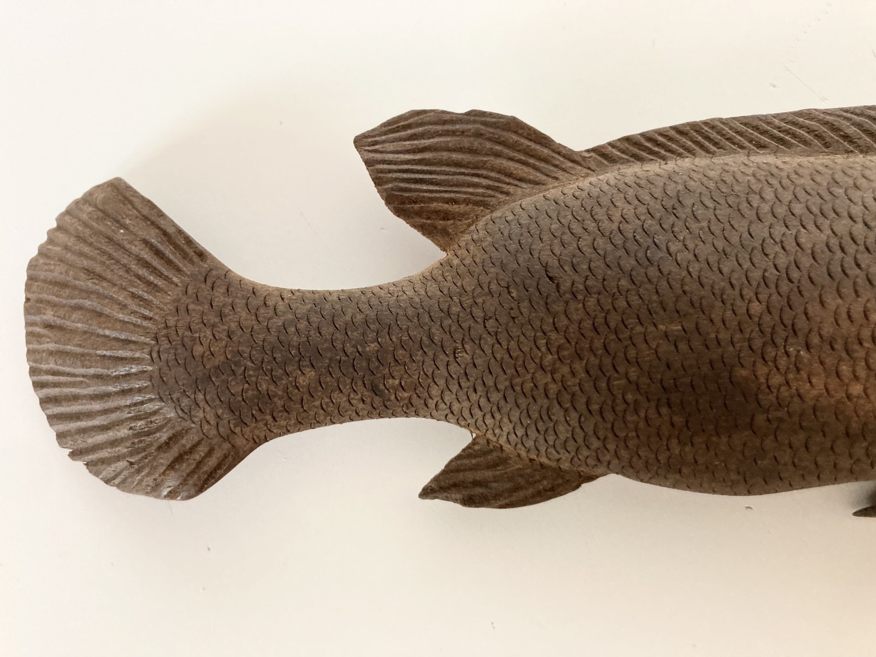A finely crafted Wood Fish Sculpture with fine detail. Deftly carved in a dark and deep Walnut tone wood, there are hundreds of individual scales and the attention to detail is fine. Possibly Russian in origin with a presumed town name written under the jaw.