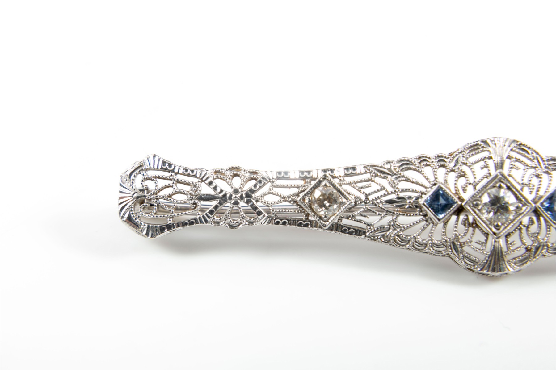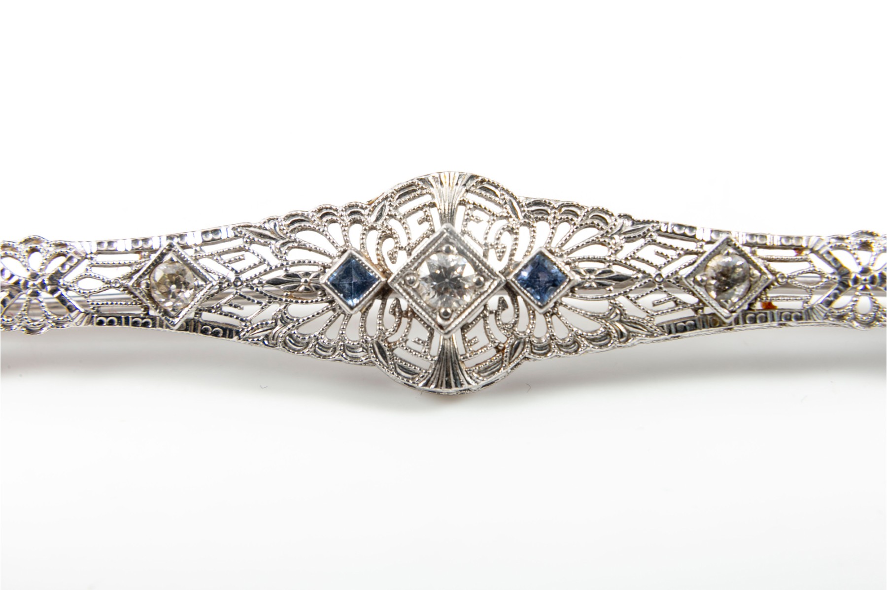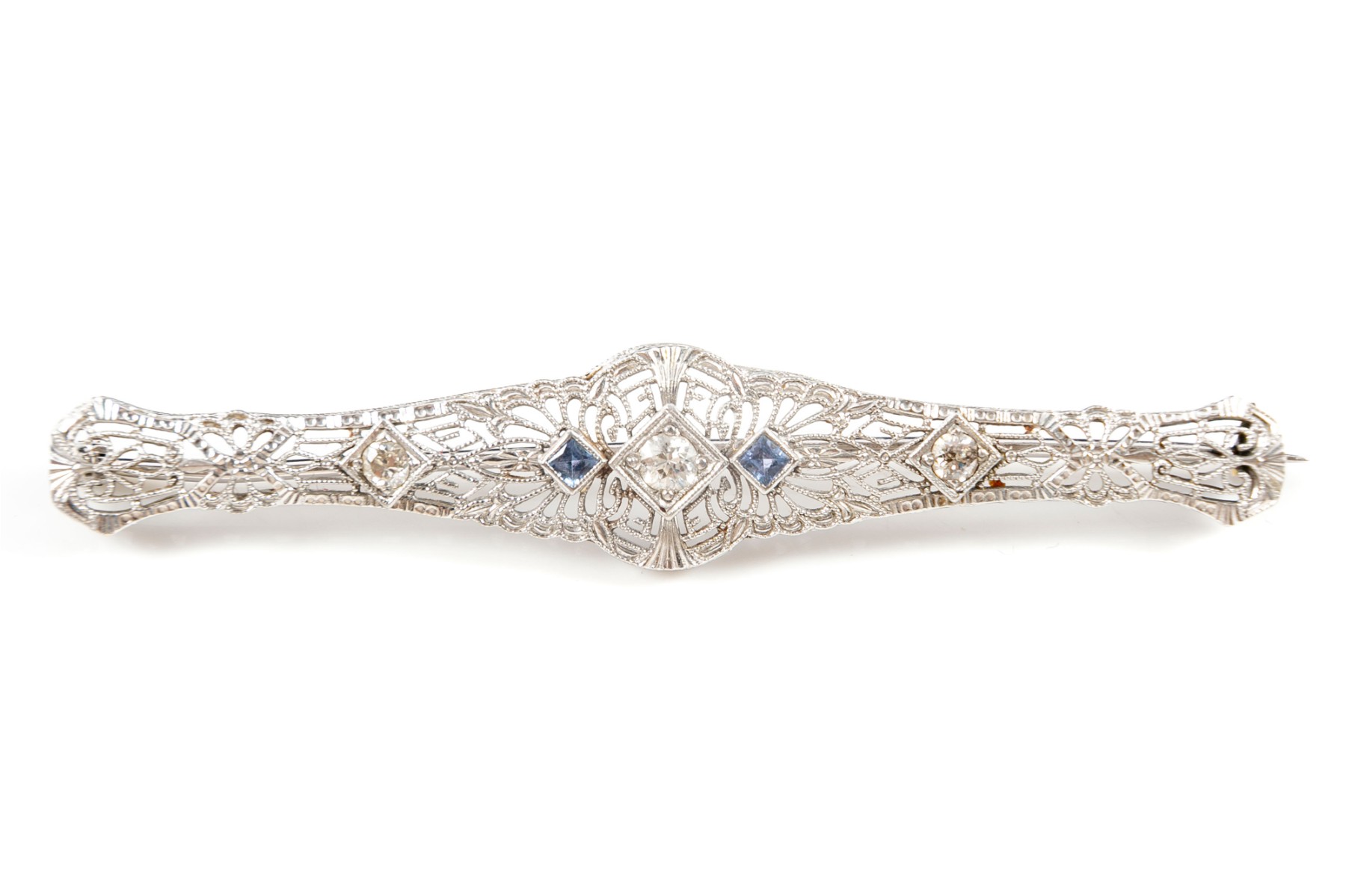 A metal, Art Nouveau style lattice brooch pin embellished with three round-cut diamonds and two sapphires.