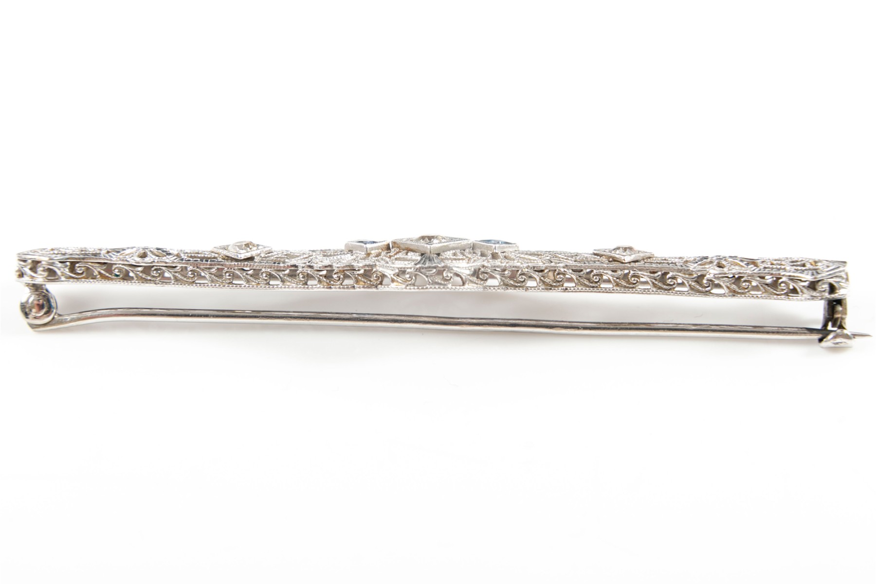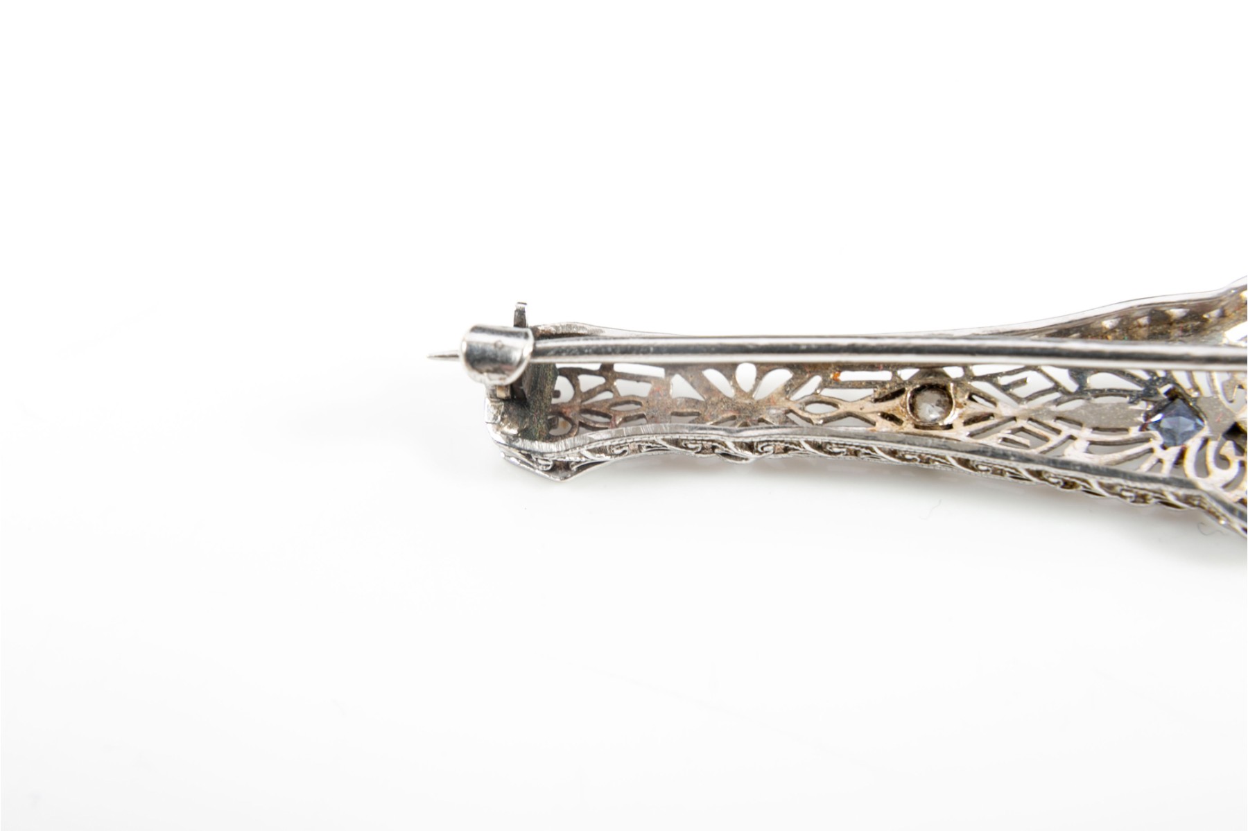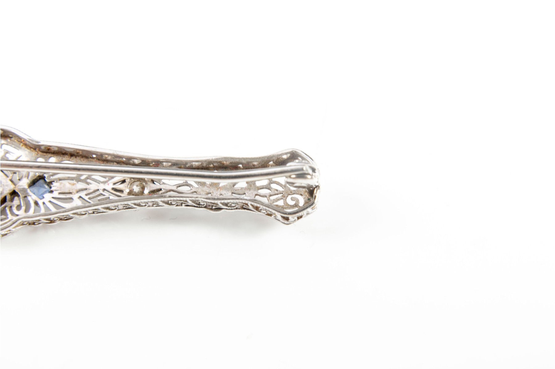 A metal, Art Nouveau style lattice brooch pin embellished with three round-cut diamonds and two sapphires.