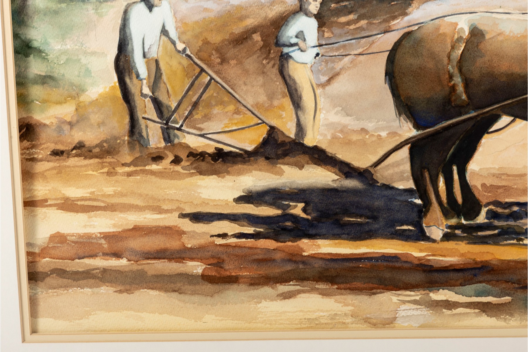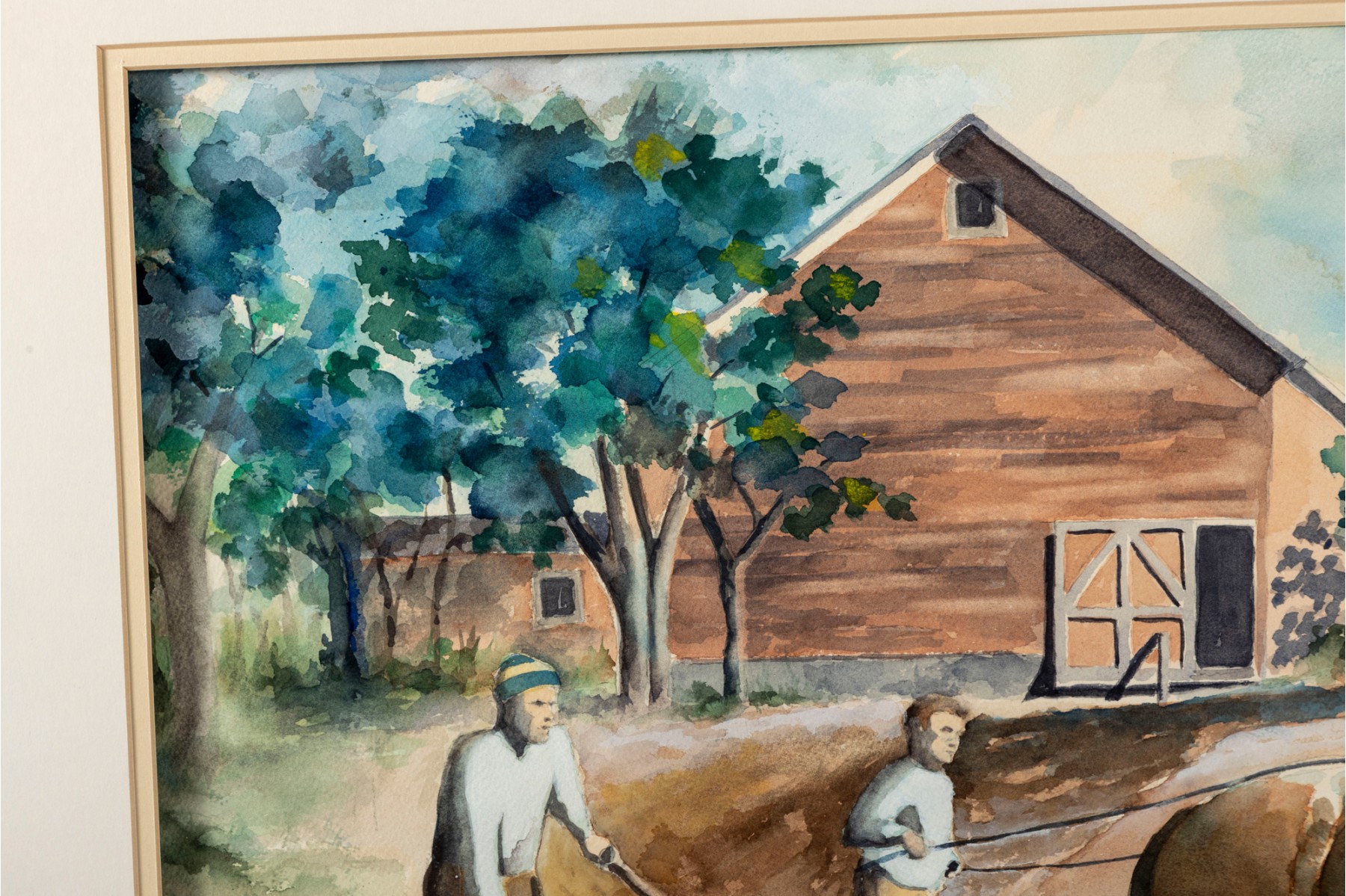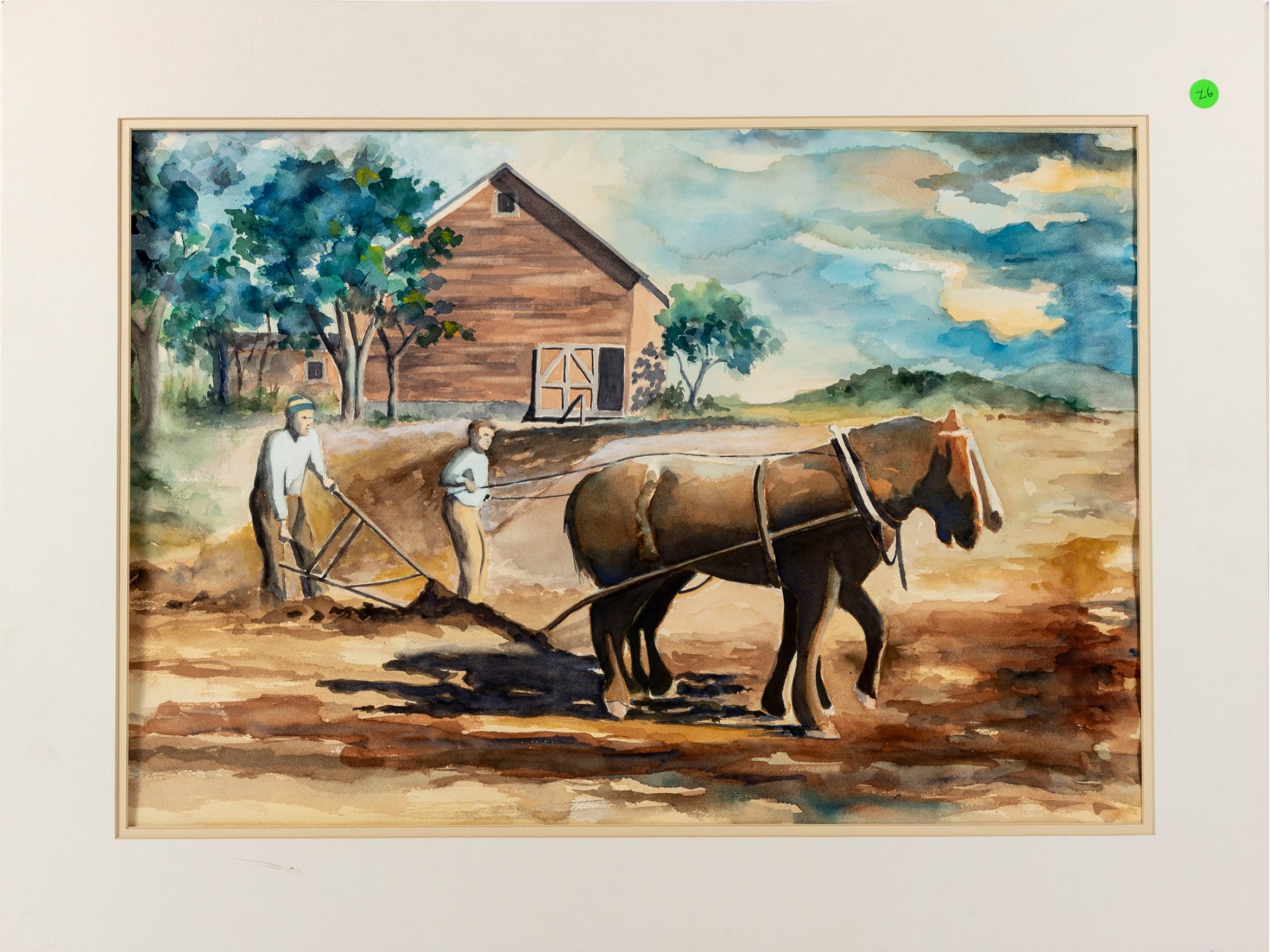 Dick Wayne (1931 - 20123) was an artist local to Raleigh, North Carolina who specialized in acrylic and watercolor art. This particular example - untitled, depicts a rural horse plowing scene in watercolor, presented openly within a mat borders, unframed.