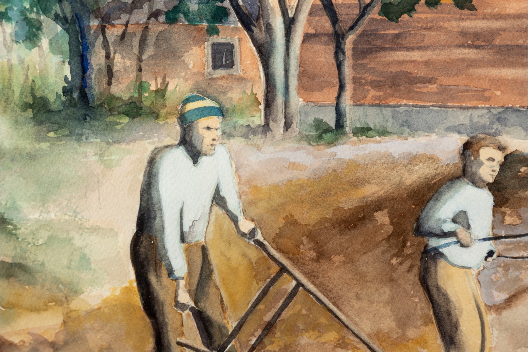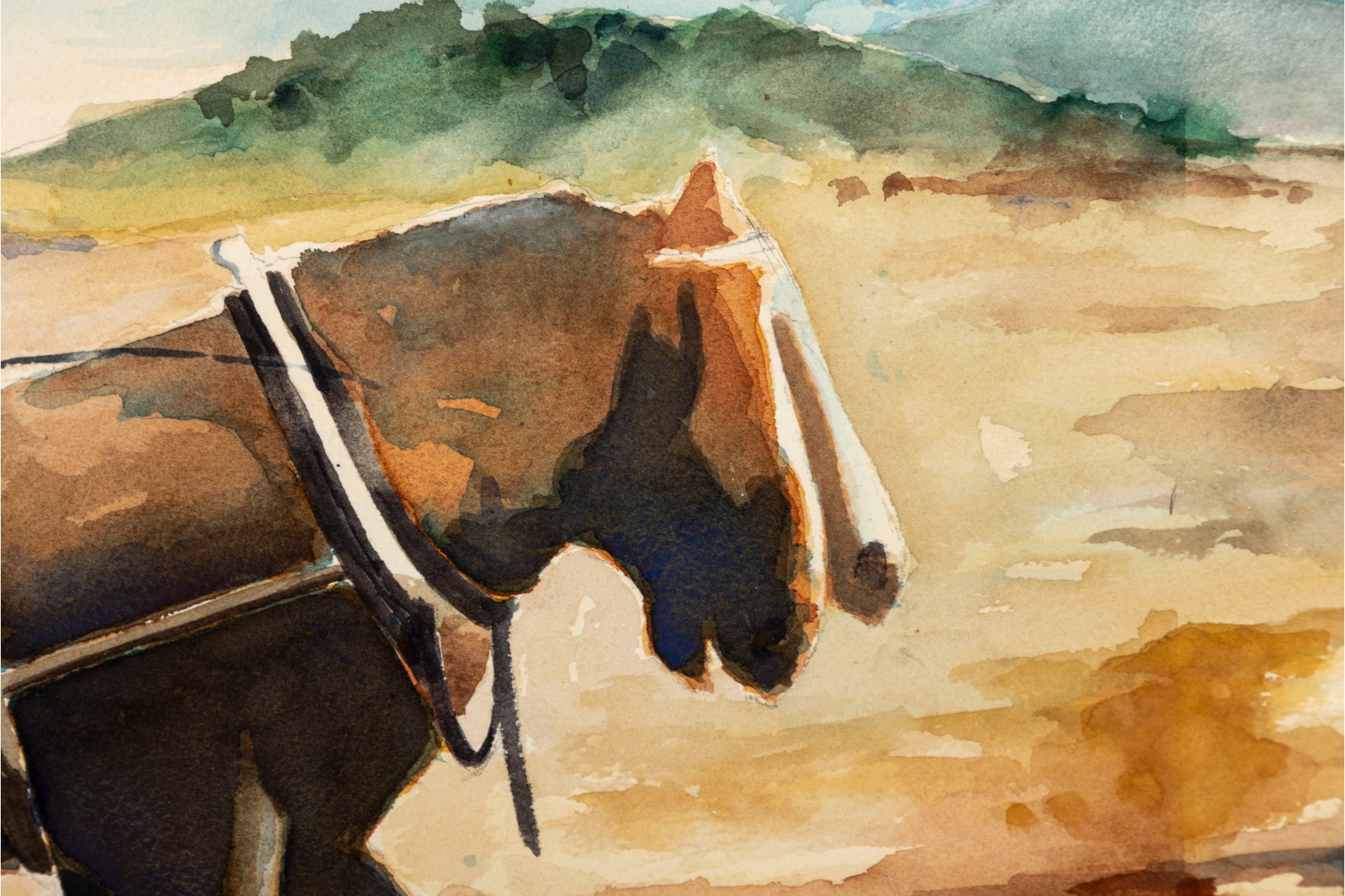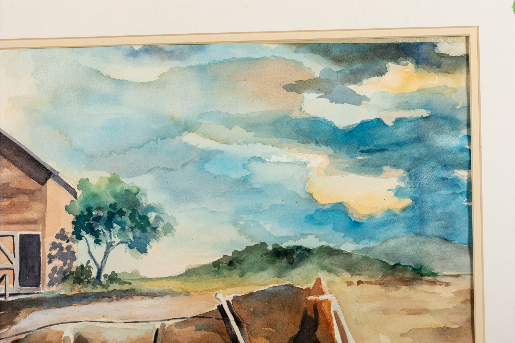 Dick Wayne (1931 - 20123) was an artist local to Raleigh, North Carolina who specialized in acrylic and watercolor art. This particular example - untitled, depicts a rural horse plowing scene in watercolor, presented openly within a mat borders, unframed.