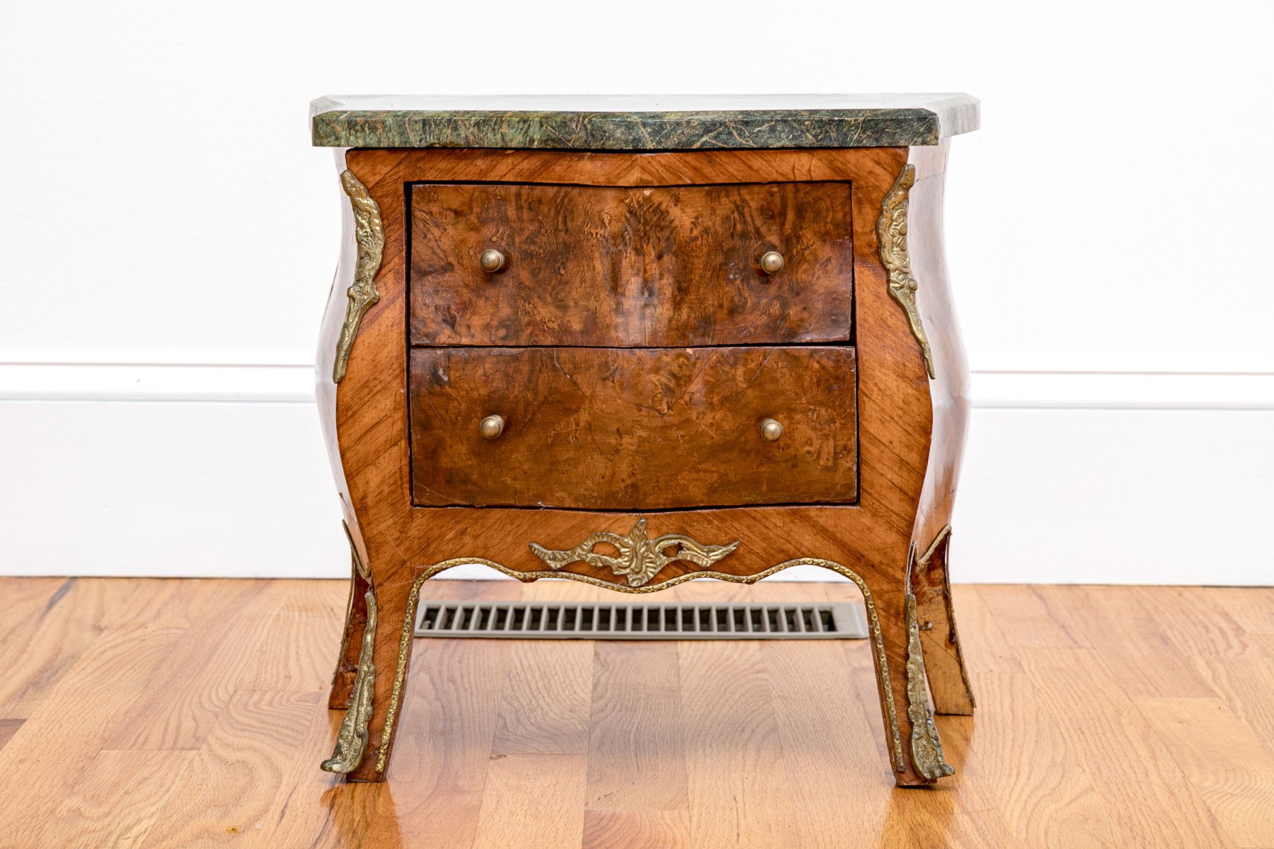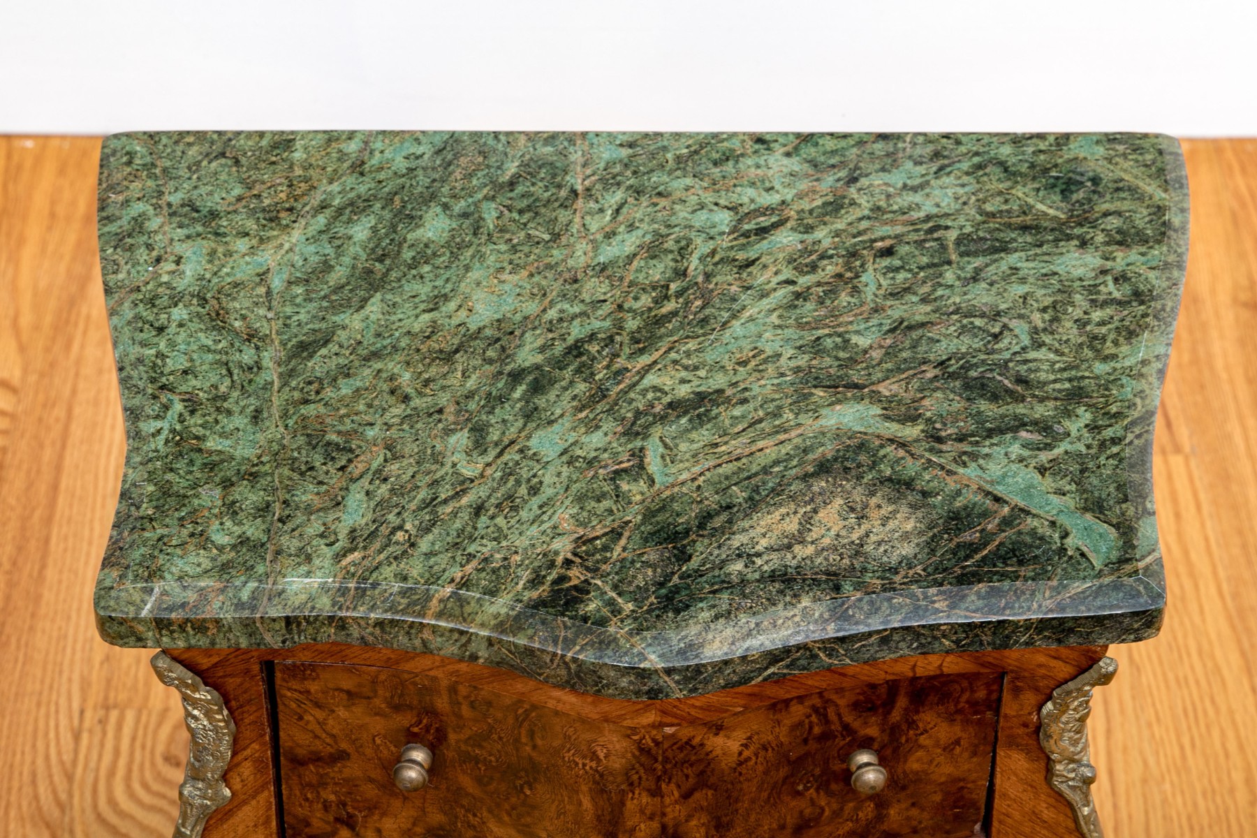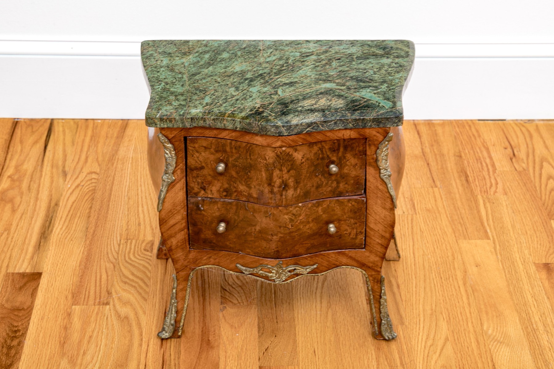Diminutive antique french jewelry cabinet with two drawers, brass mounts, trim and pulls and covered with a conforming green marble top.