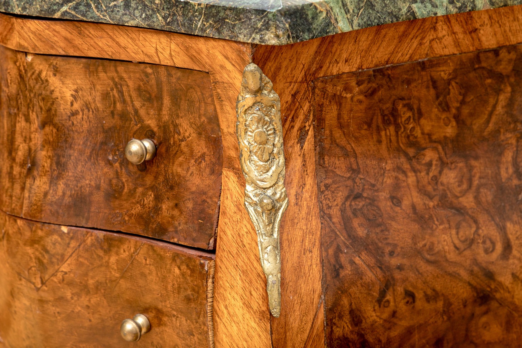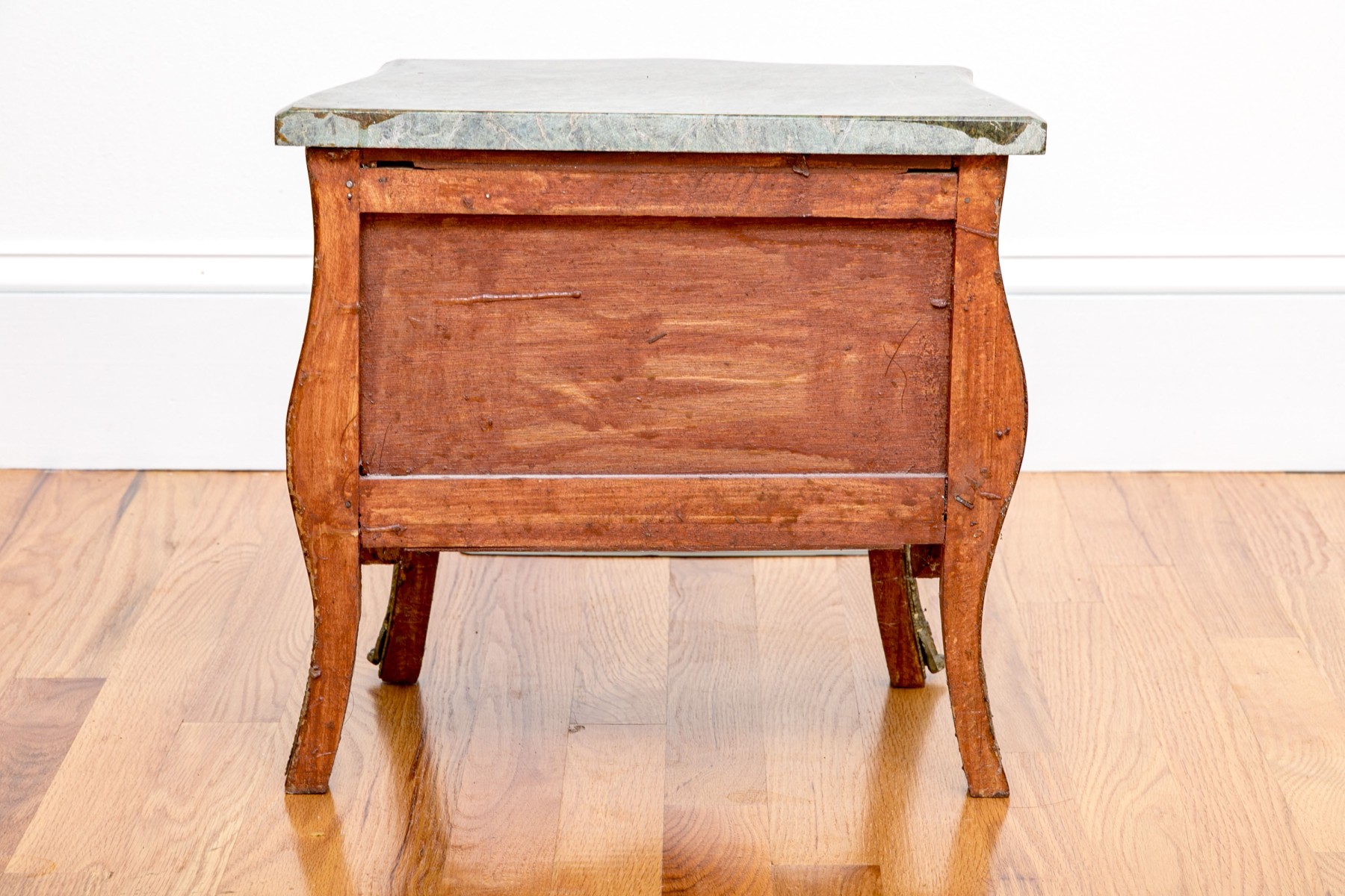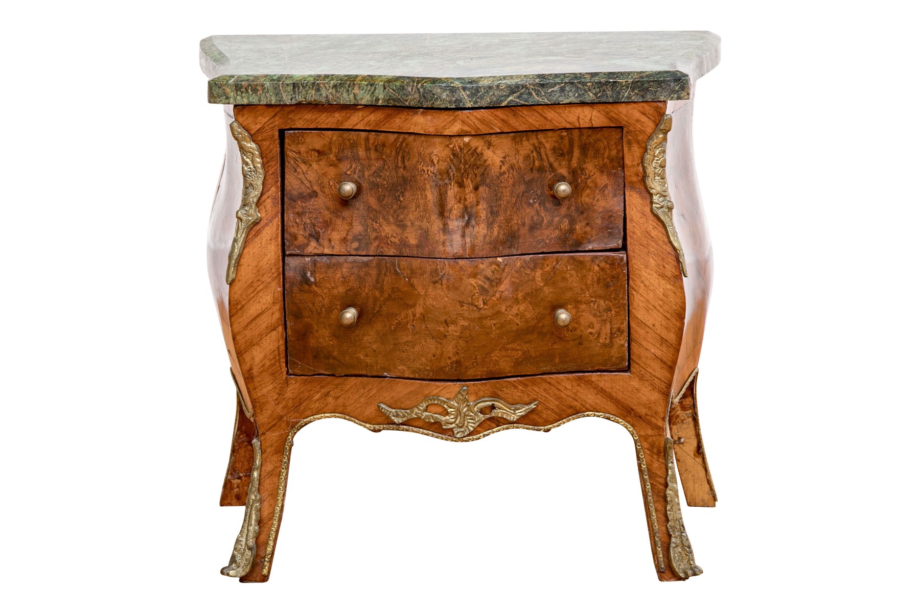 Diminutive antique french jewelry cabinet with two drawers, brass mounts, trim and pulls and covered with a conforming green marble top.