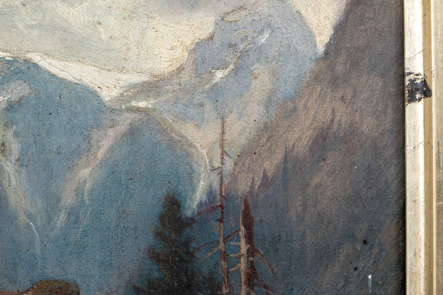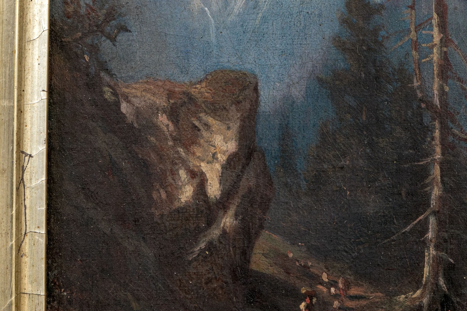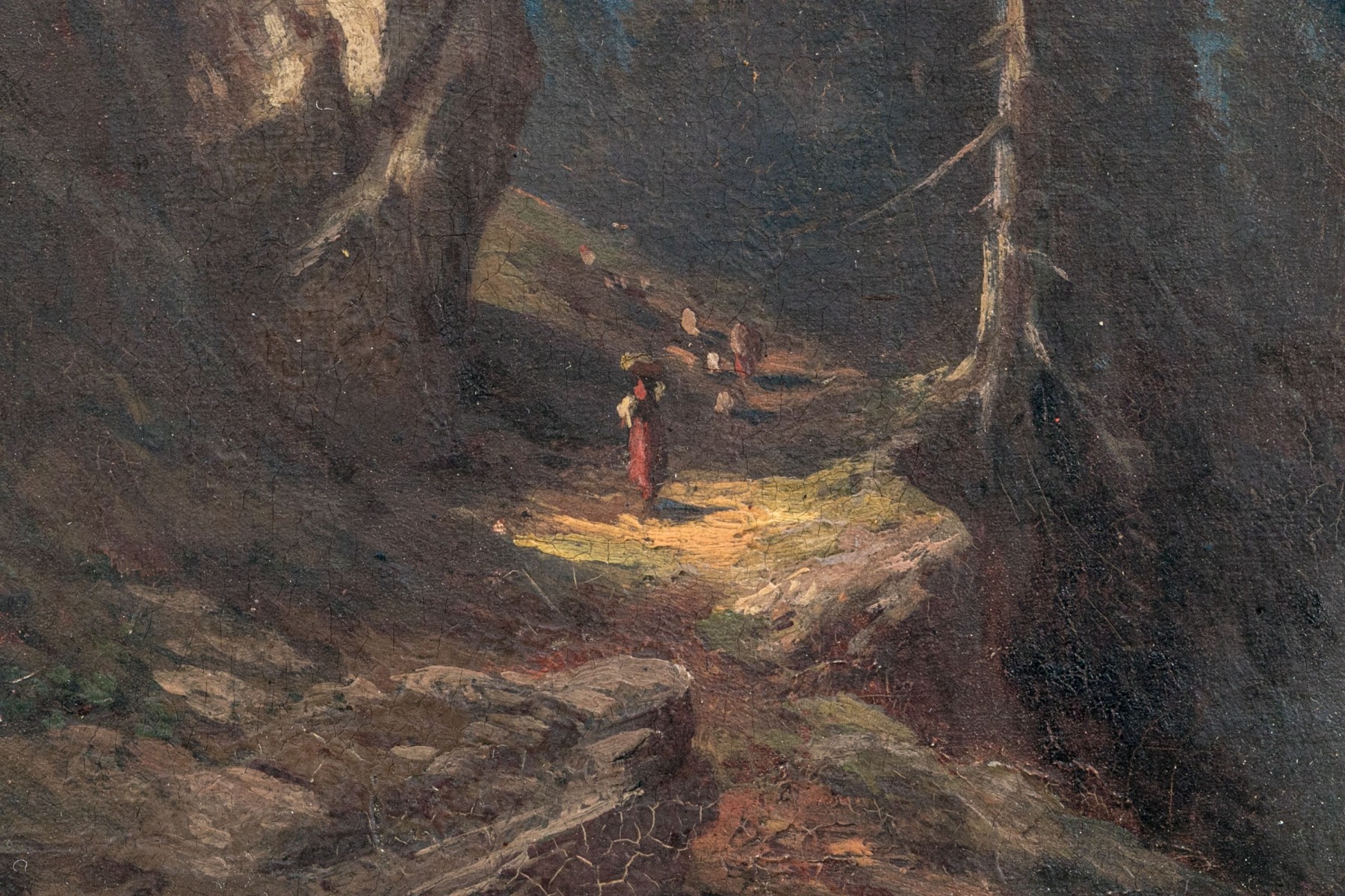 charming diminutive oil painting on panel depicting a procession of figures ascending a rocky path flanked by evergreens and bare branched trees scaled by pale mountains leading up to a light yellow and blue sky. Appears to be unsigned. Displayed in a gilt frame.