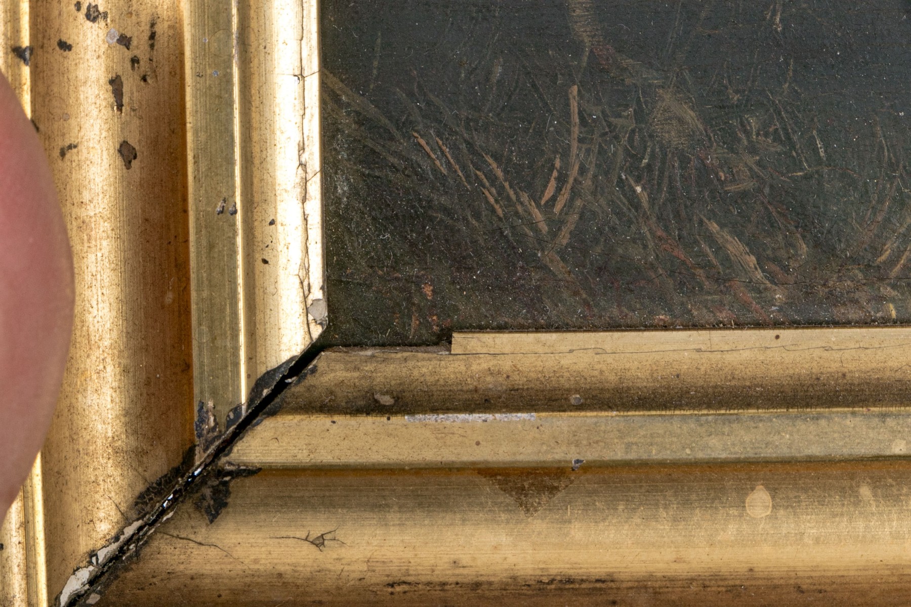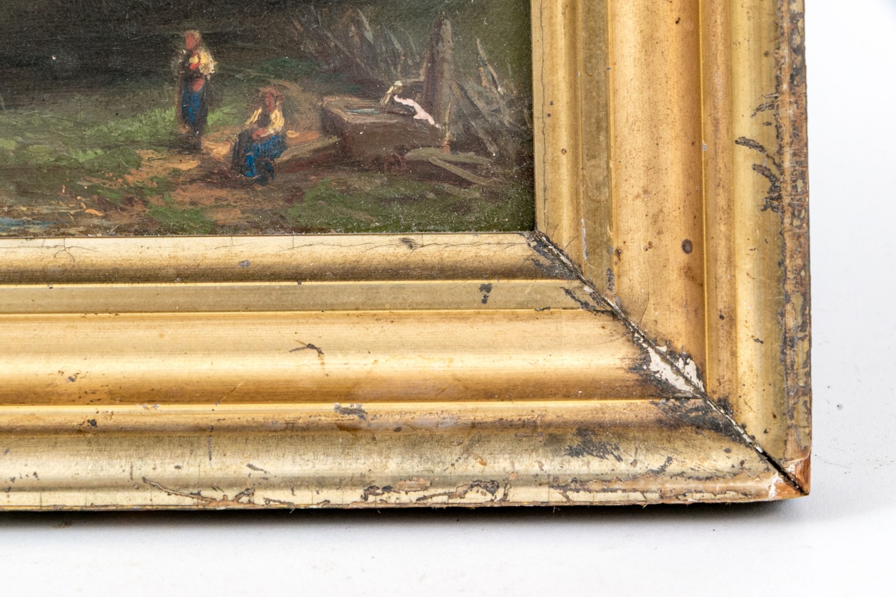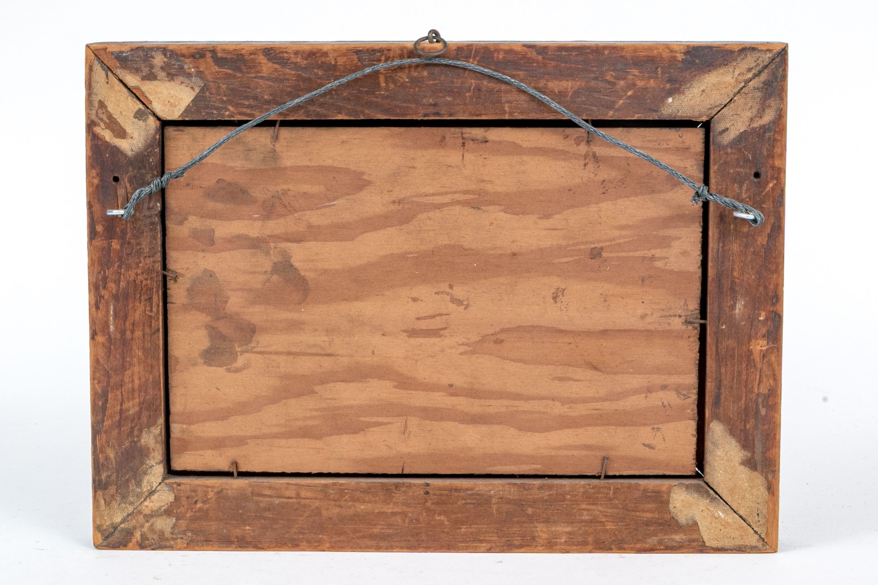 Scratches to the panel and losses to the painted finish. Wear to the gilt finish and gesso on frame. Despite wear the artwork presents well.