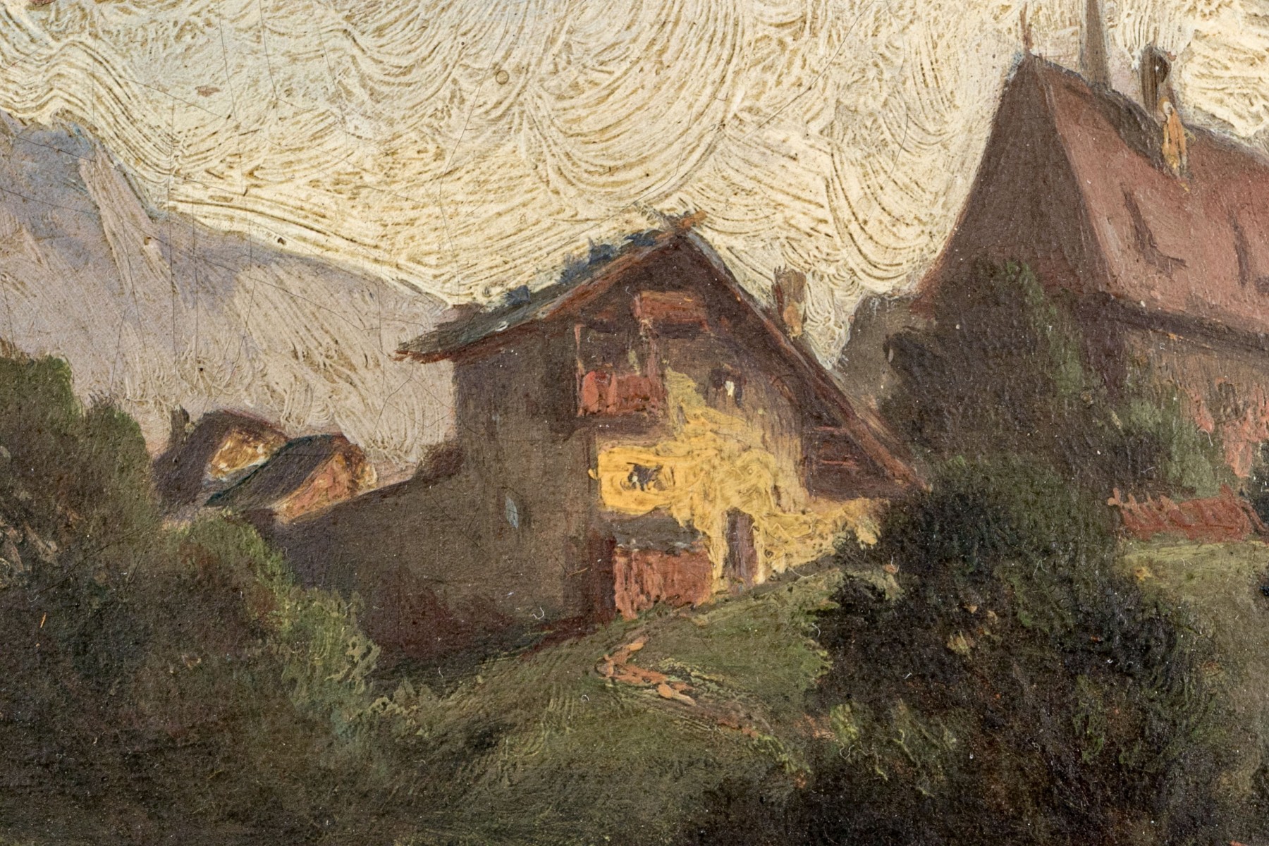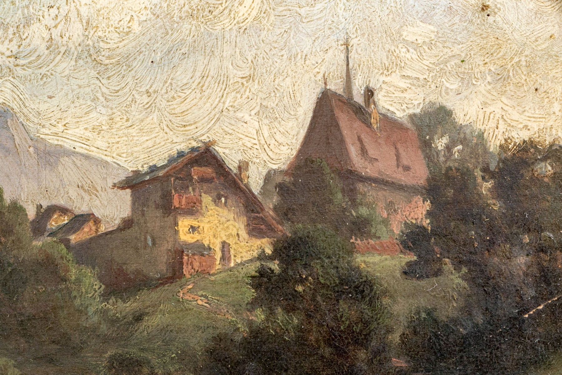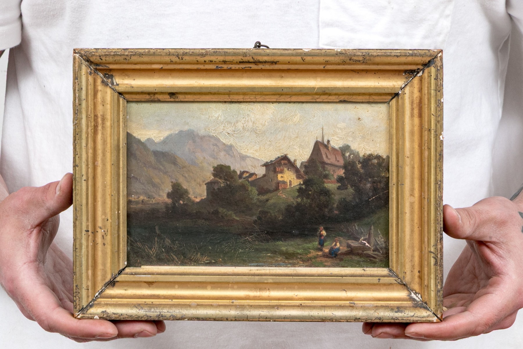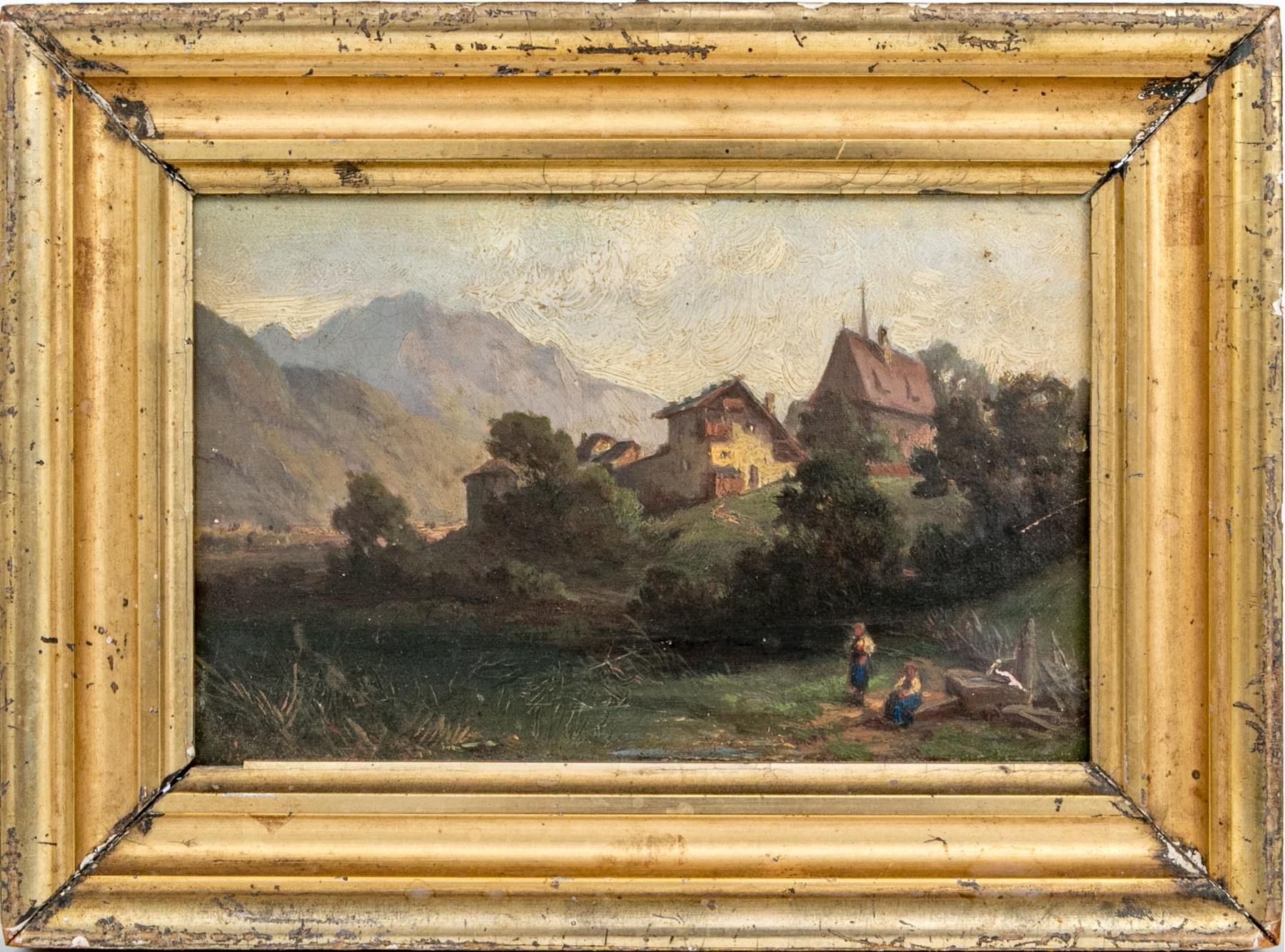 A charming diminutive oil painting on panel depicting two figures in a field outside of a small town surrounded by lush green trees leading to mountains fading into the distance beneath a clouded sky. Appears to be unsigned.