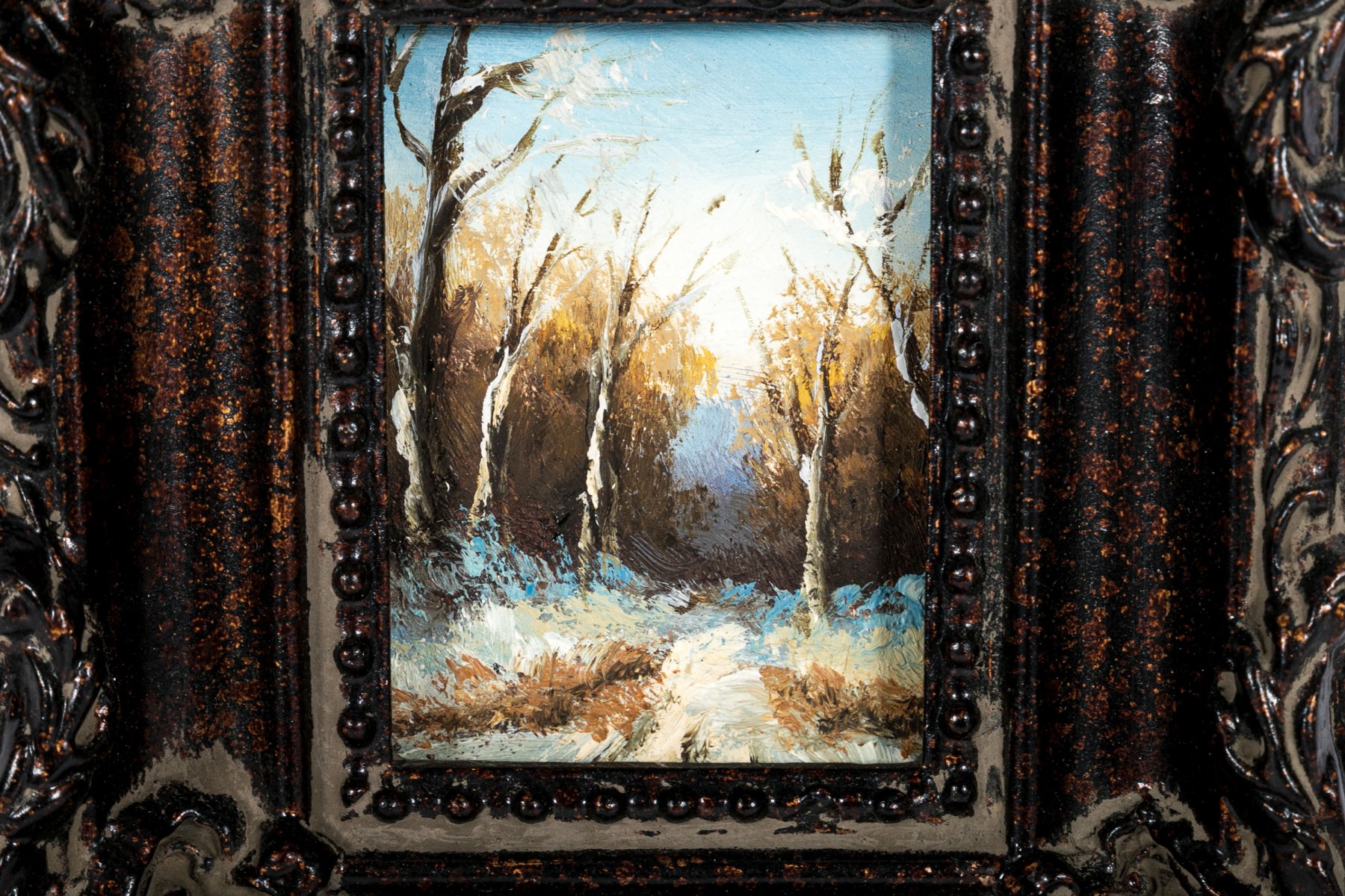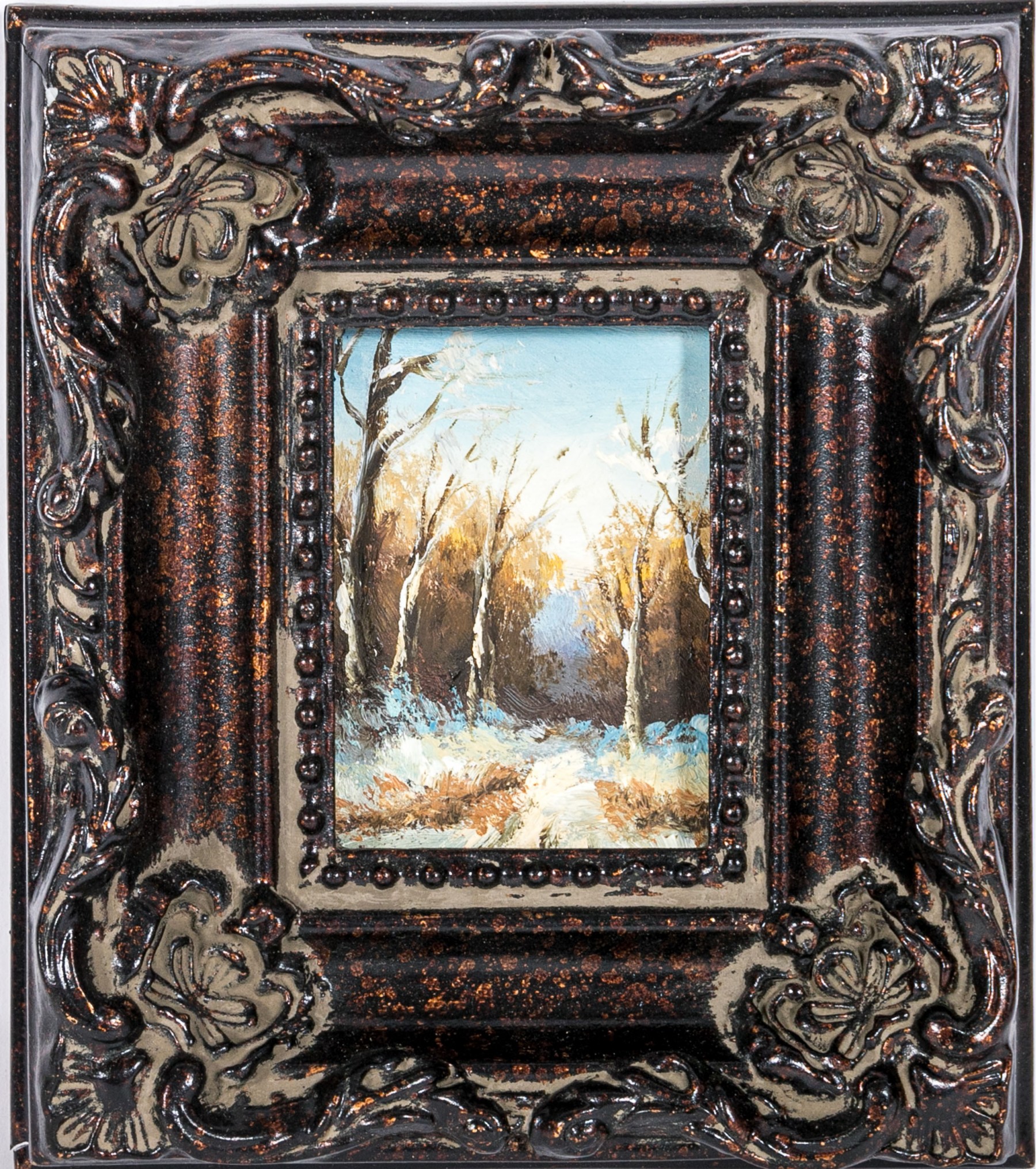 Diminutive oil on wood panel, winter landscape depicting a centralized pathway bisecting a sparse forest in winter. Unsigned. Mounted in contemporary carved composite frame with coppertone accenting.