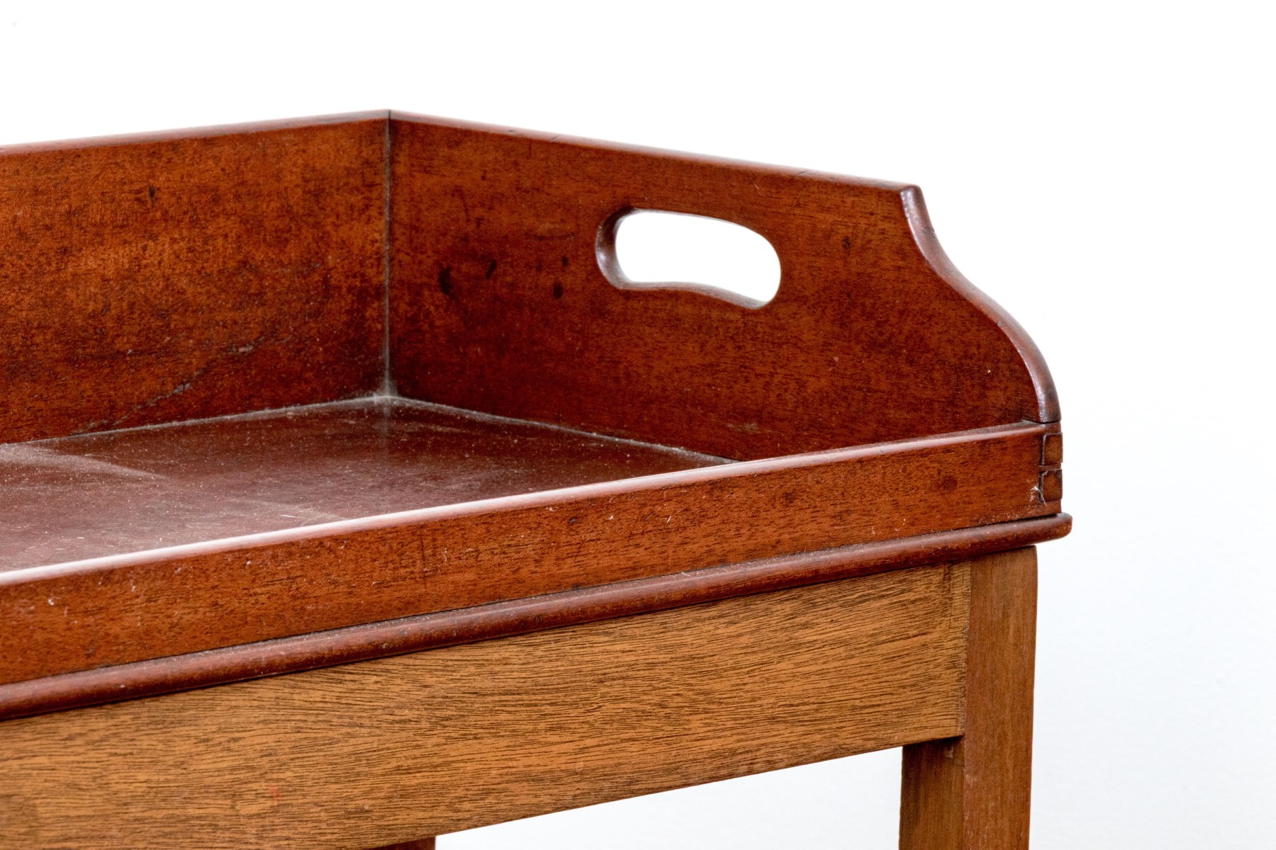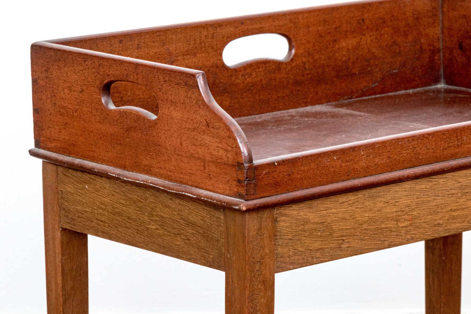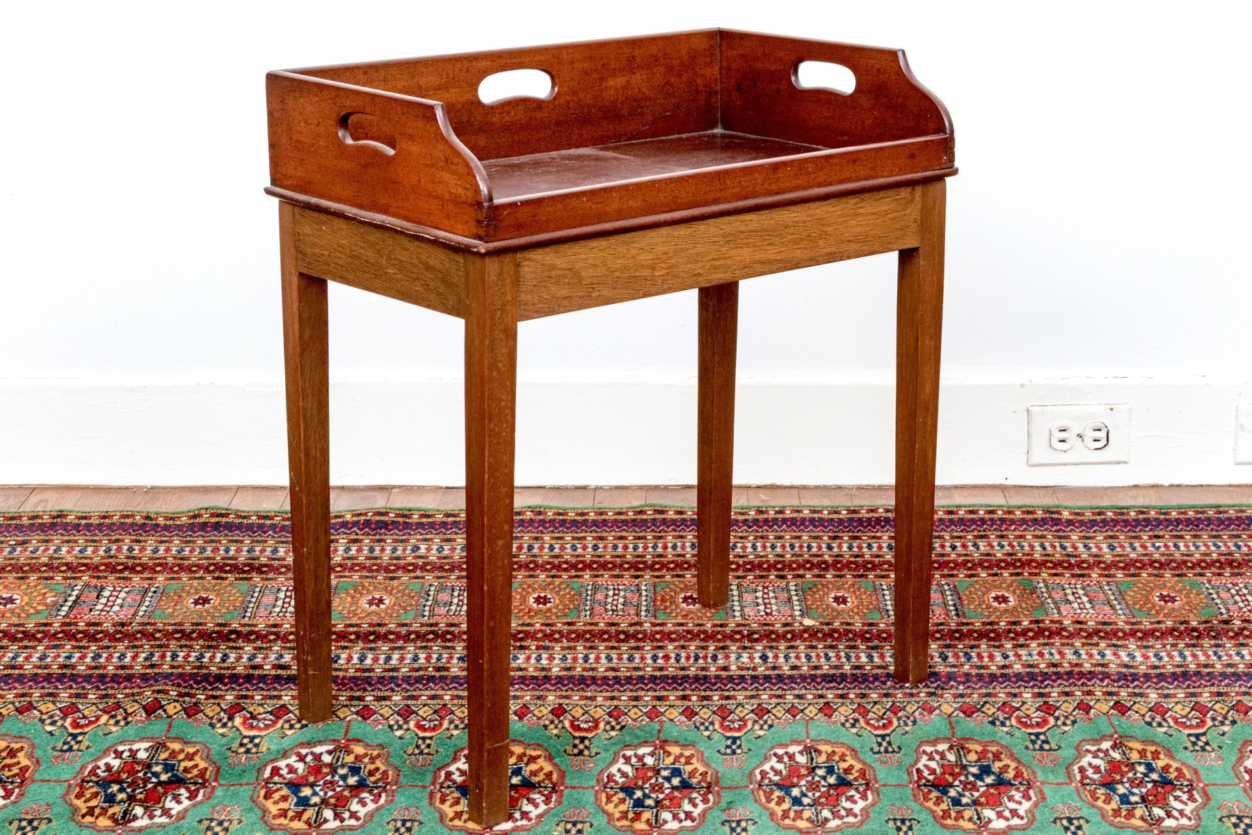 A wonderful butler style accent table on four legs with an affixed tray top with three quarter back gallery, with a handle to the sides and back with a lower gallery to the front.