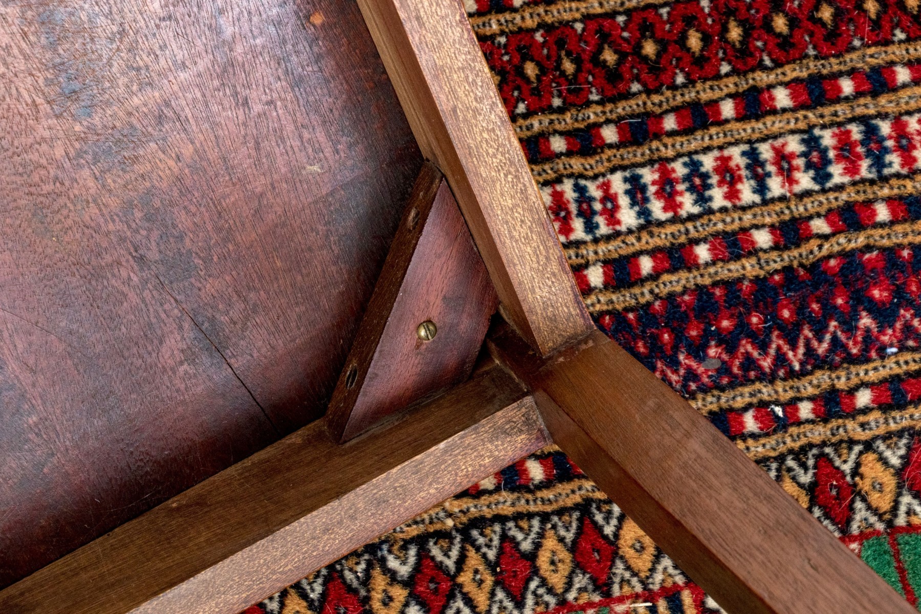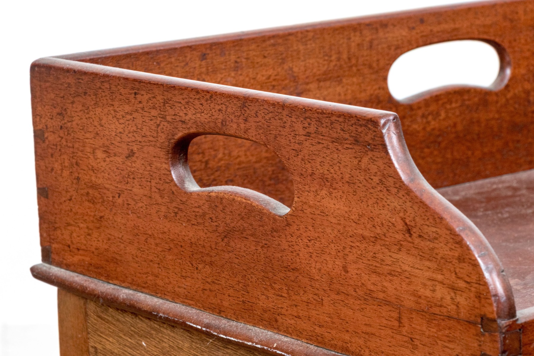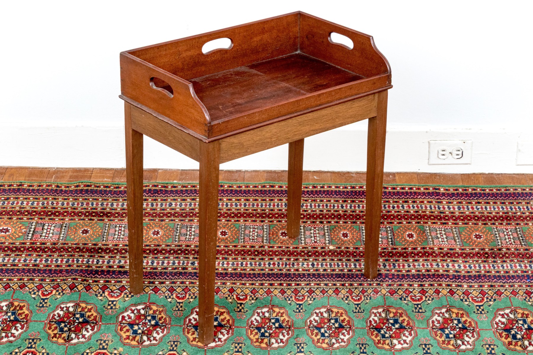A wonderful butler style accent table on four legs with an affixed tray top with three quarter back gallery, with a handle to the sides and back with a lower gallery to the front.