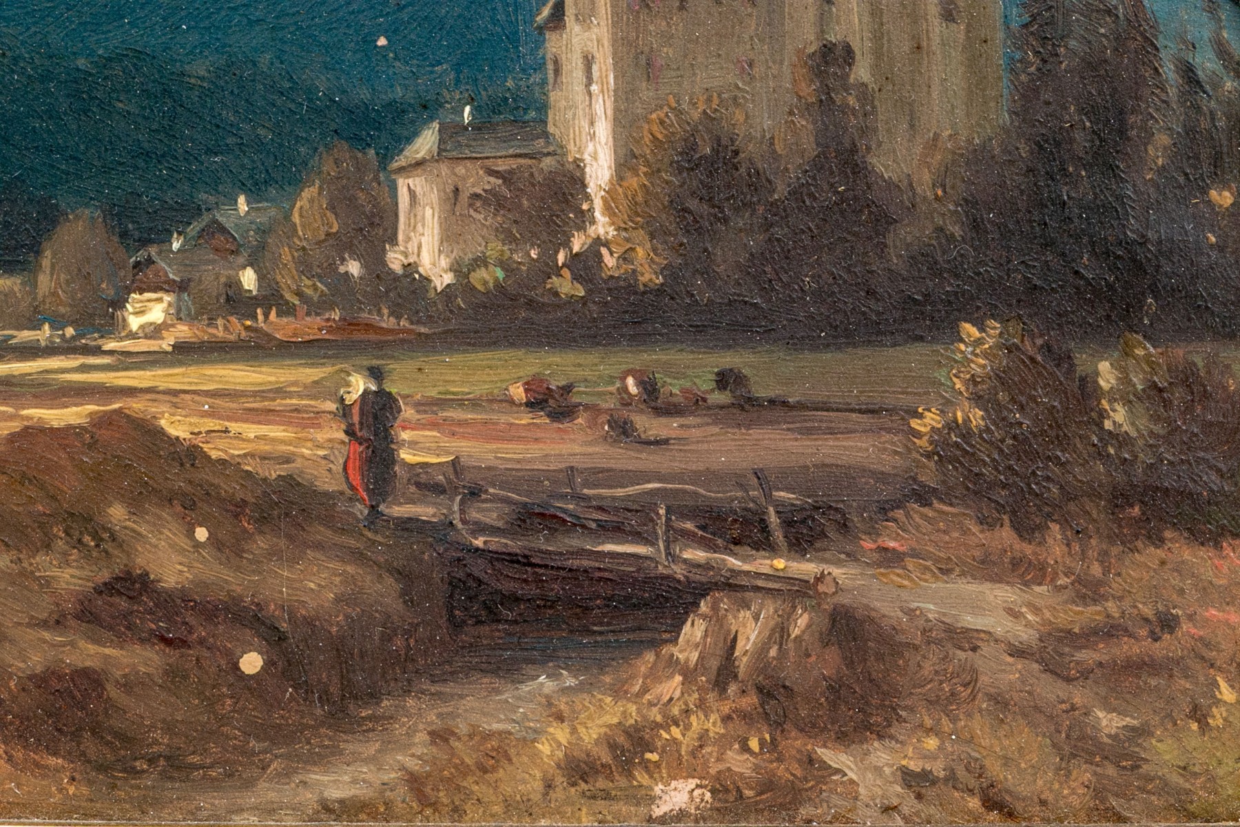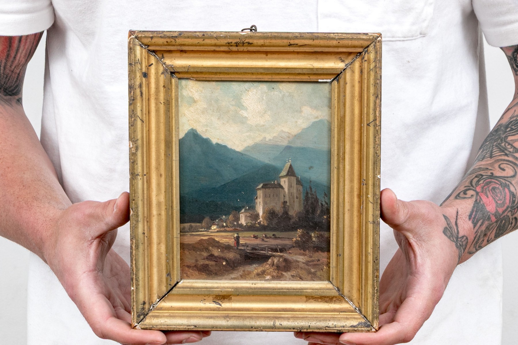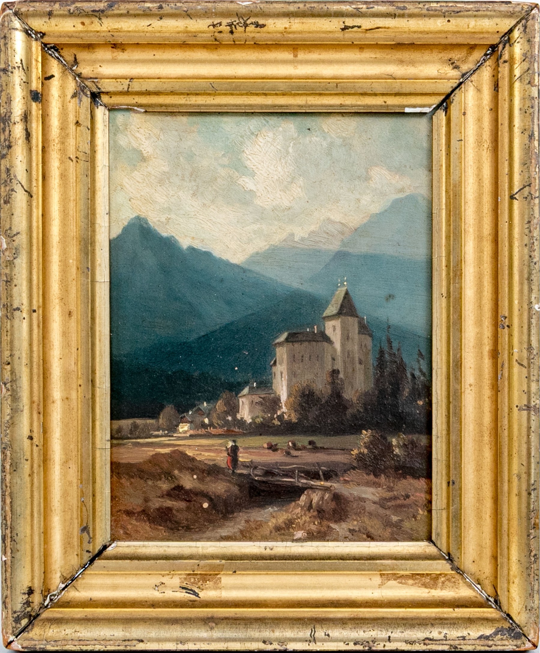 A charming diminutive oil painting on panel depicting a figure crossing a small wood bridge over a stream passing by a white manor with dark roofs overlooking vast blue mountains beneath a clouded sky. Appears to be unsigned.