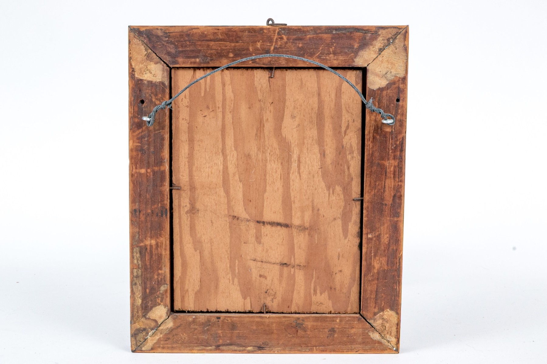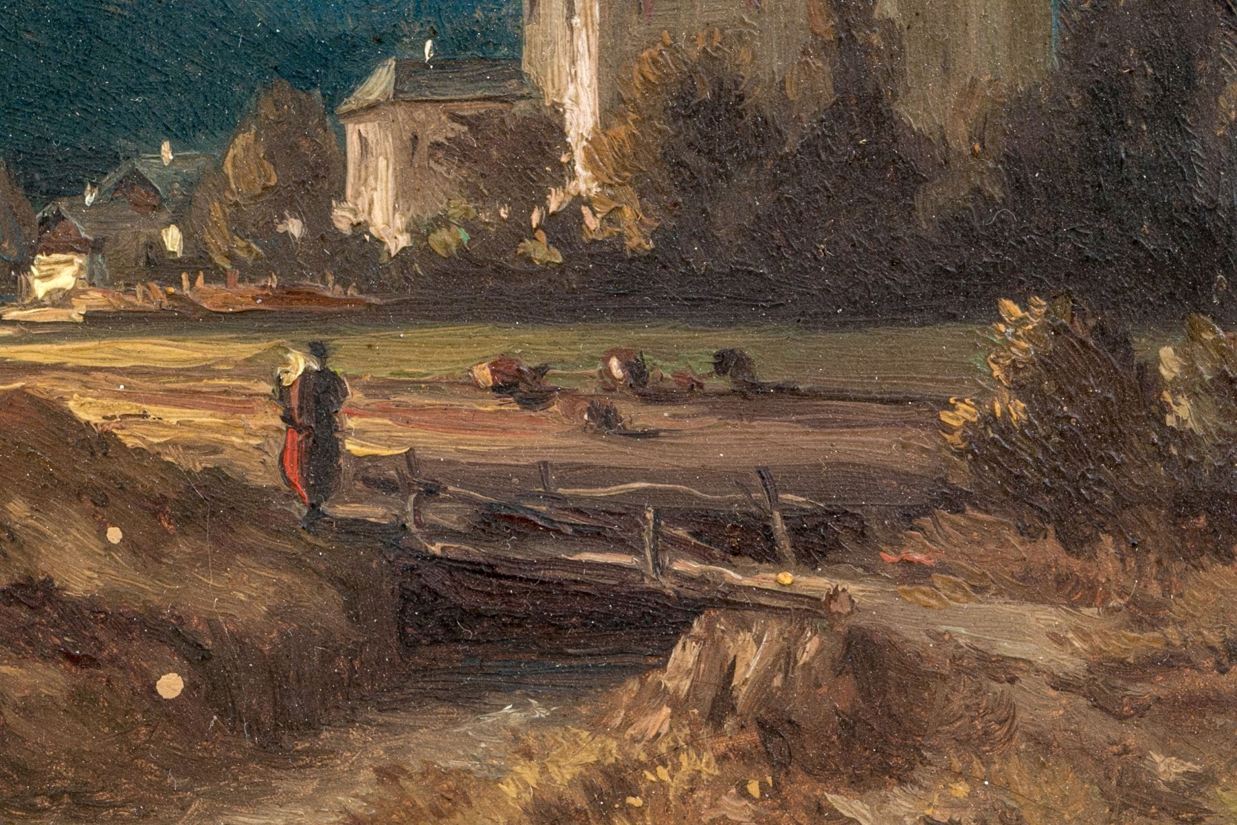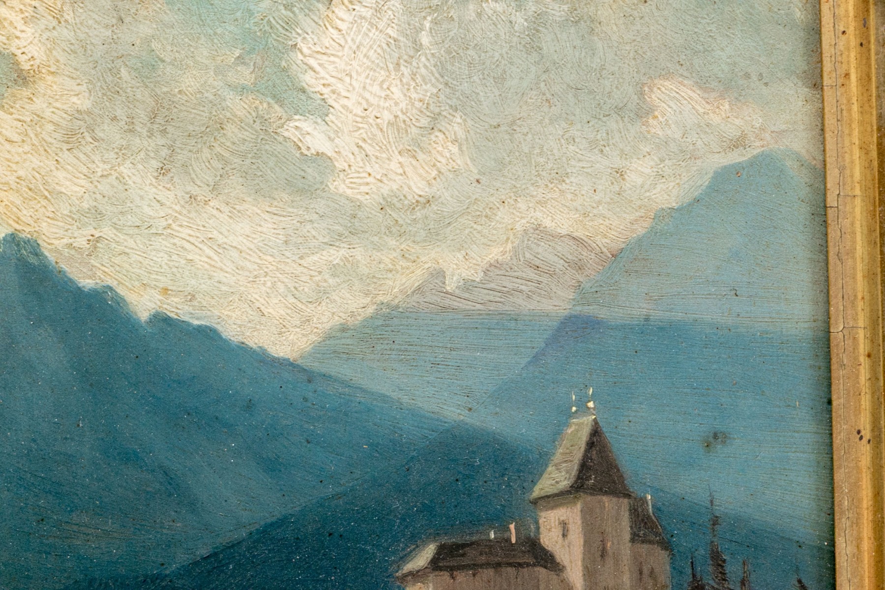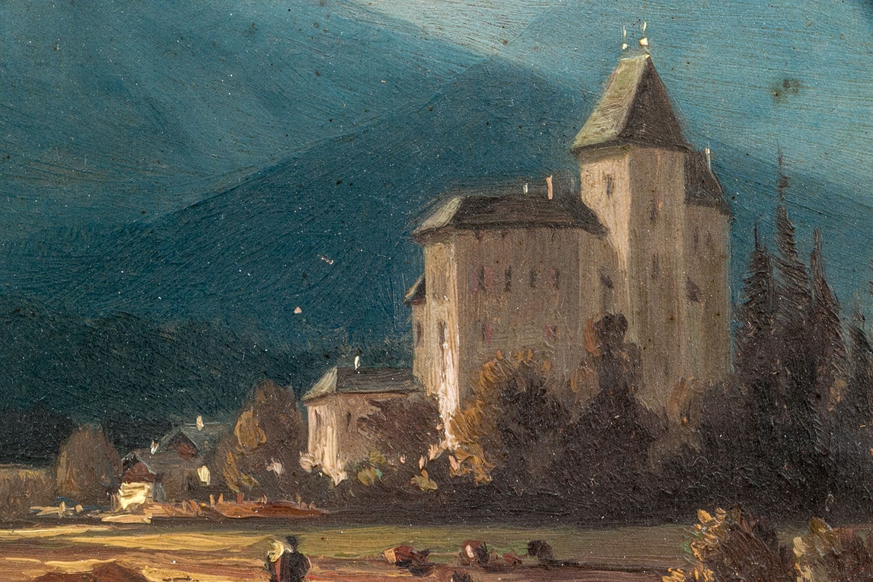 A charming diminutive oil painting on panel depicting a figure crossing a small wood bridge over a stream passing by a white manor with dark roofs overlooking vast blue mountains beneath a clouded sky. Appears to be unsigned.
