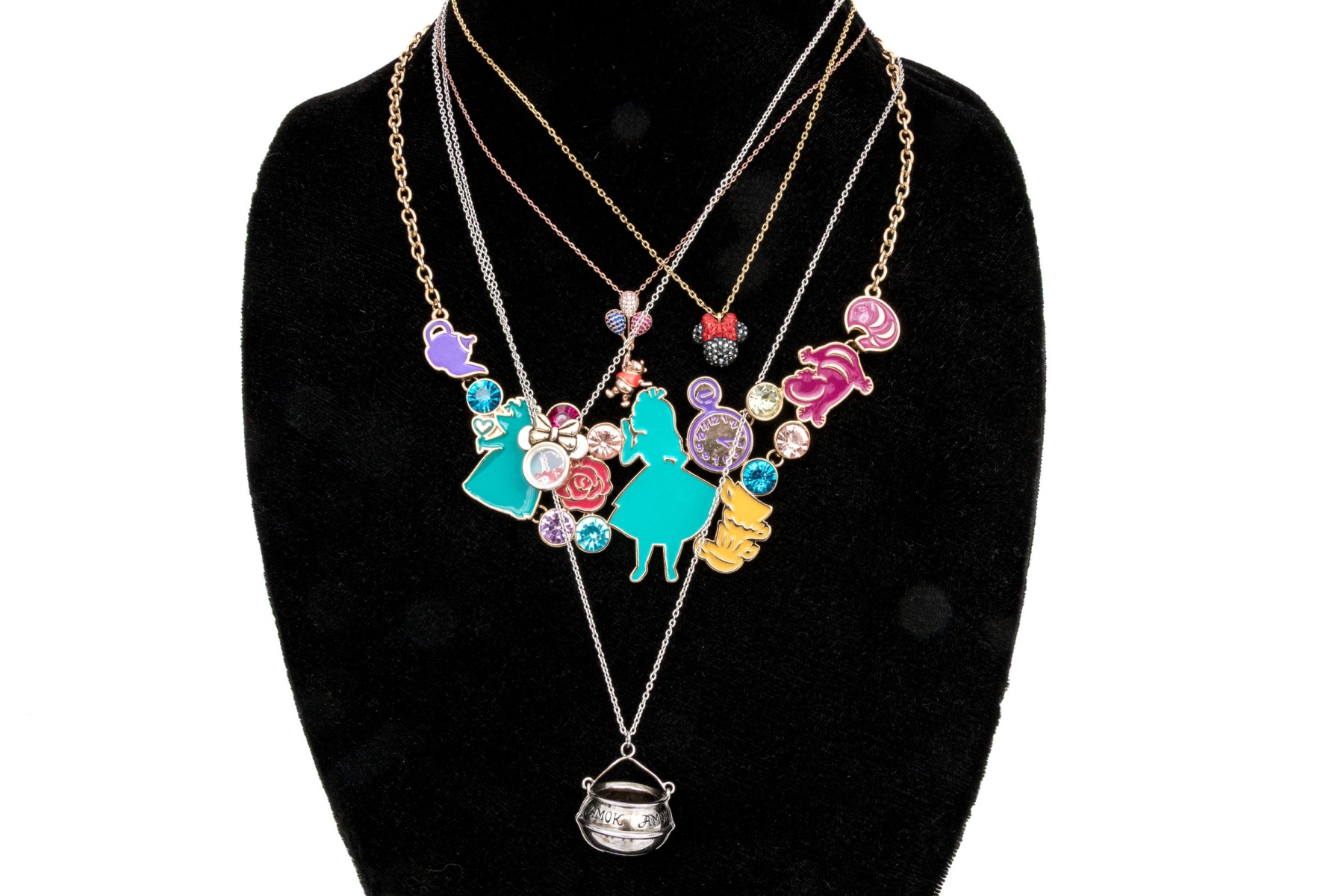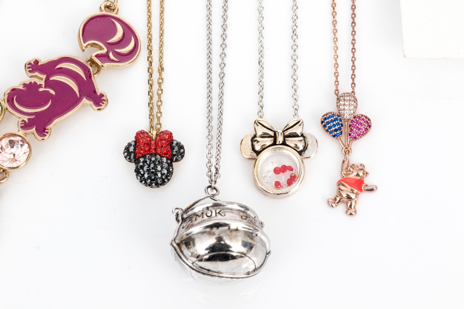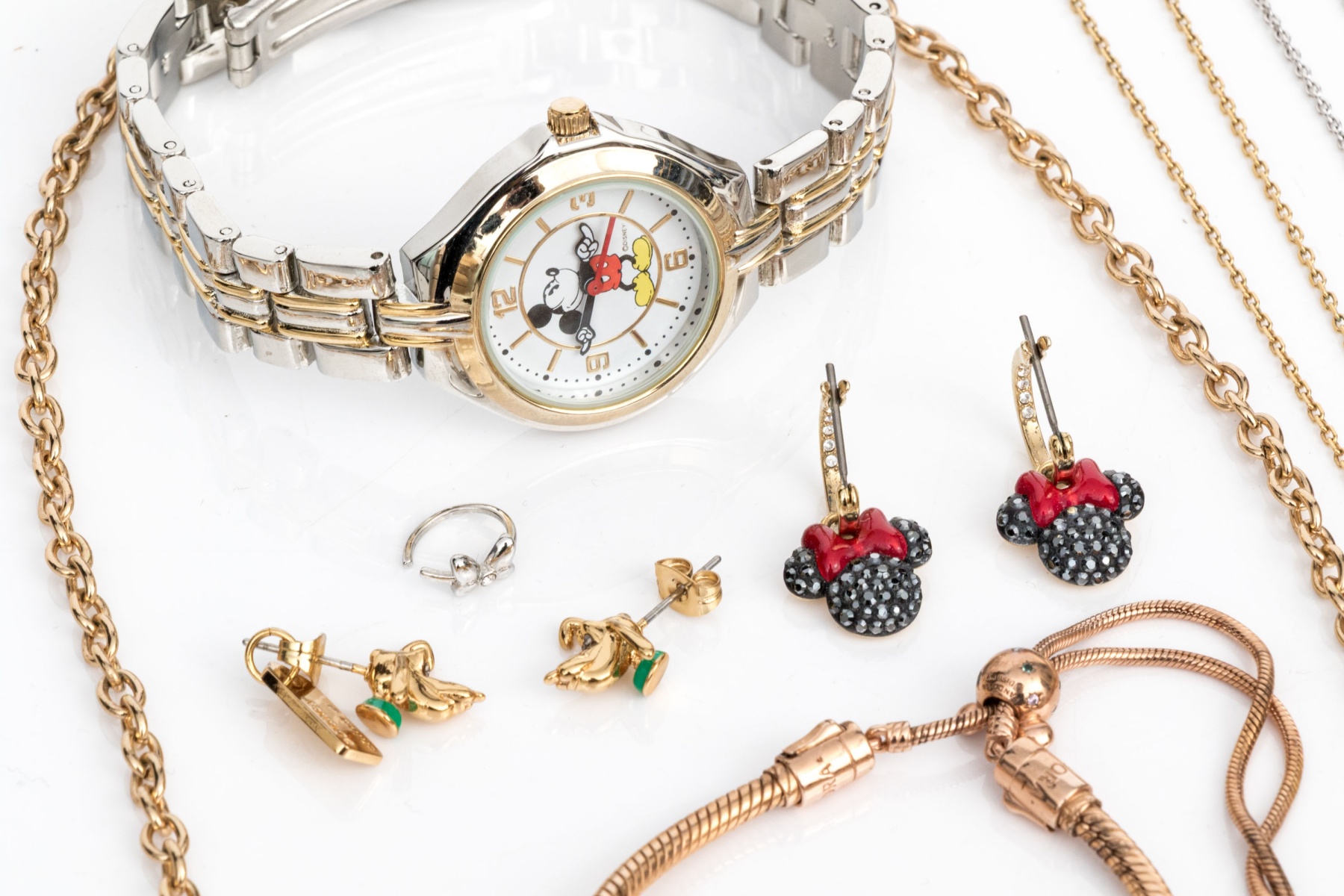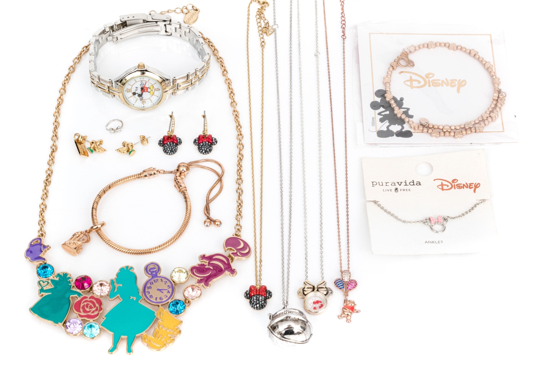 Collection of Disney jewelry, multiple themes, including three Minnie Mouse necklaces, one pair Minnie Mouse earrings, one Minnie Mouse ear cuff, one Minnie Mouse bracelet, one pair of Pluto earrings, one Mickey Mouse watch, one Winnie the Pooh necklace, one Alice in Wonderland necklace, one "Amok" necklace from Hocus Pocus, and one Disney Parks/Pandora castle charm bracelet (with box)