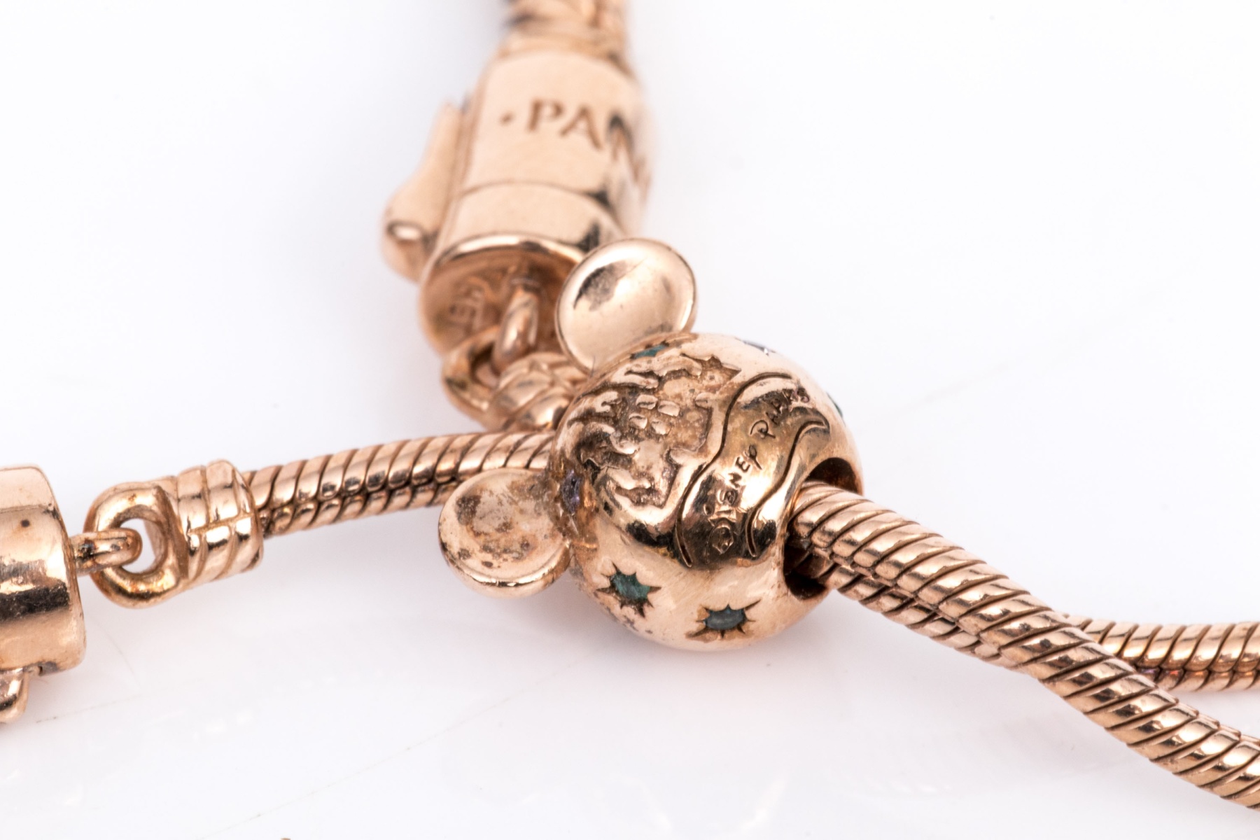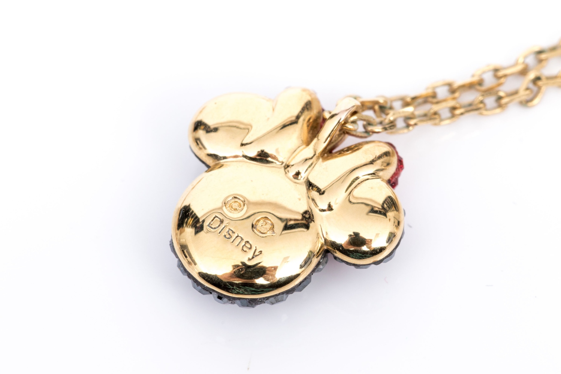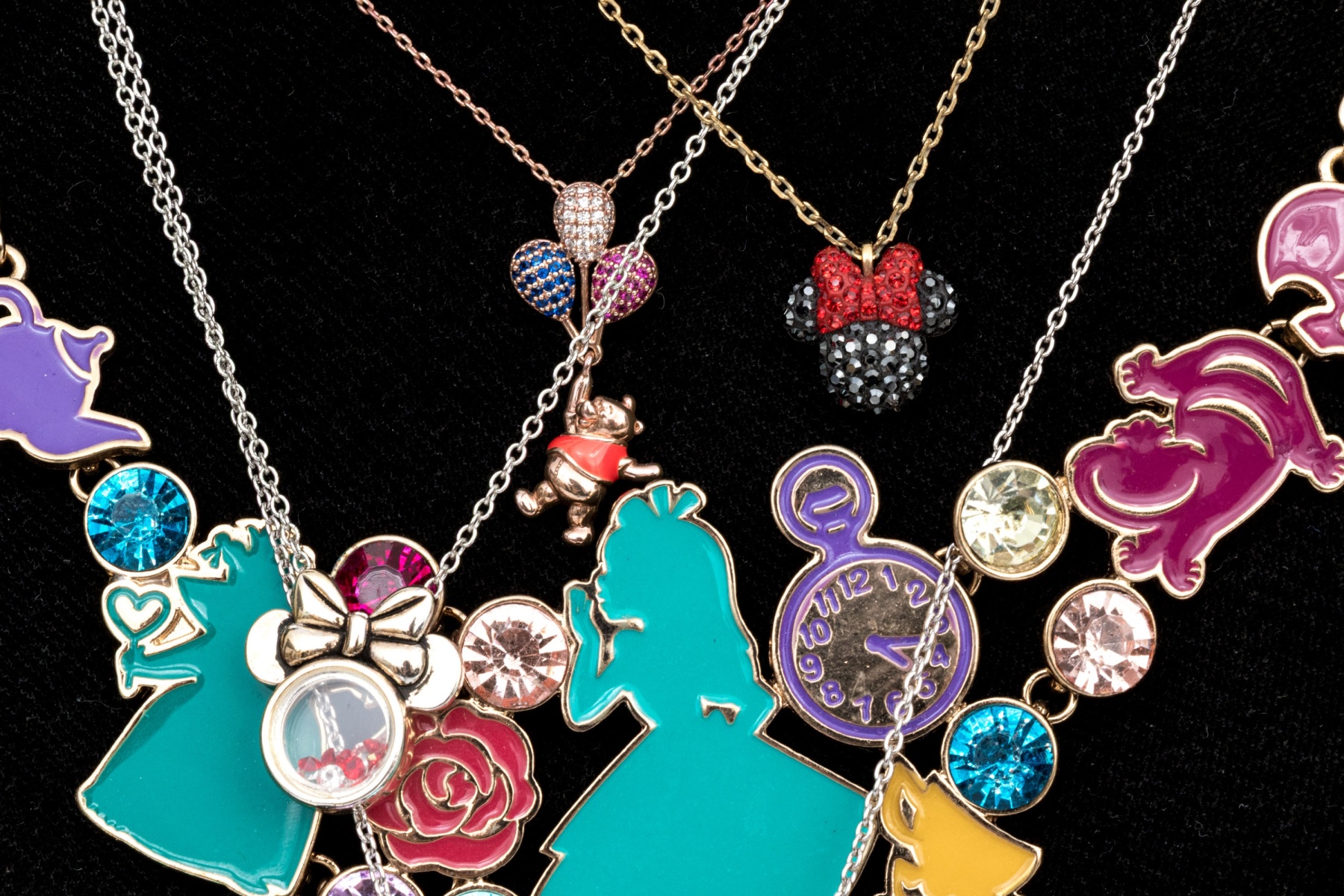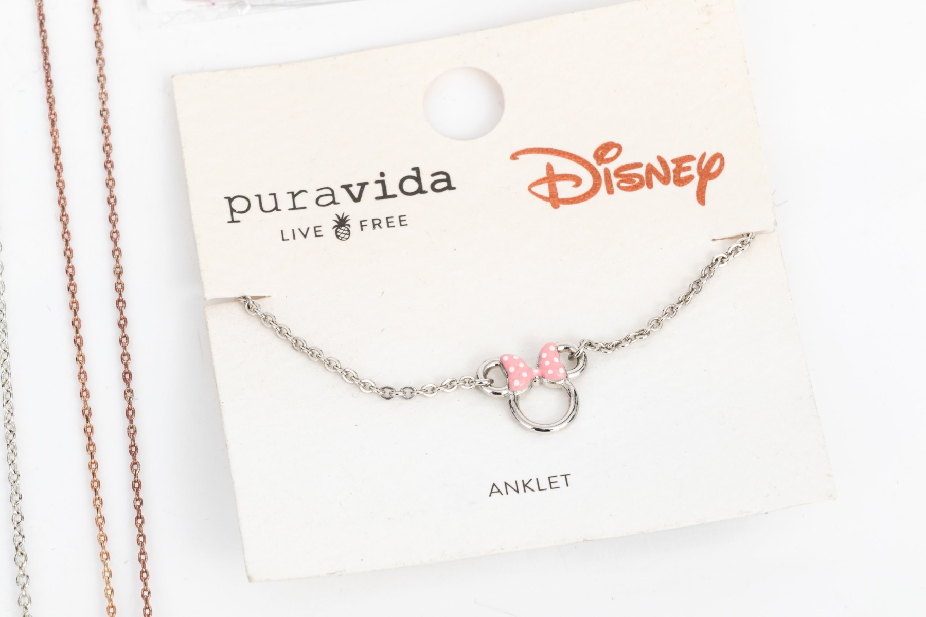 Collection of Disney jewelry, multiple themes, including three Minnie Mouse necklaces, one pair Minnie Mouse earrings, one Minnie Mouse ear cuff, one Minnie Mouse bracelet, one pair of Pluto earrings, one Mickey Mouse watch, one Winnie the Pooh necklace, one Alice in Wonderland necklace, one "Amok" necklace from Hocus Pocus, and one Disney Parks/Pandora castle charm bracelet (with box)