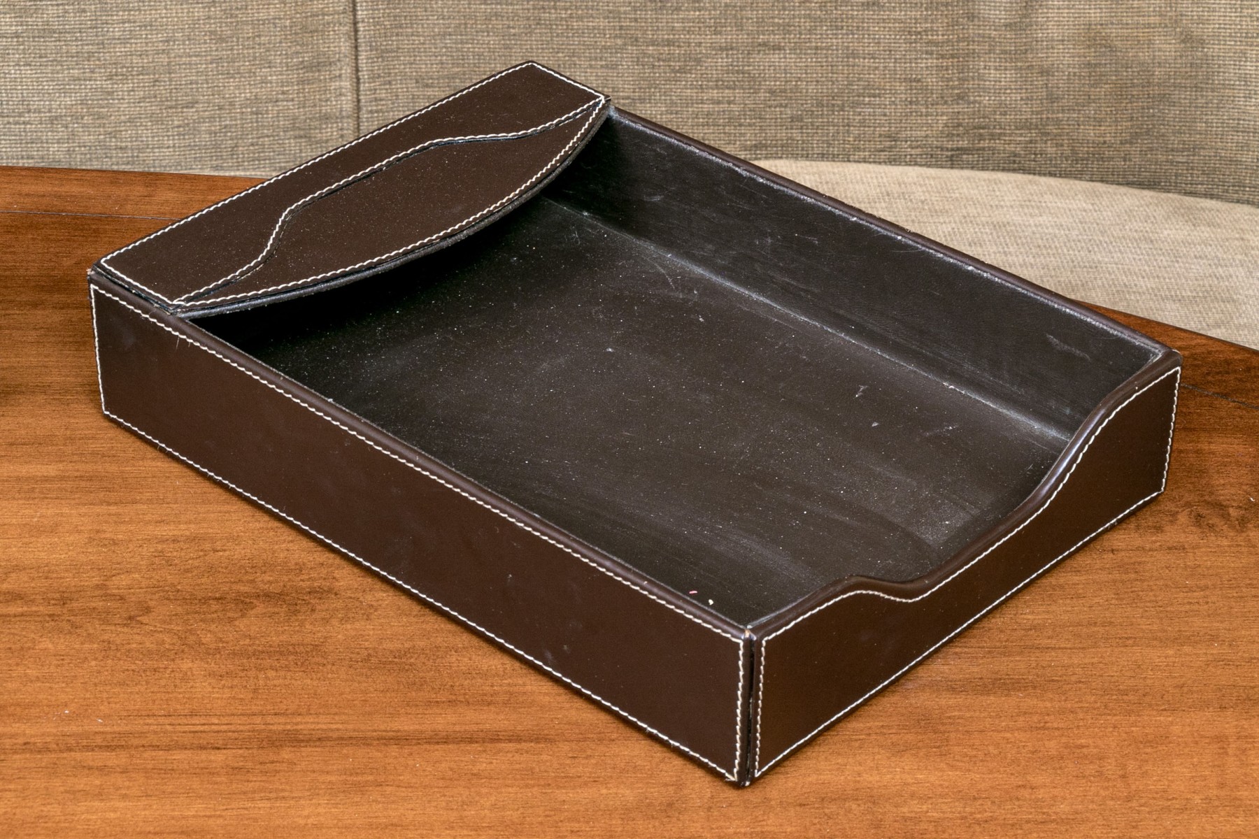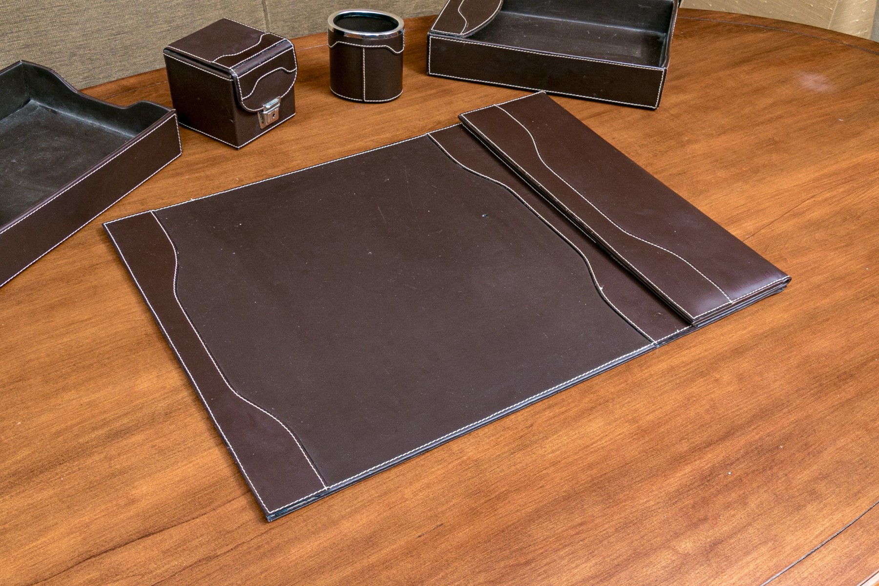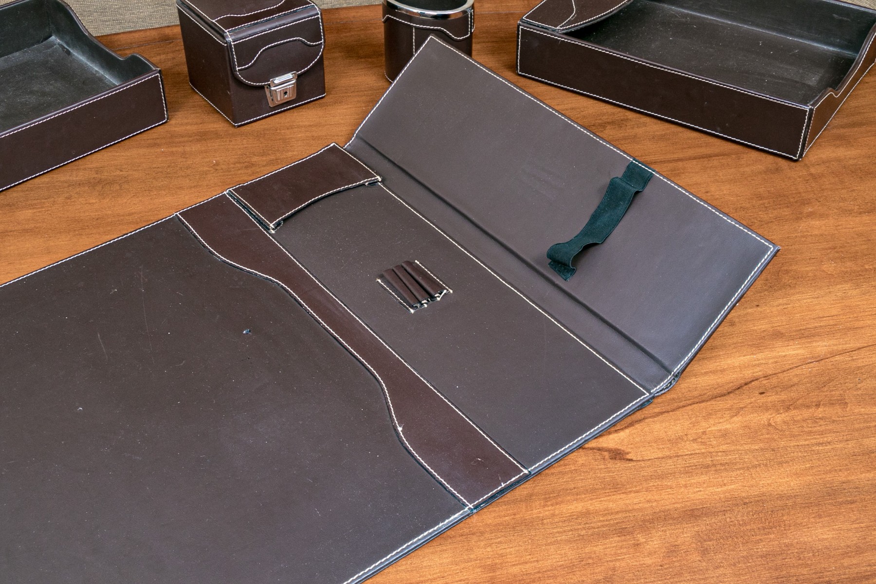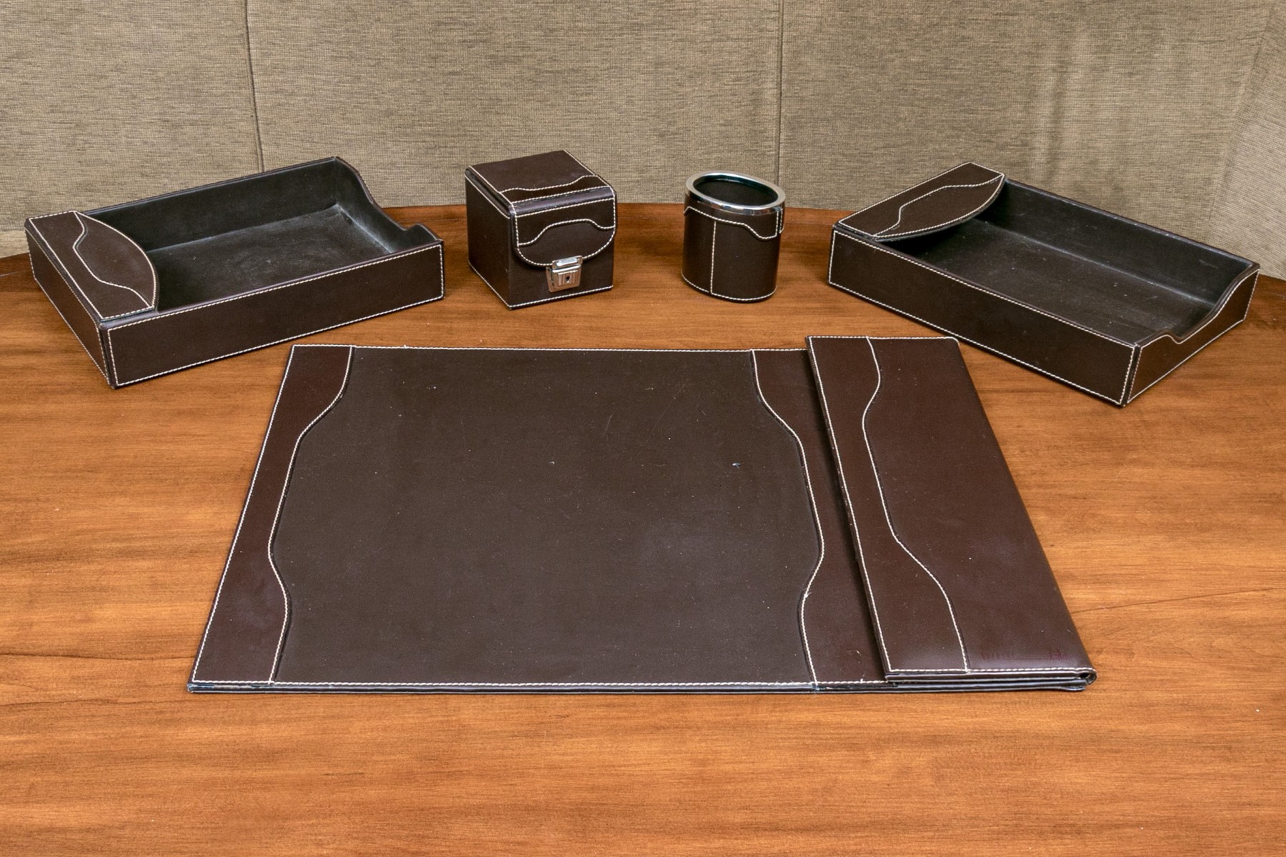 Comprised of a desk mat, pen pot, two rectangular caddies and a small box with clasp.