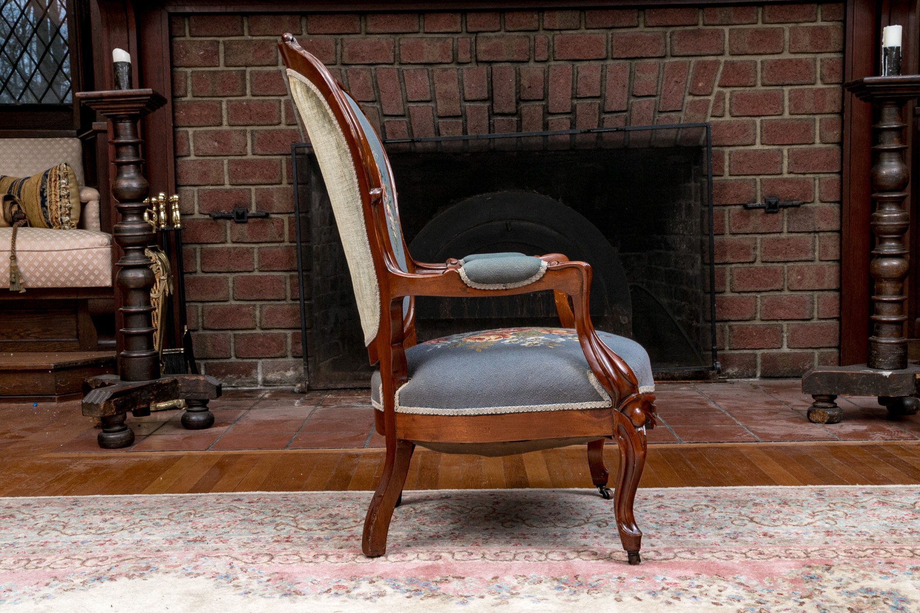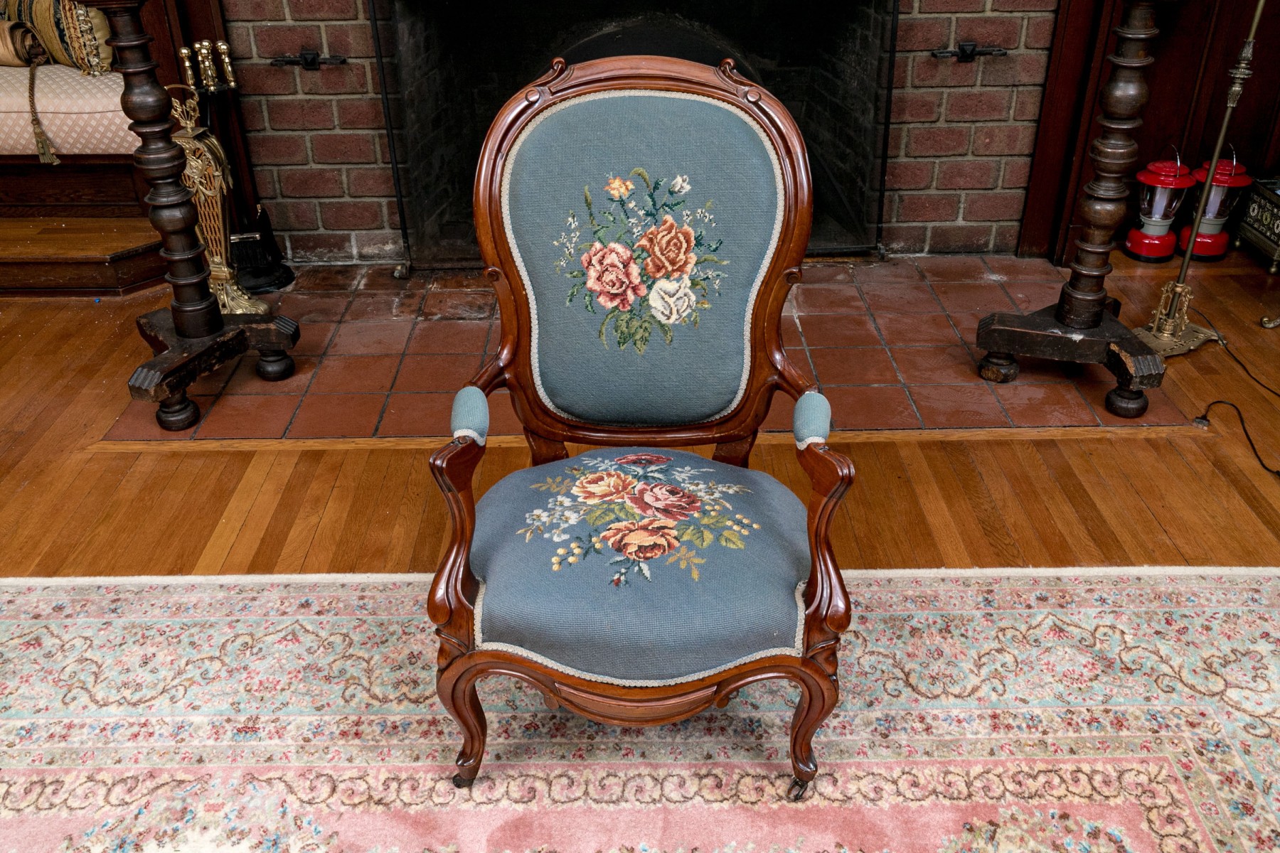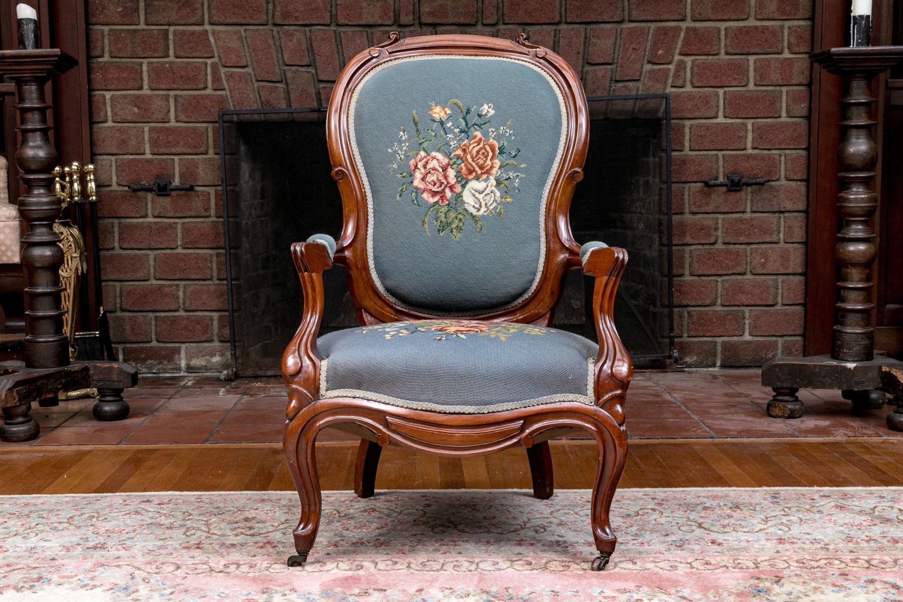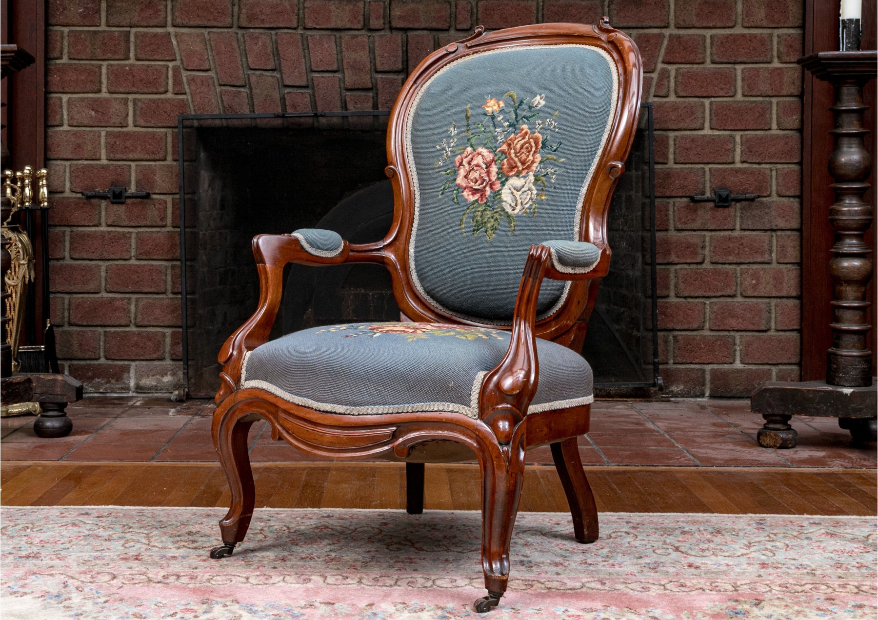 This lovely Victorian armchair is complete with needlepoint floral decorations to the back and the seat with armrests on the arms of the chair. The whole having a sturdy design with nice carved decorations raised on cabriole legs with caster feet to the front.