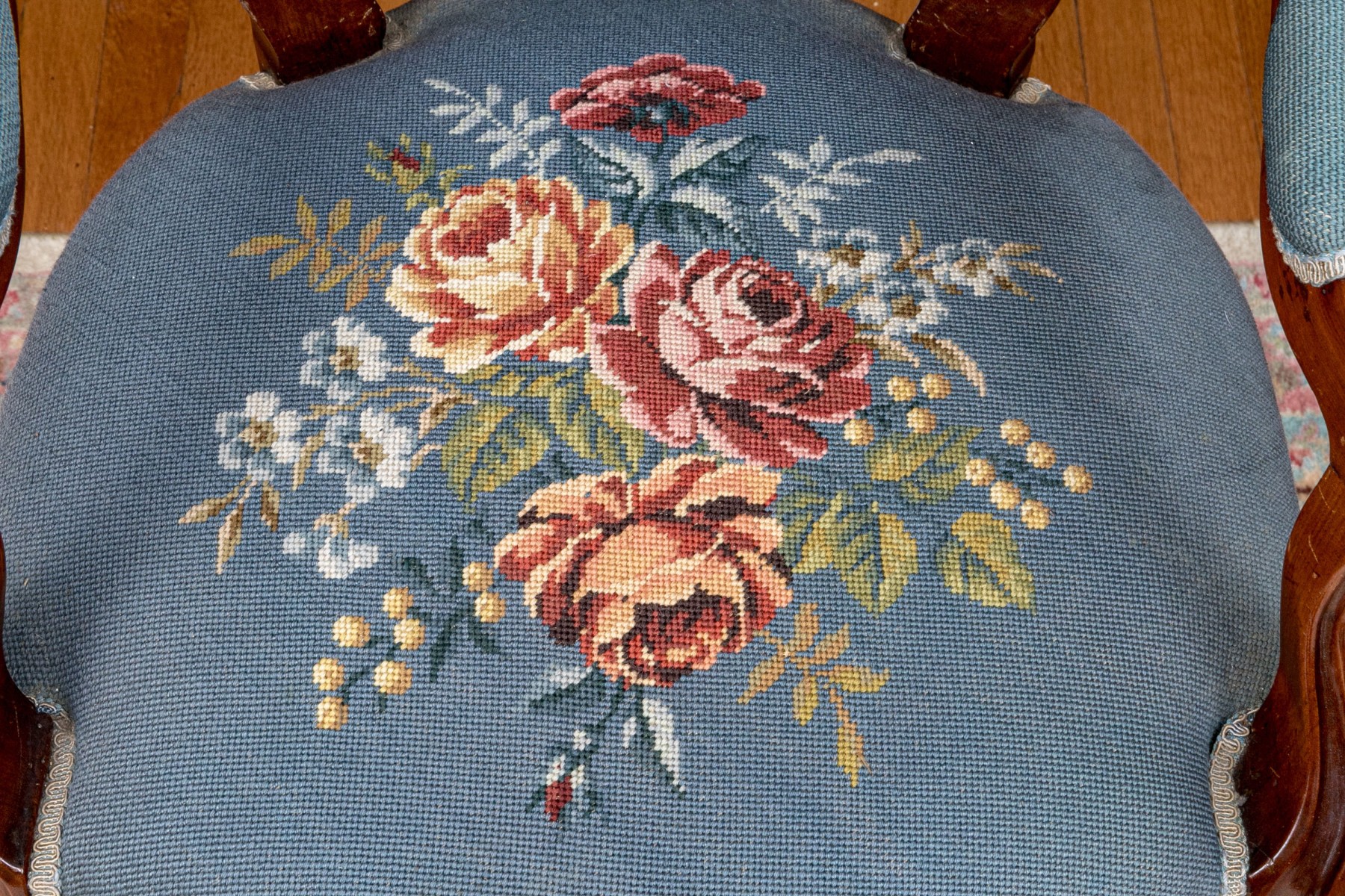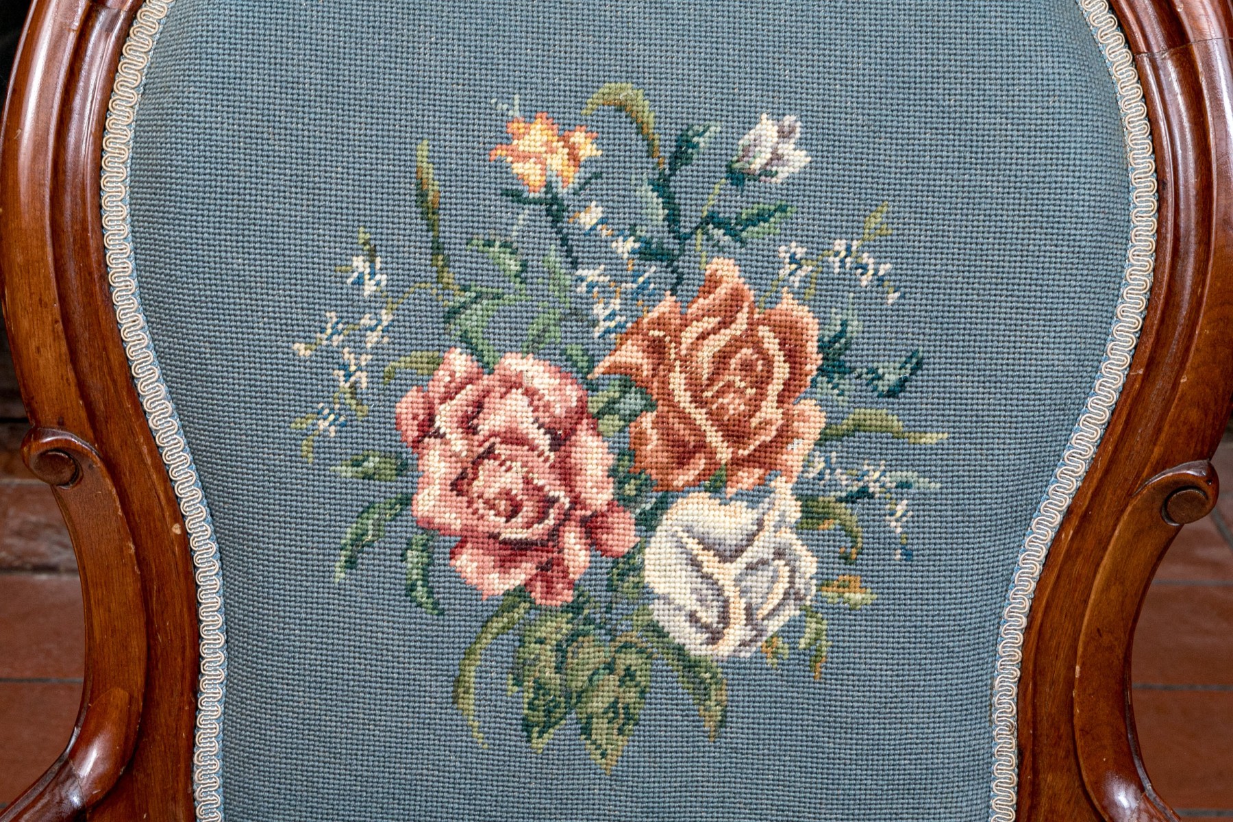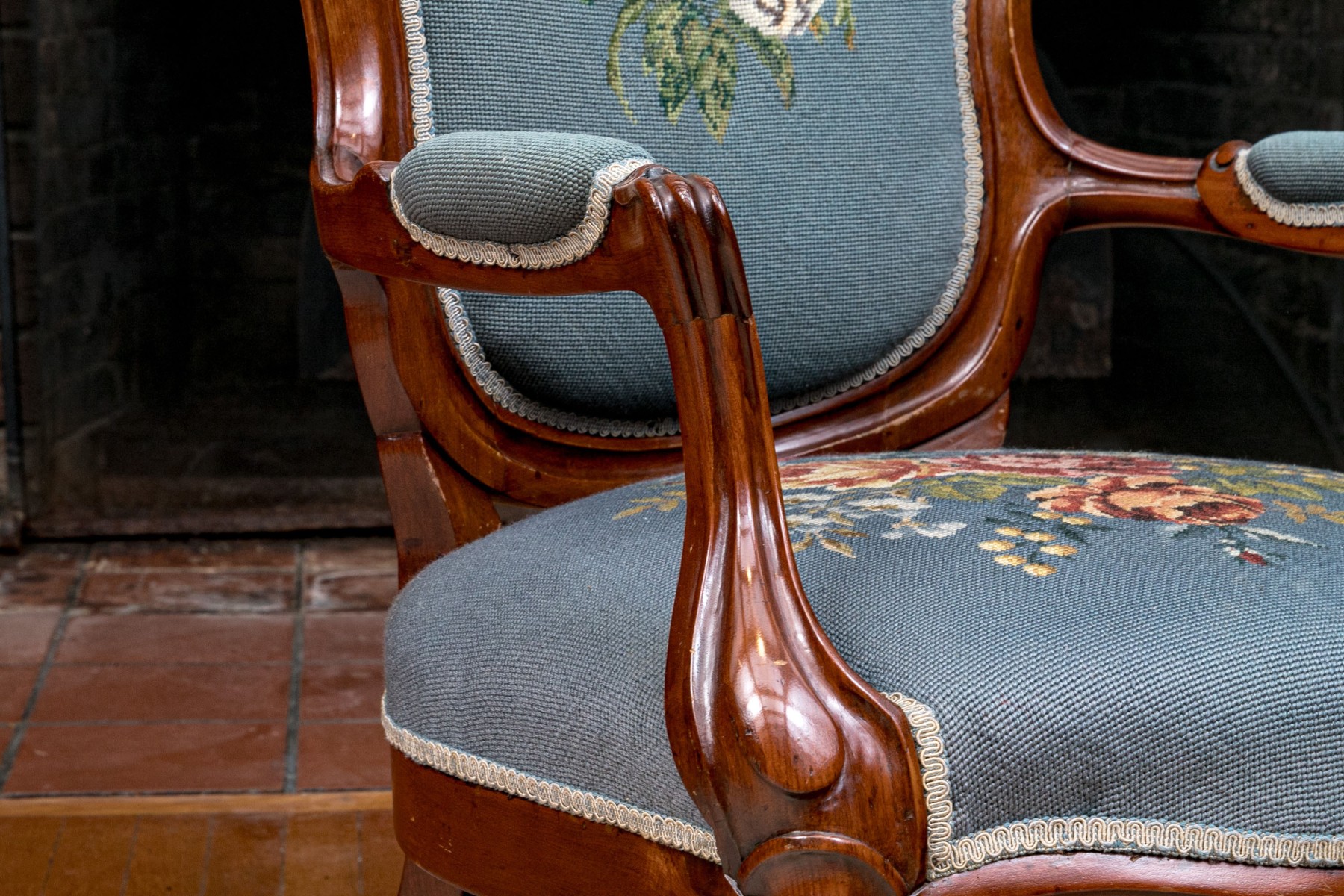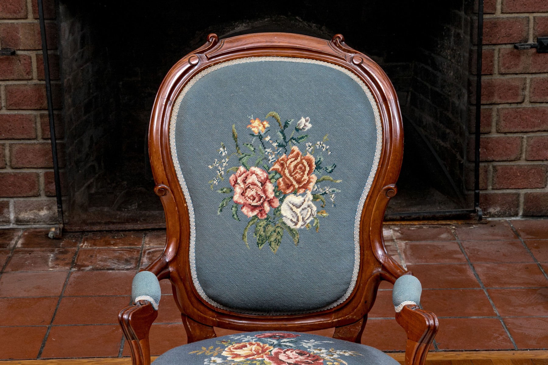 This lovely Victorian armchair is complete with needlepoint floral decorations to the back and the seat with armrests on the arms of the chair. The whole having a sturdy design with nice carved decorations raised on cabriole legs with caster feet to the front.