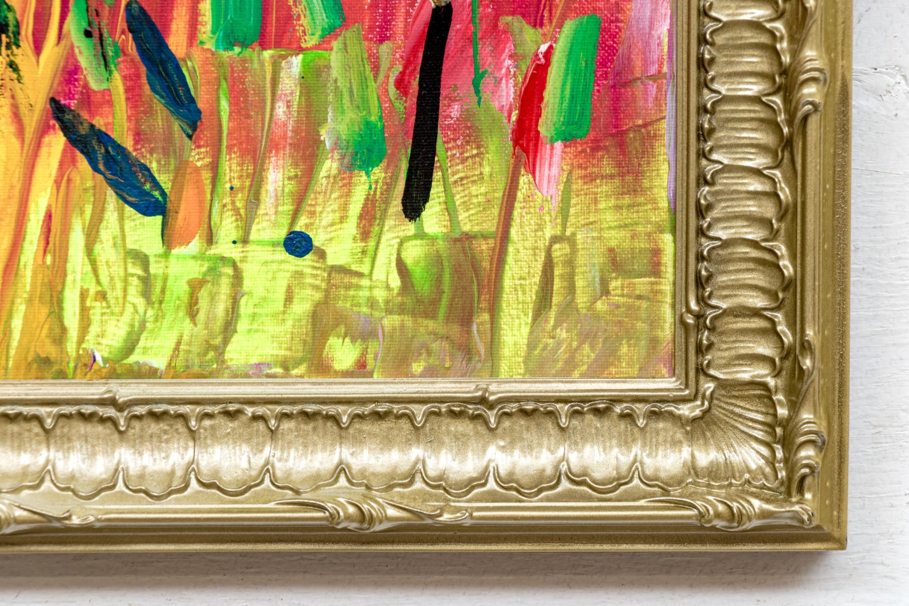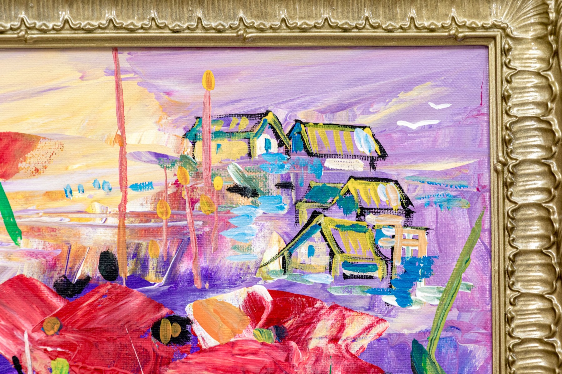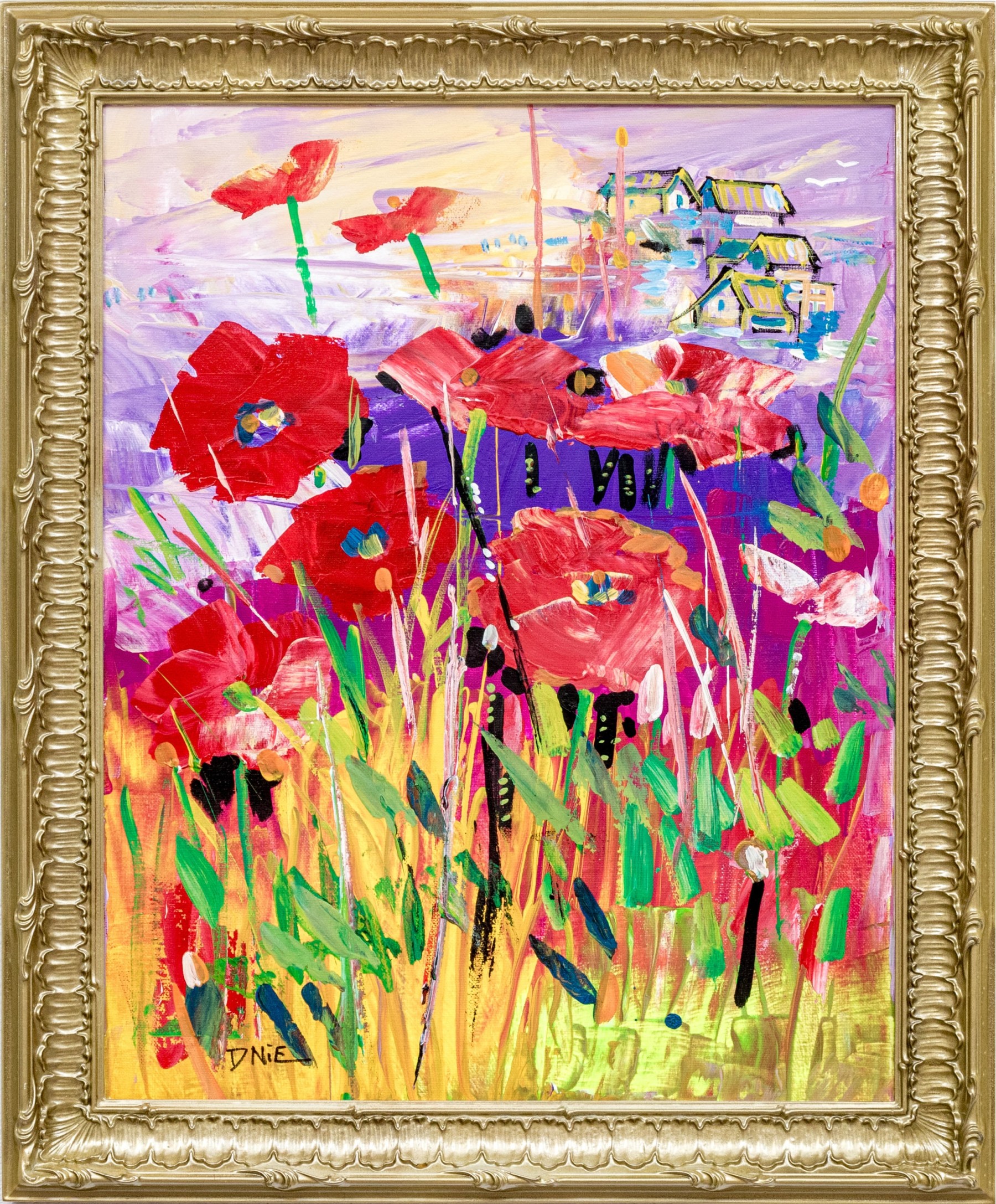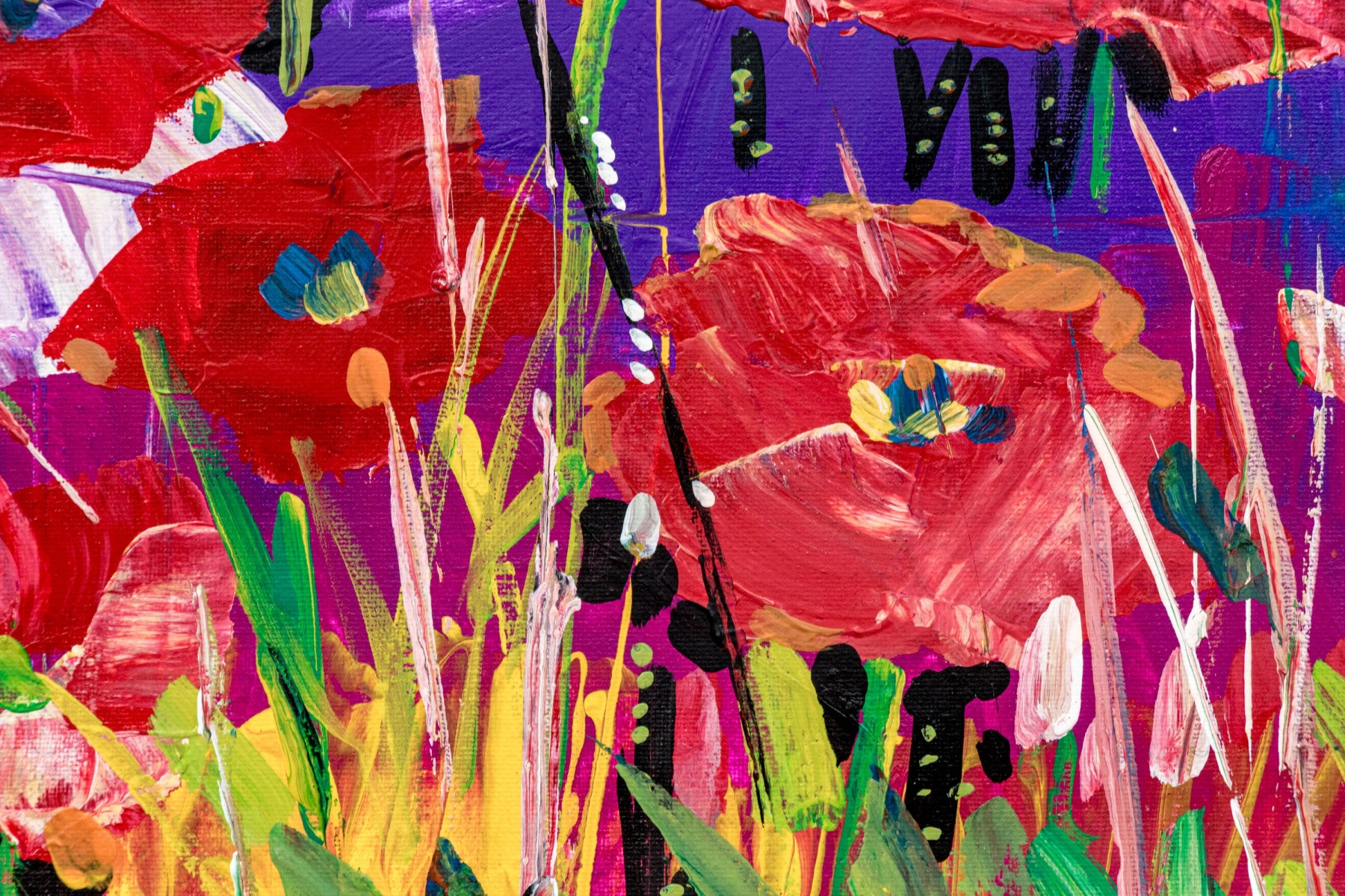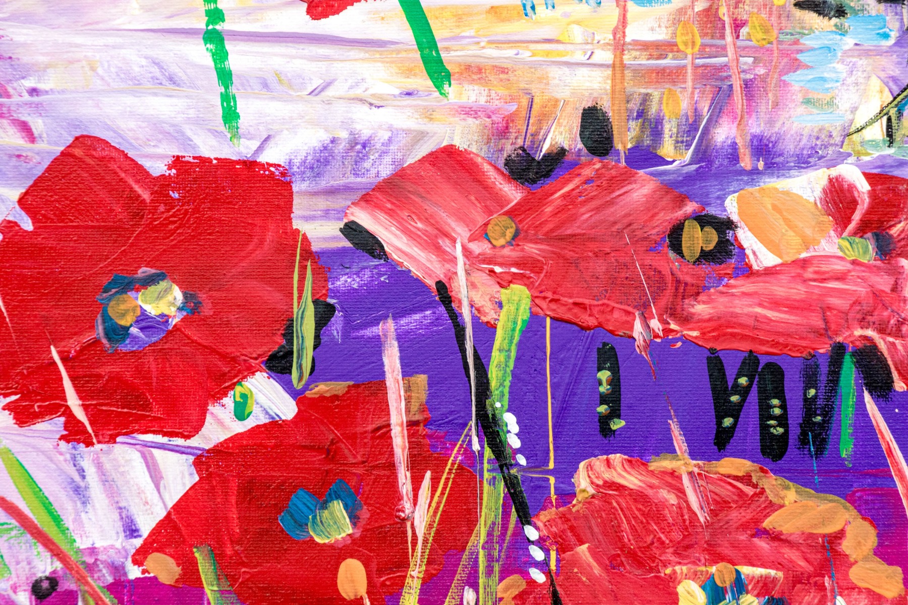 Signed lower right. A fabulous and brilliant acrylic on canvas painting depicting poppy flowers in red appearing fully in bloom amongst an Expressionist style landscape.