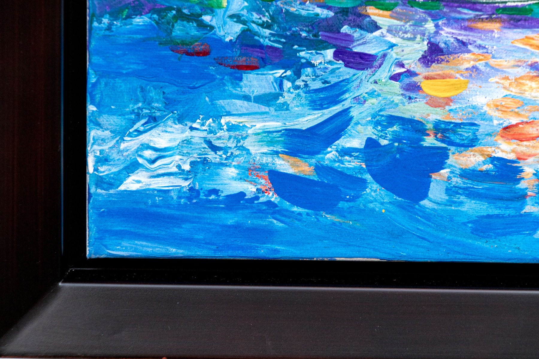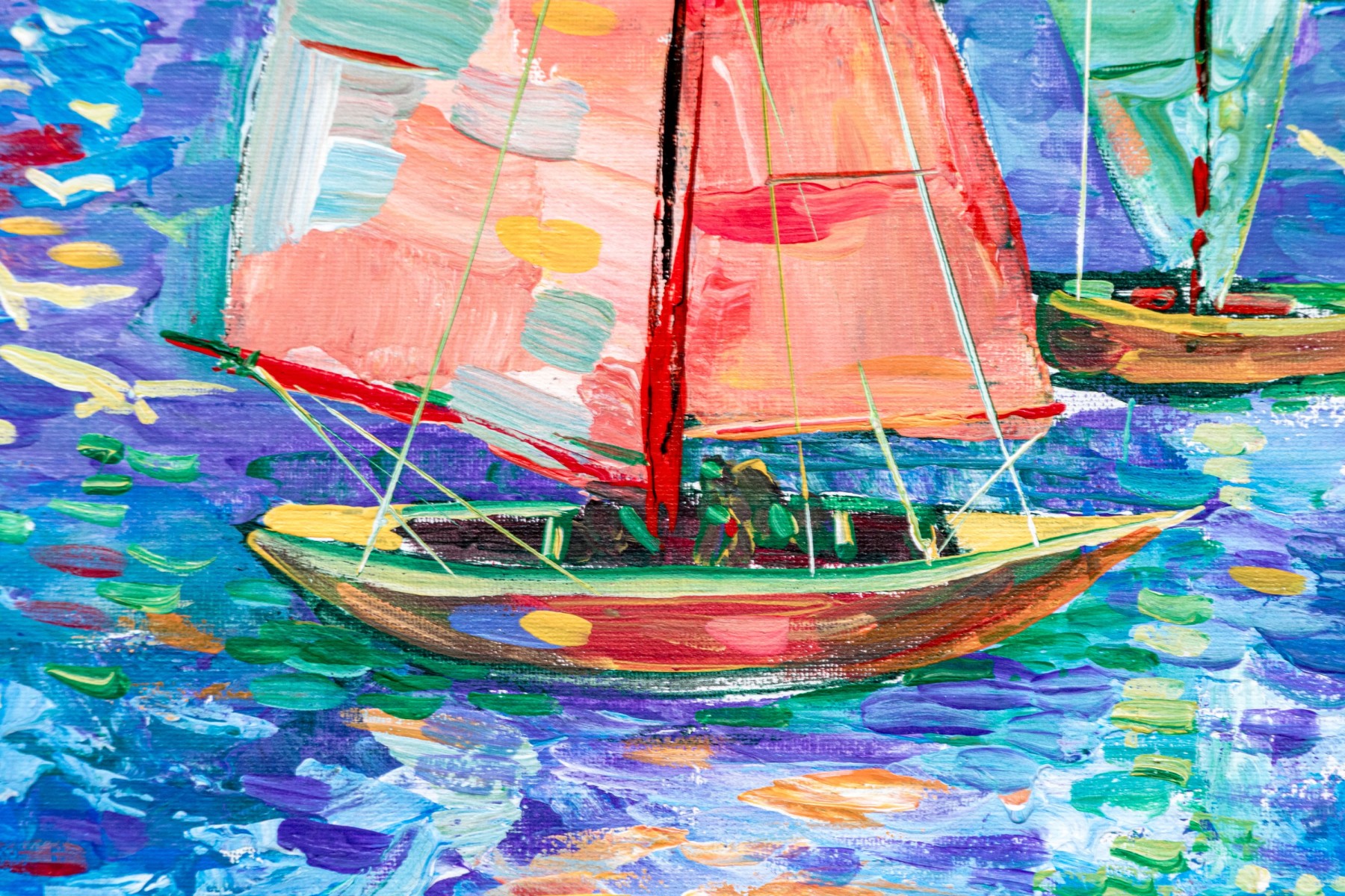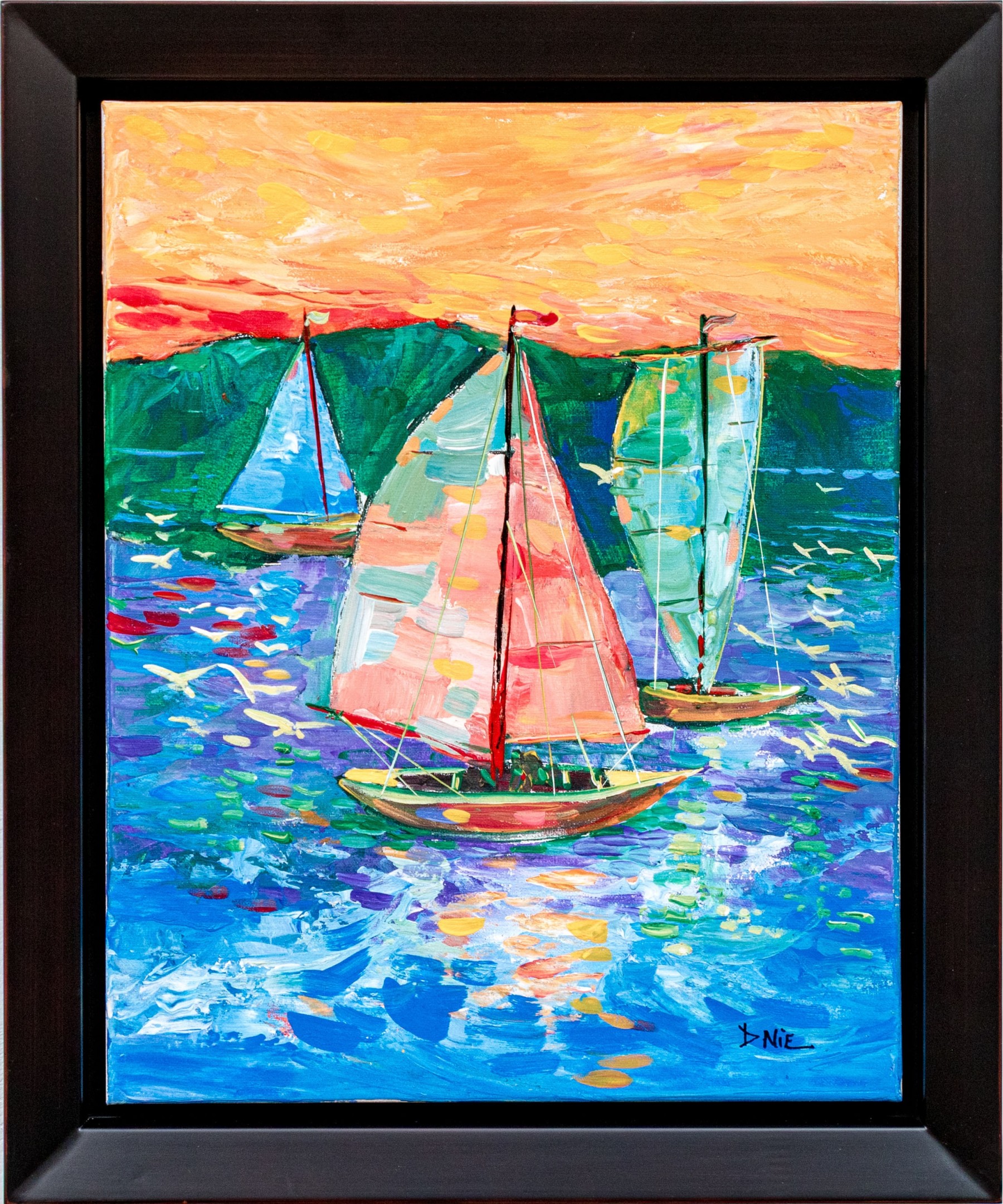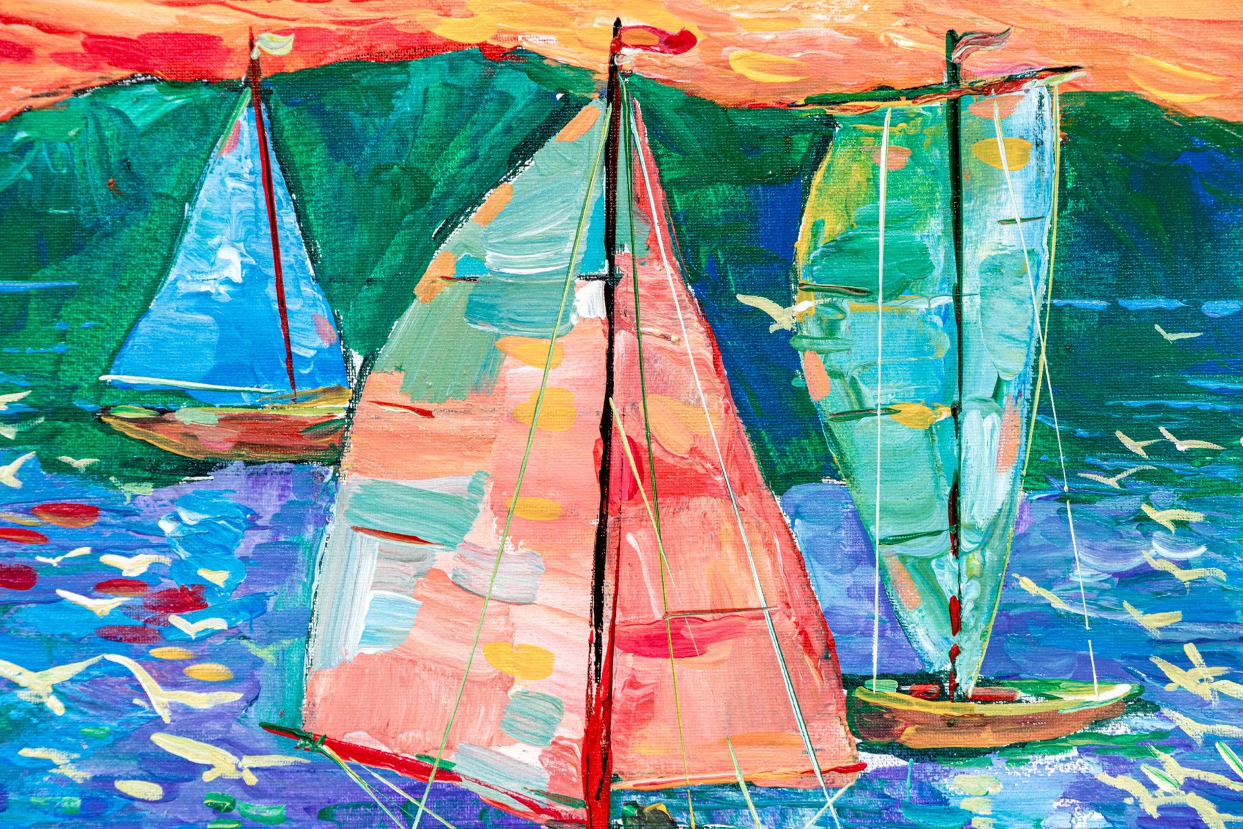 Signed lower right. The acrylic on canvas depicts a vibrant scene with three sailboats sailing in a landscape with green grassy hill in the background and vibrant orange-red sky above. The sailboats appear to be racing, which gives the painting its title, "Regatta"
