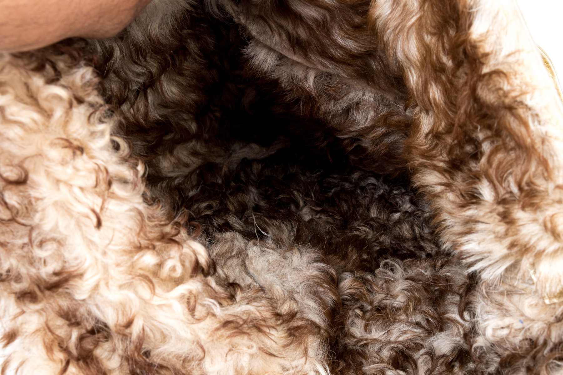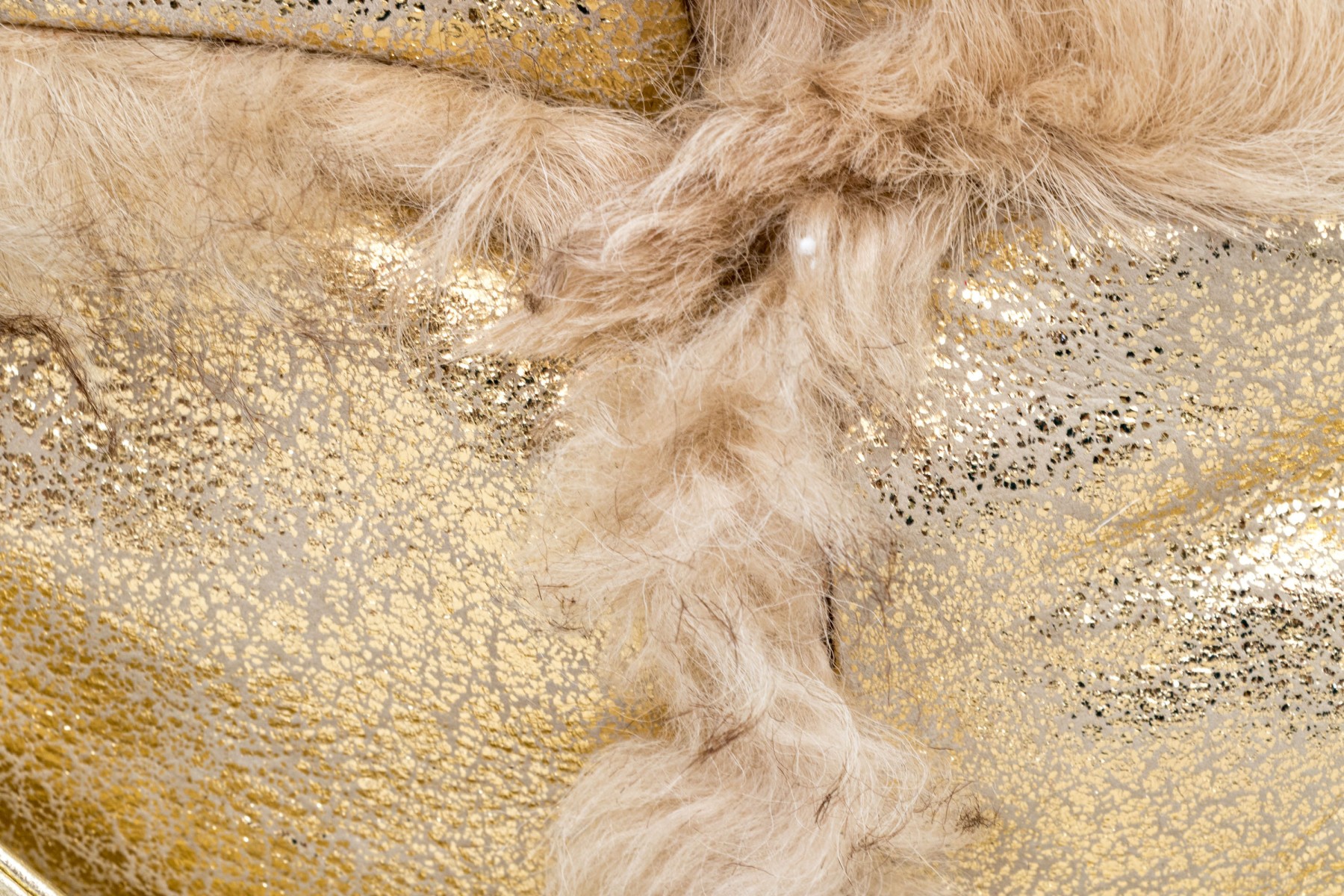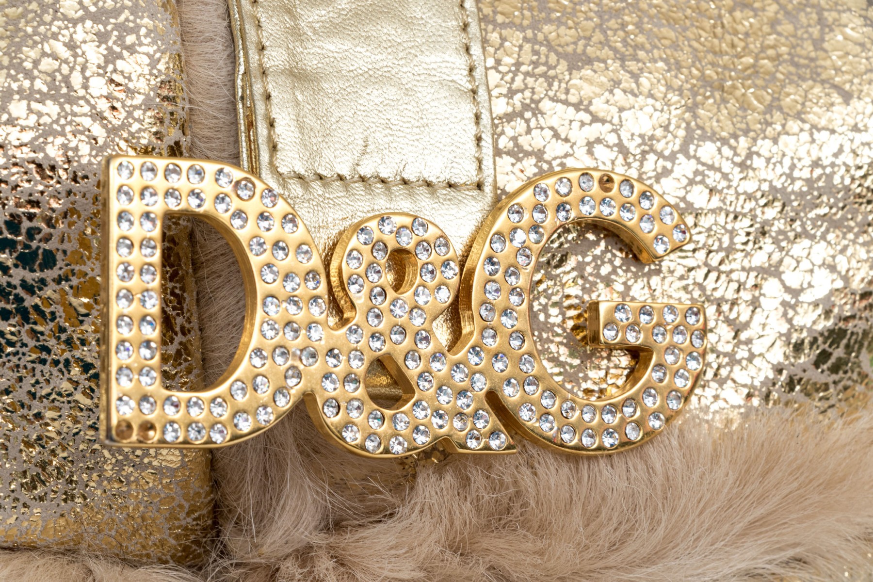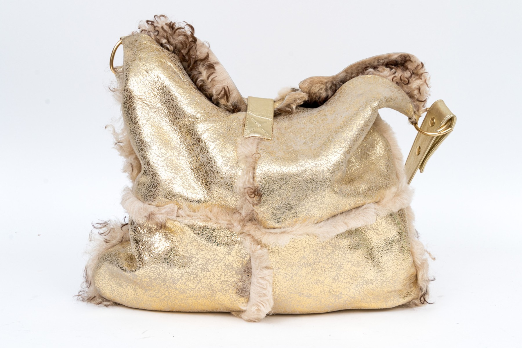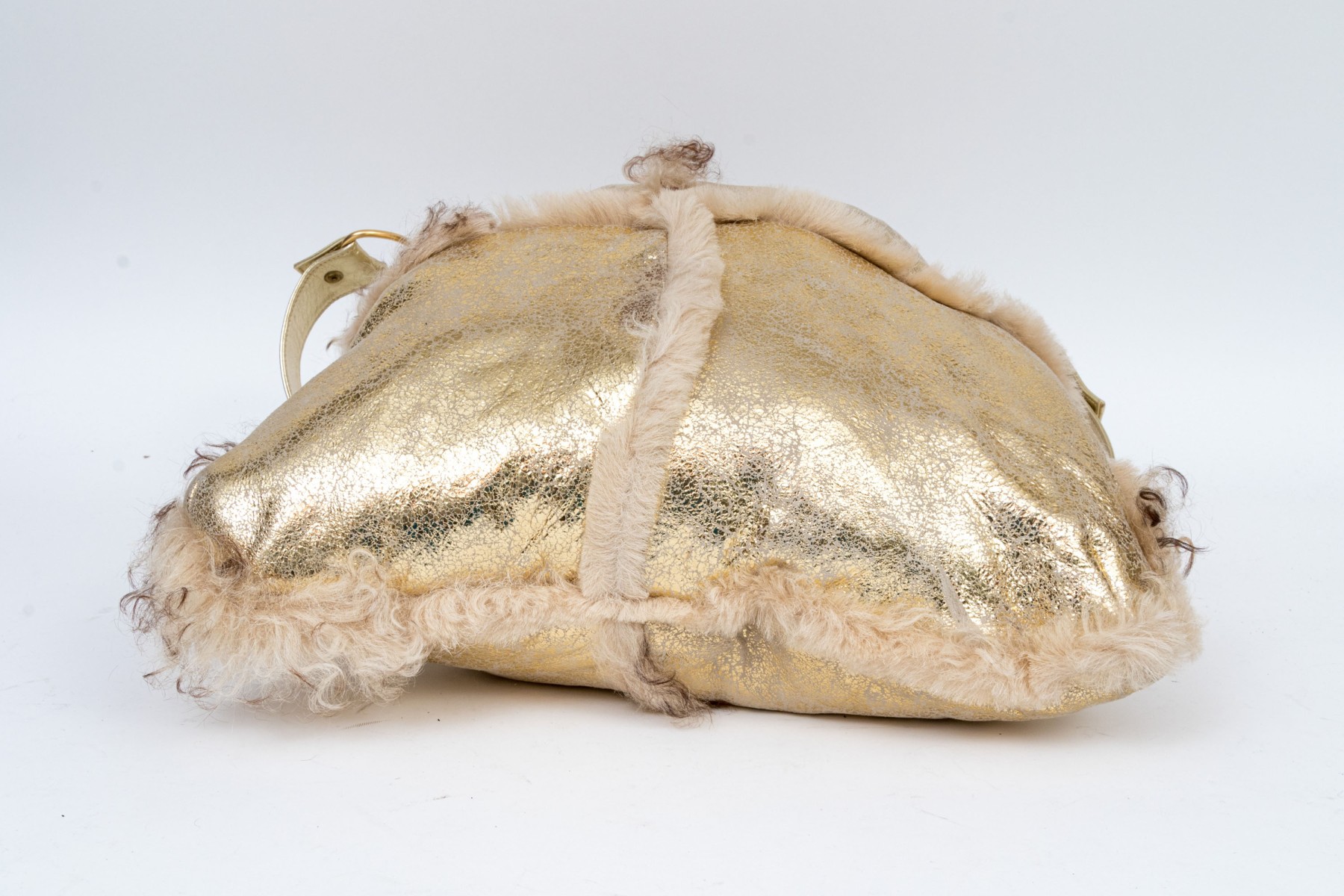 A chc Dolce & Gabbana hobo bag in golden sheepskin with shearling seams, adorned with a rhinestone logo flap closure. Lined in lush brown and white shearling for a luxurious finish.