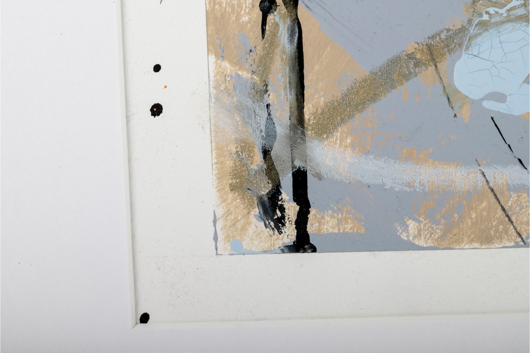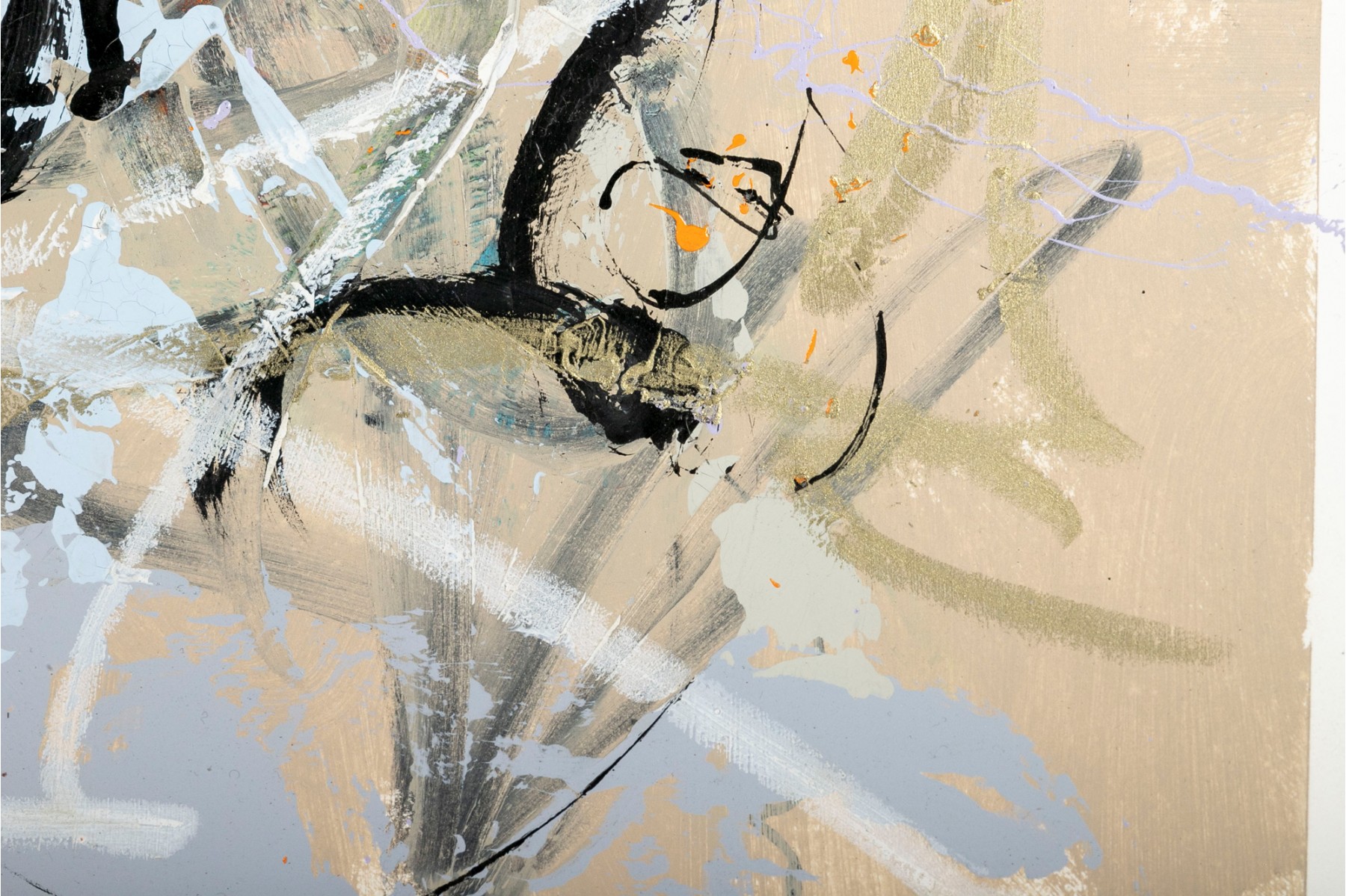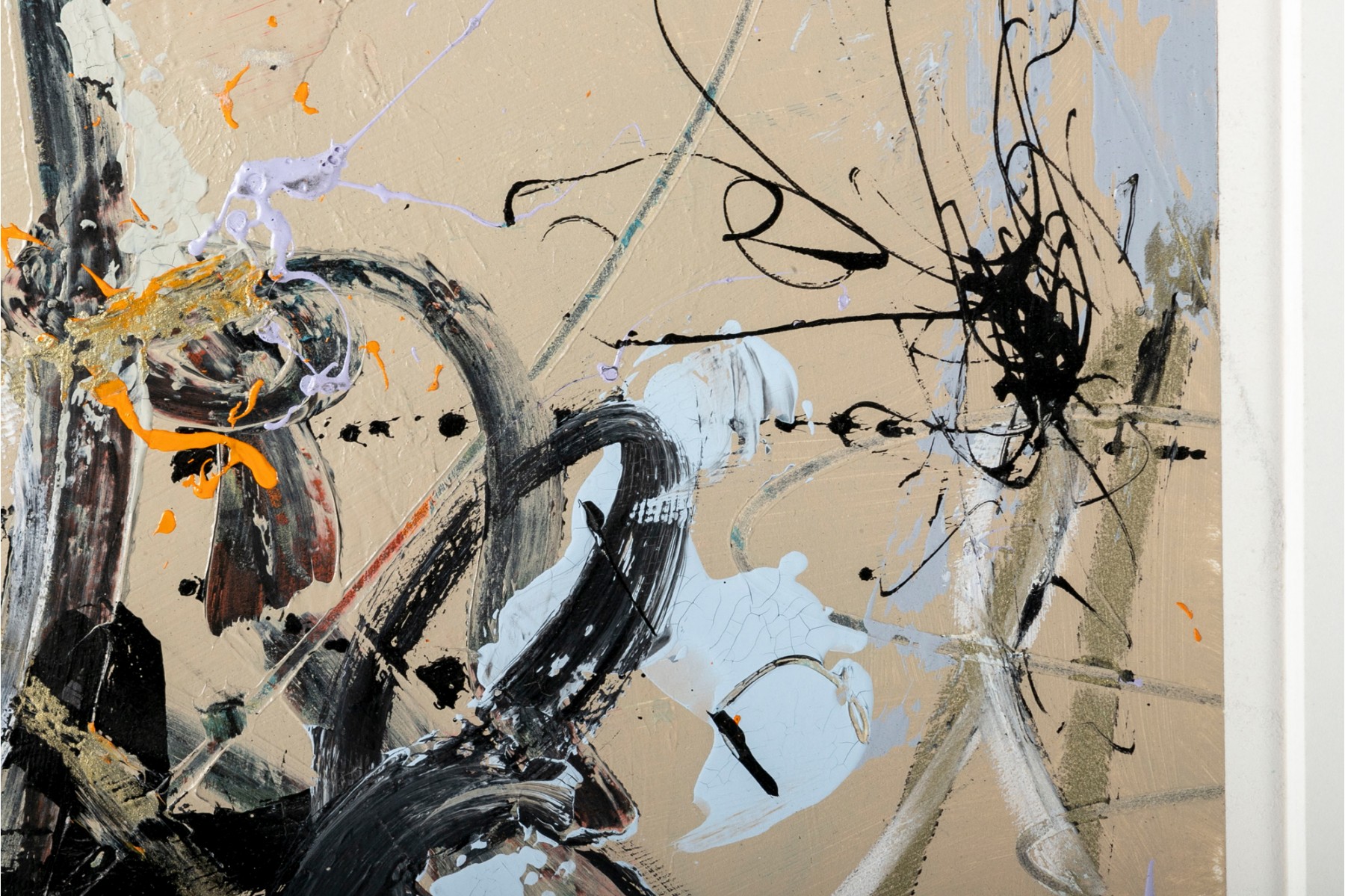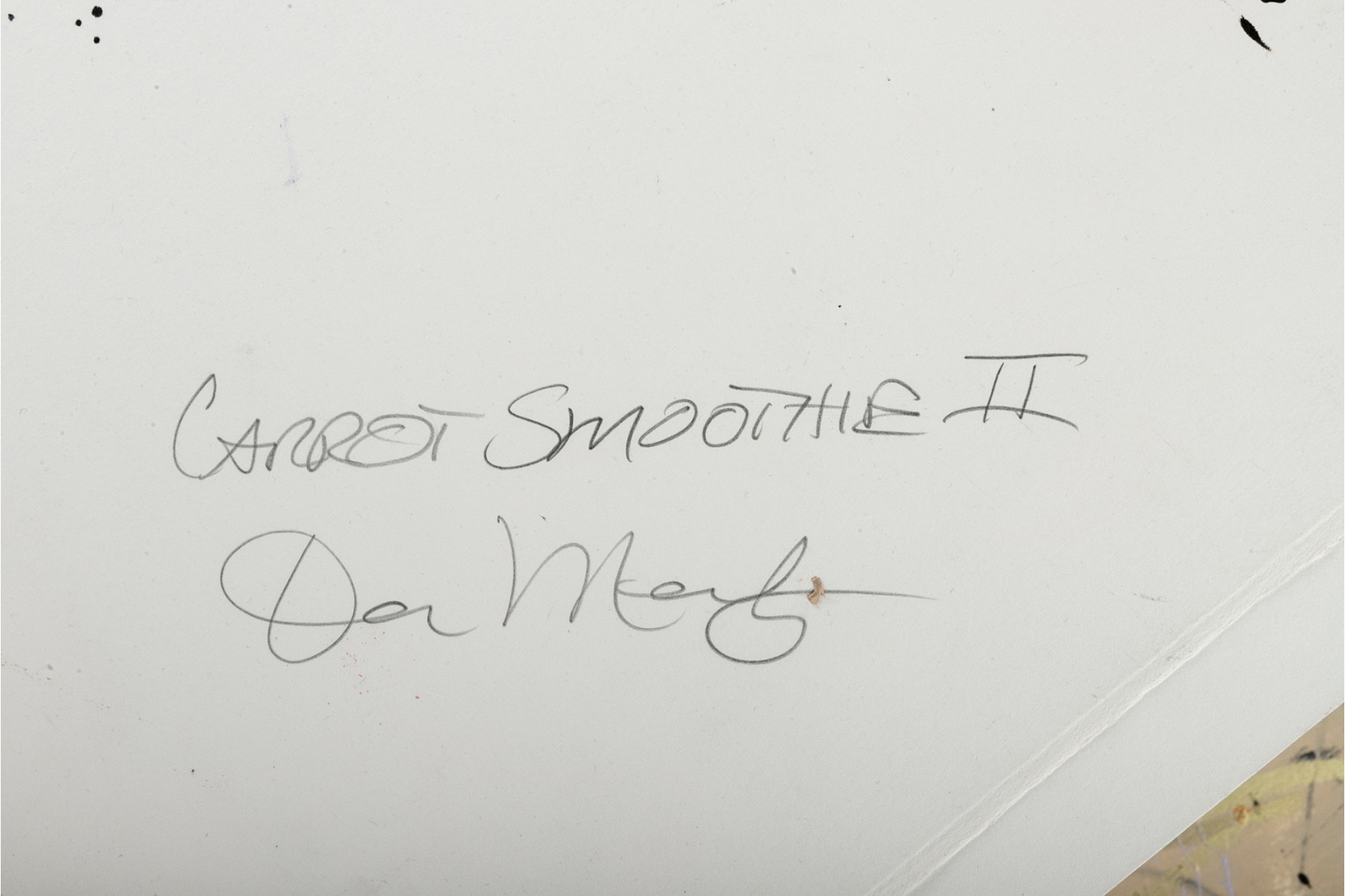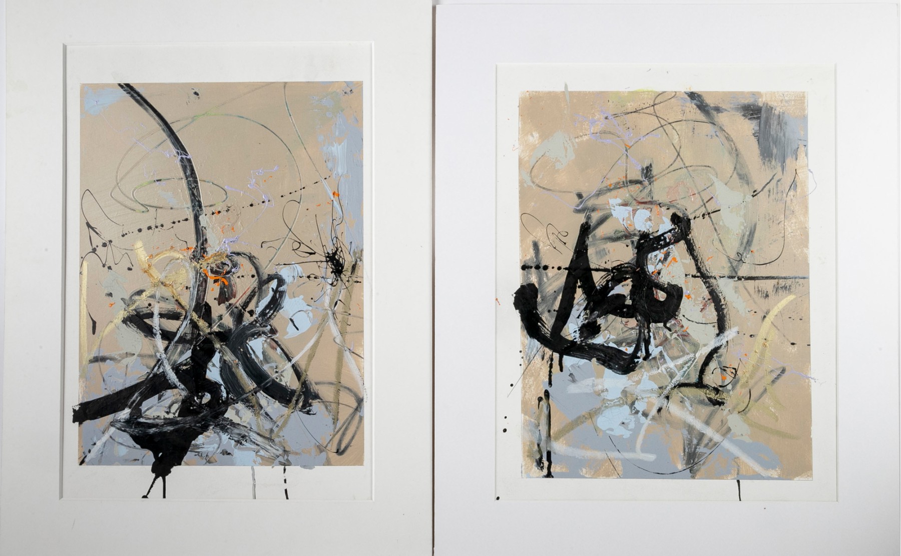 Don Mertz (American [NC], 20th C.) "Carrot Smoothie I" and "Carrot Smoothie II" acrylic on paper displaying gestural blends of black, metallic gray, and metallic yellow against metallic beige-gilt with splattered hints of vibrant purple and orange. Pencil signed and titled on the versos. Displayed with white mats, unframed.