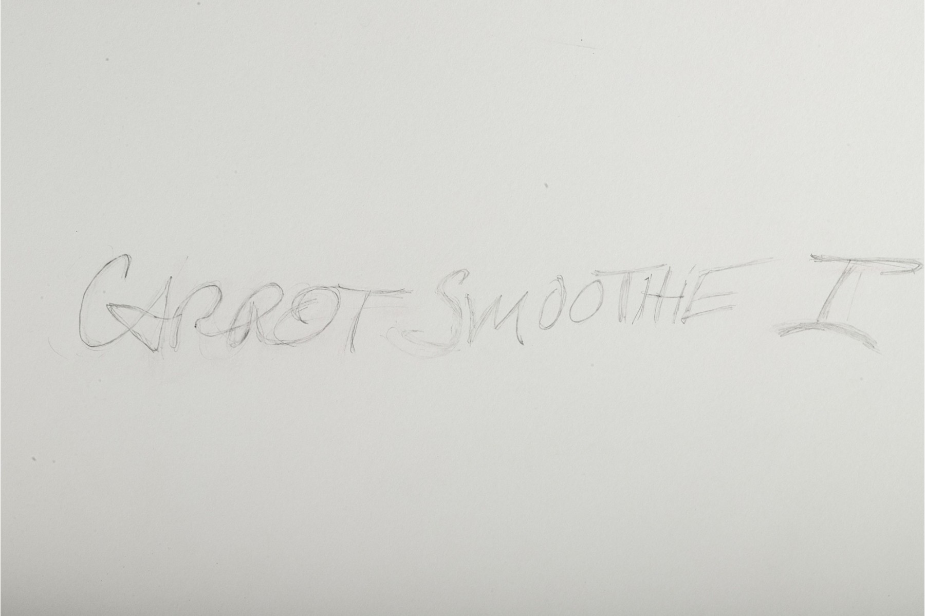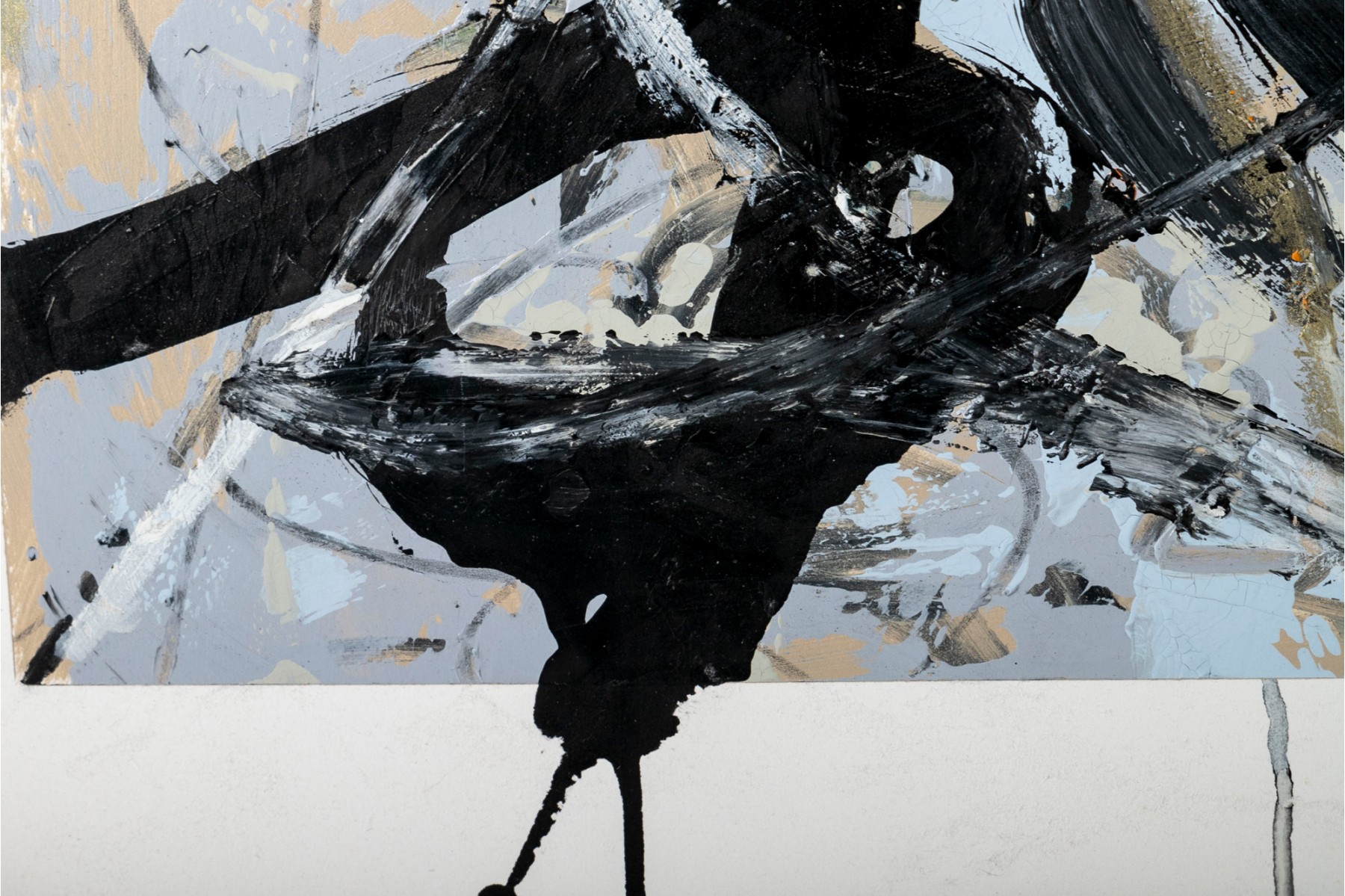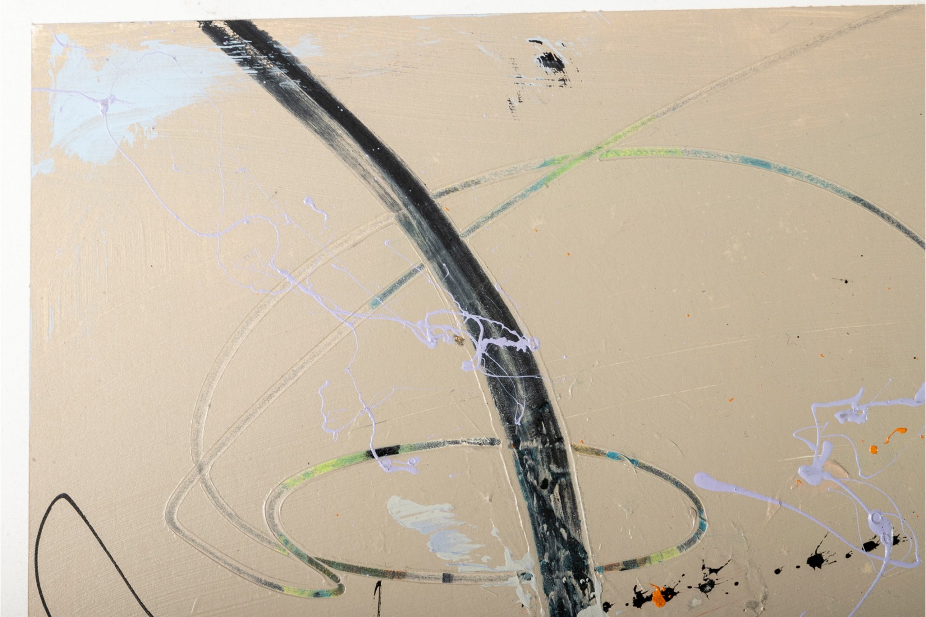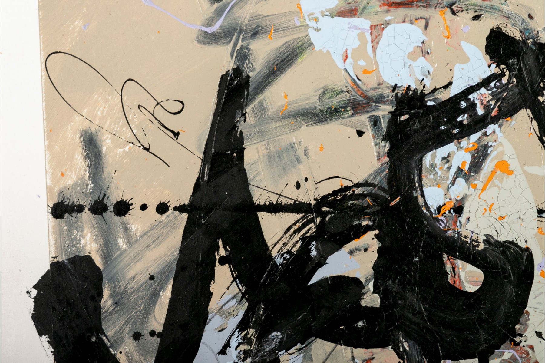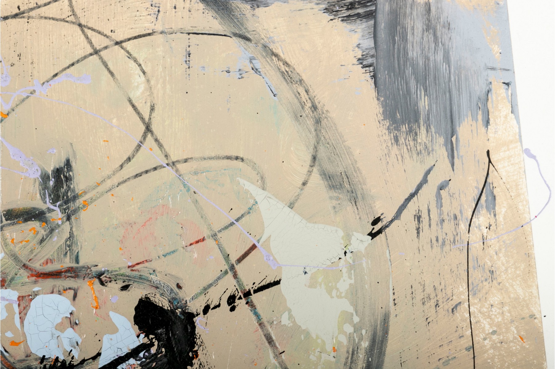 Don Mertz (American [NC], 20th C.) "Carrot Smoothie I" and "Carrot Smoothie II" acrylic on paper displaying gestural blends of black, metallic gray, and metallic yellow against metallic beige-gilt with splattered hints of vibrant purple and orange. Pencil signed and titled on the versos. Displayed with white mats, unframed.