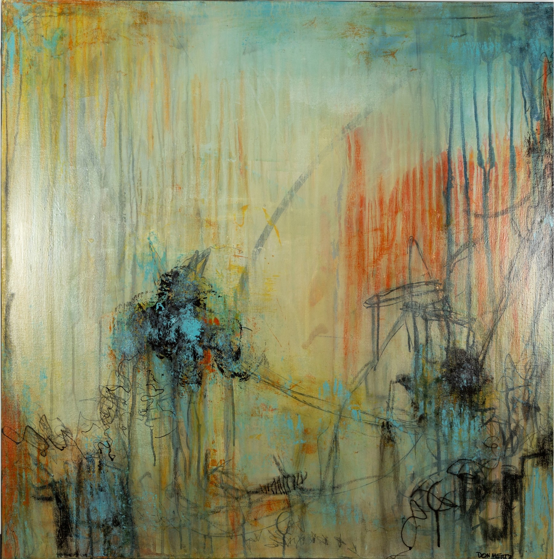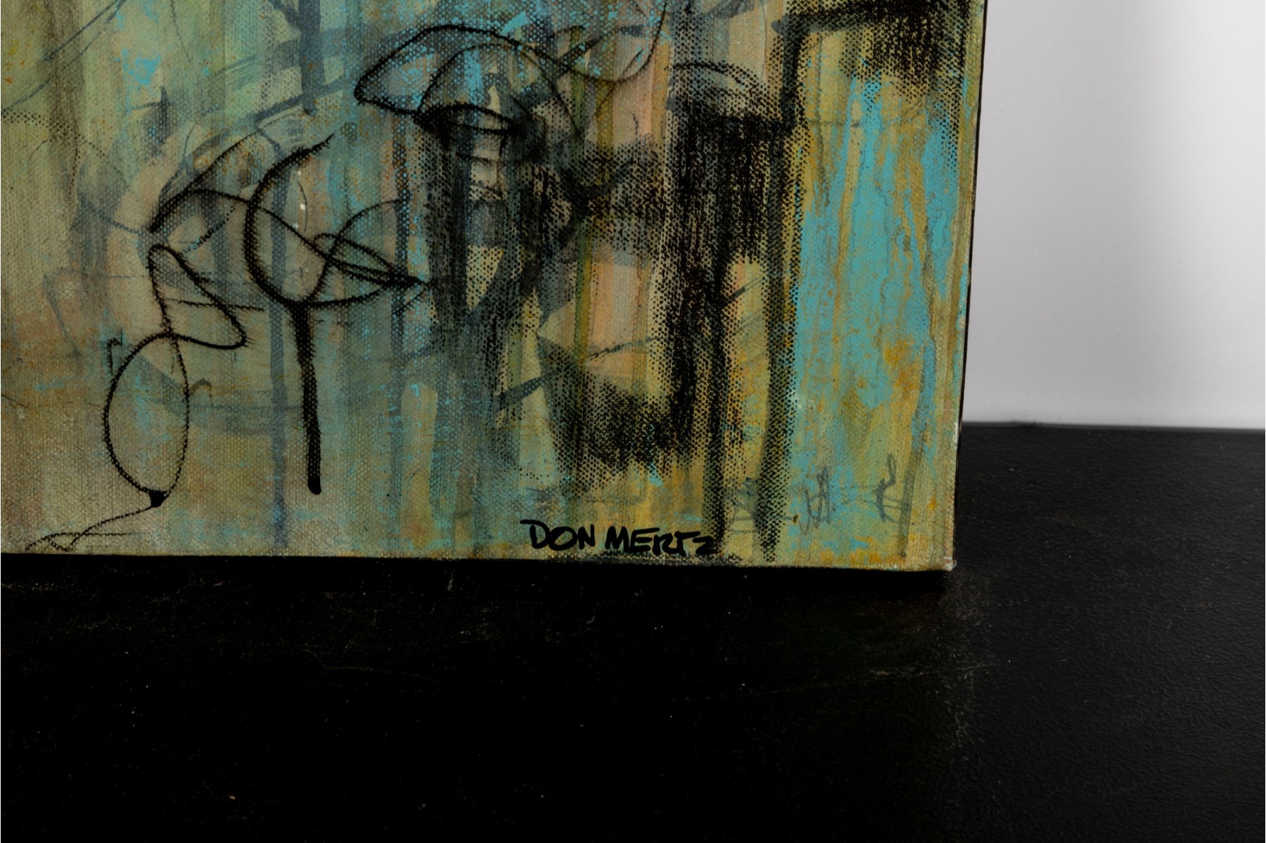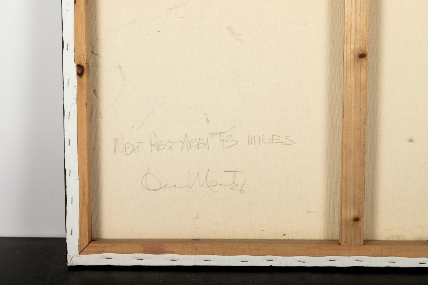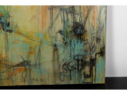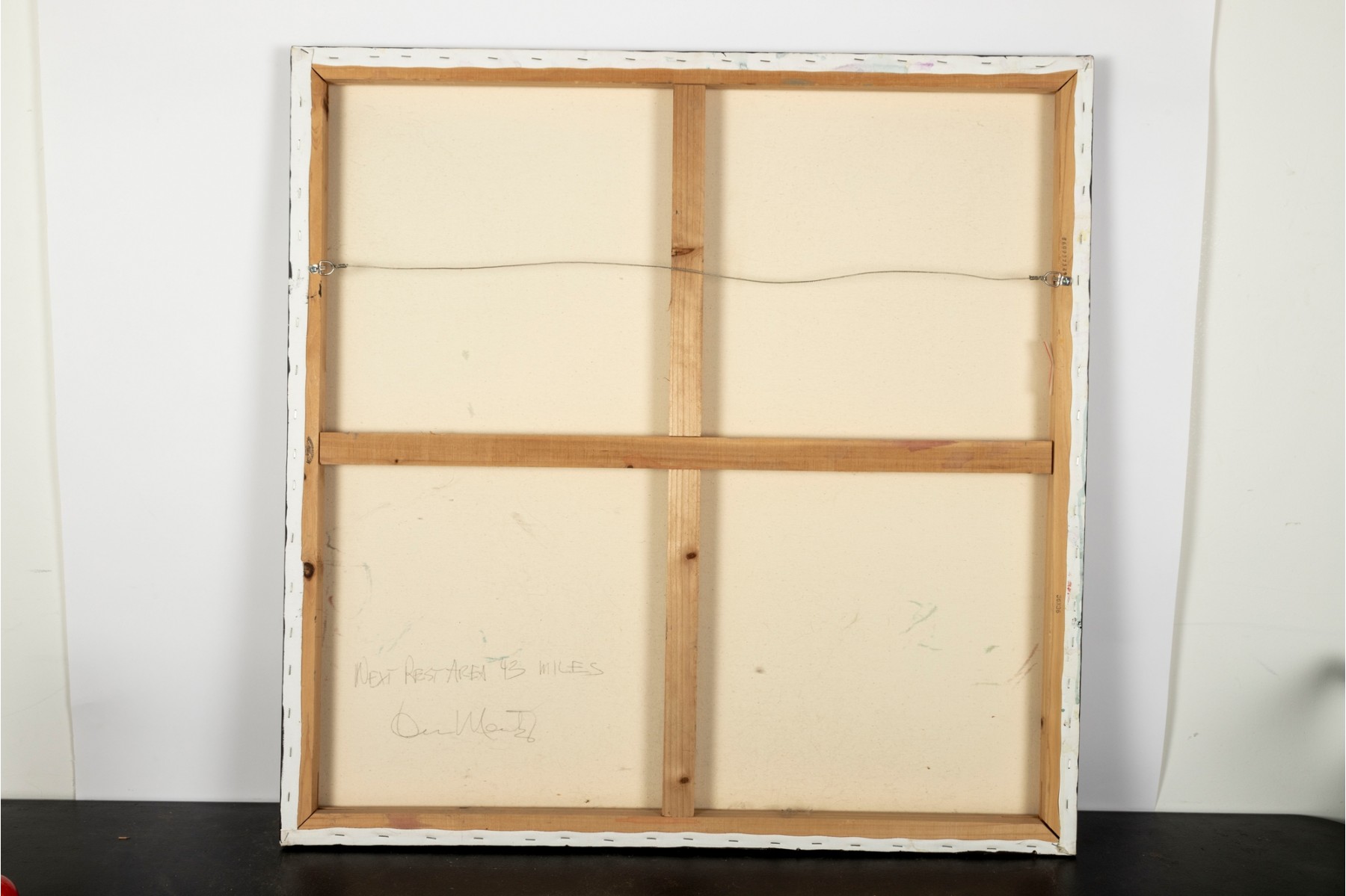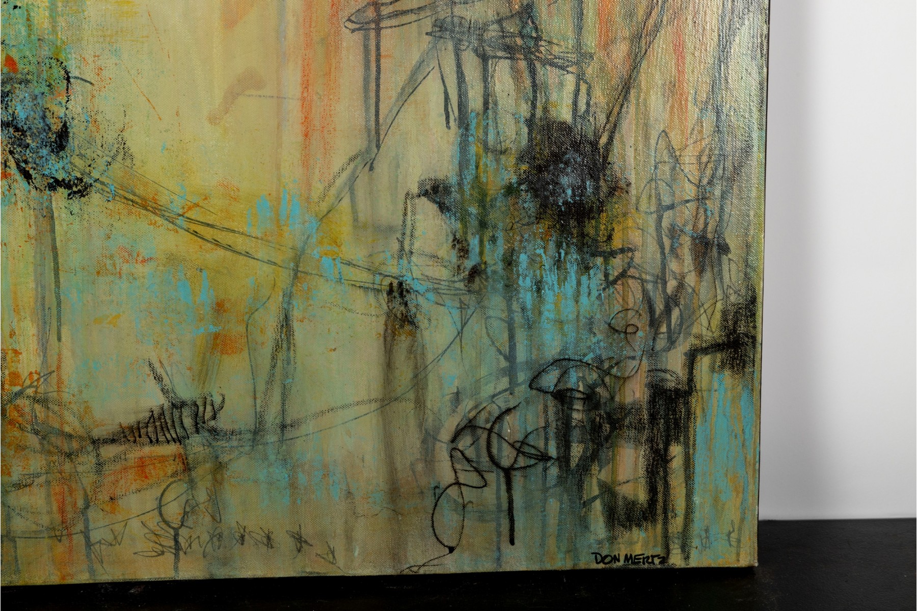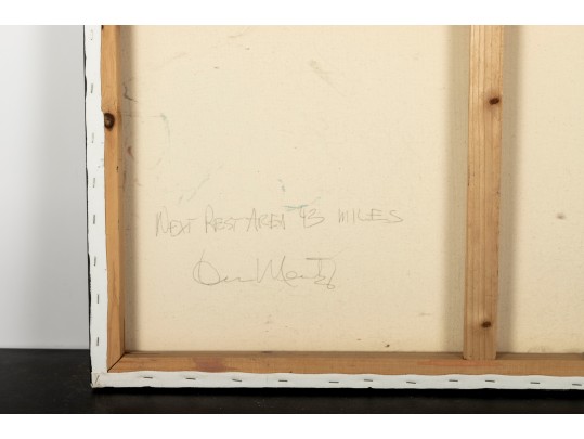 Don Mertz (American [NC], 20th C.) "Next Rest Area 43 Miles" acrylic on canvas featuring an abstract composition with striated hues of yellow, blue, and orange against a light yellow ground accented with gestural linework and textural blue and black forms. Signed and titled on the verso. The canvas is mounted to a stretcher, unframed.