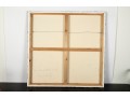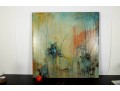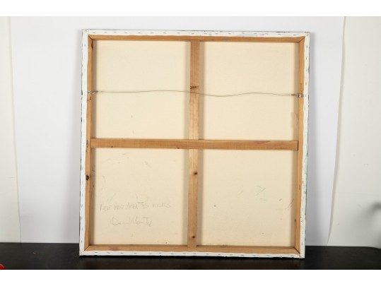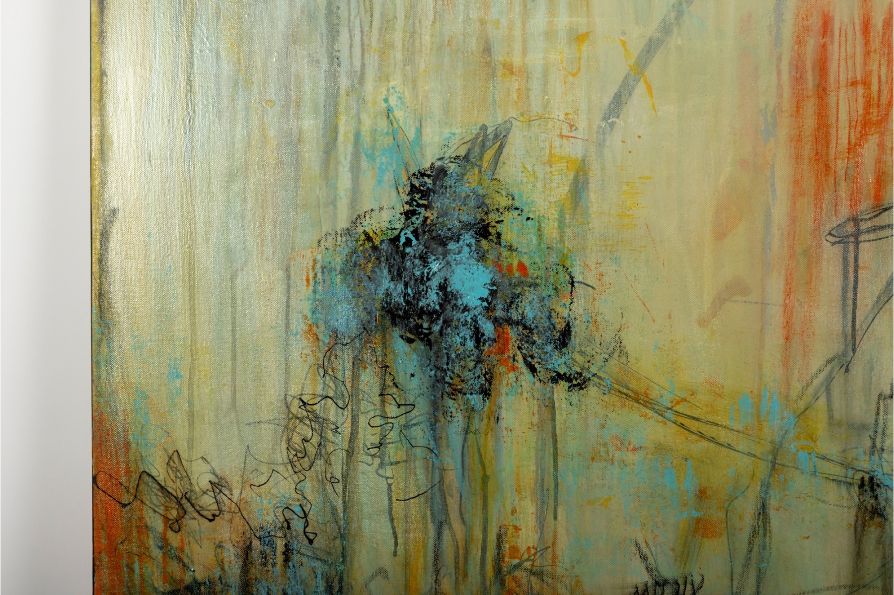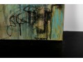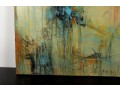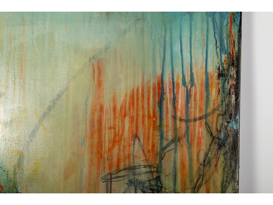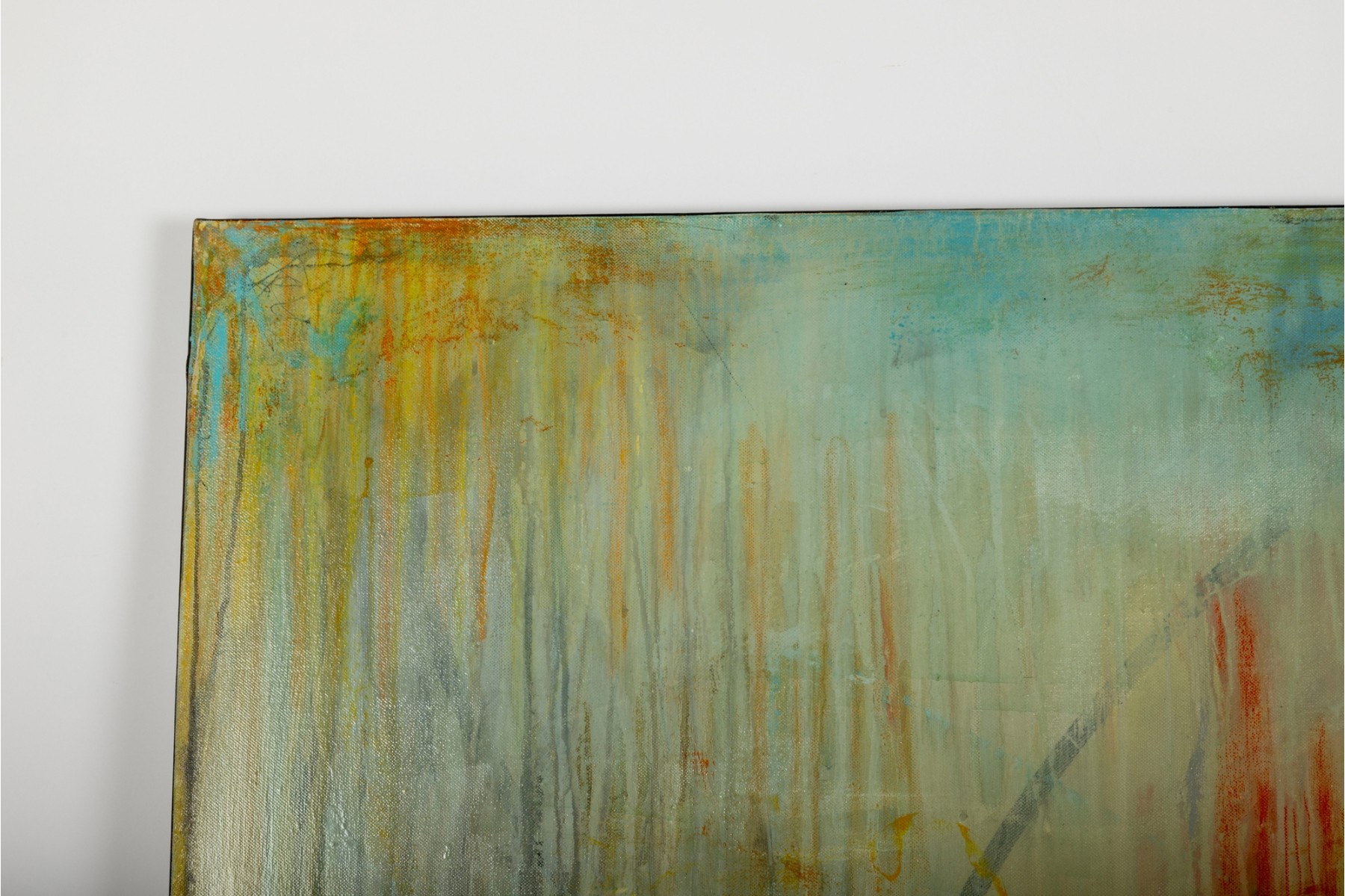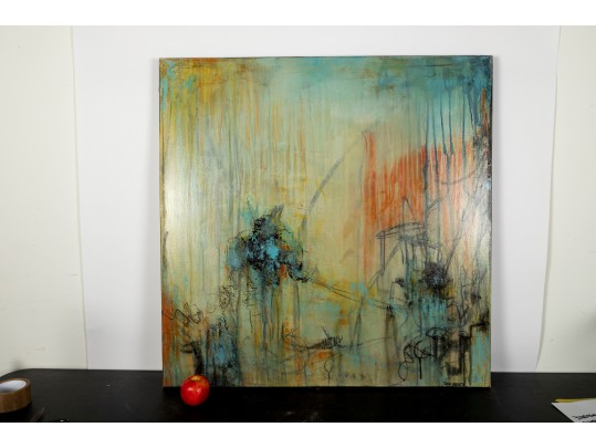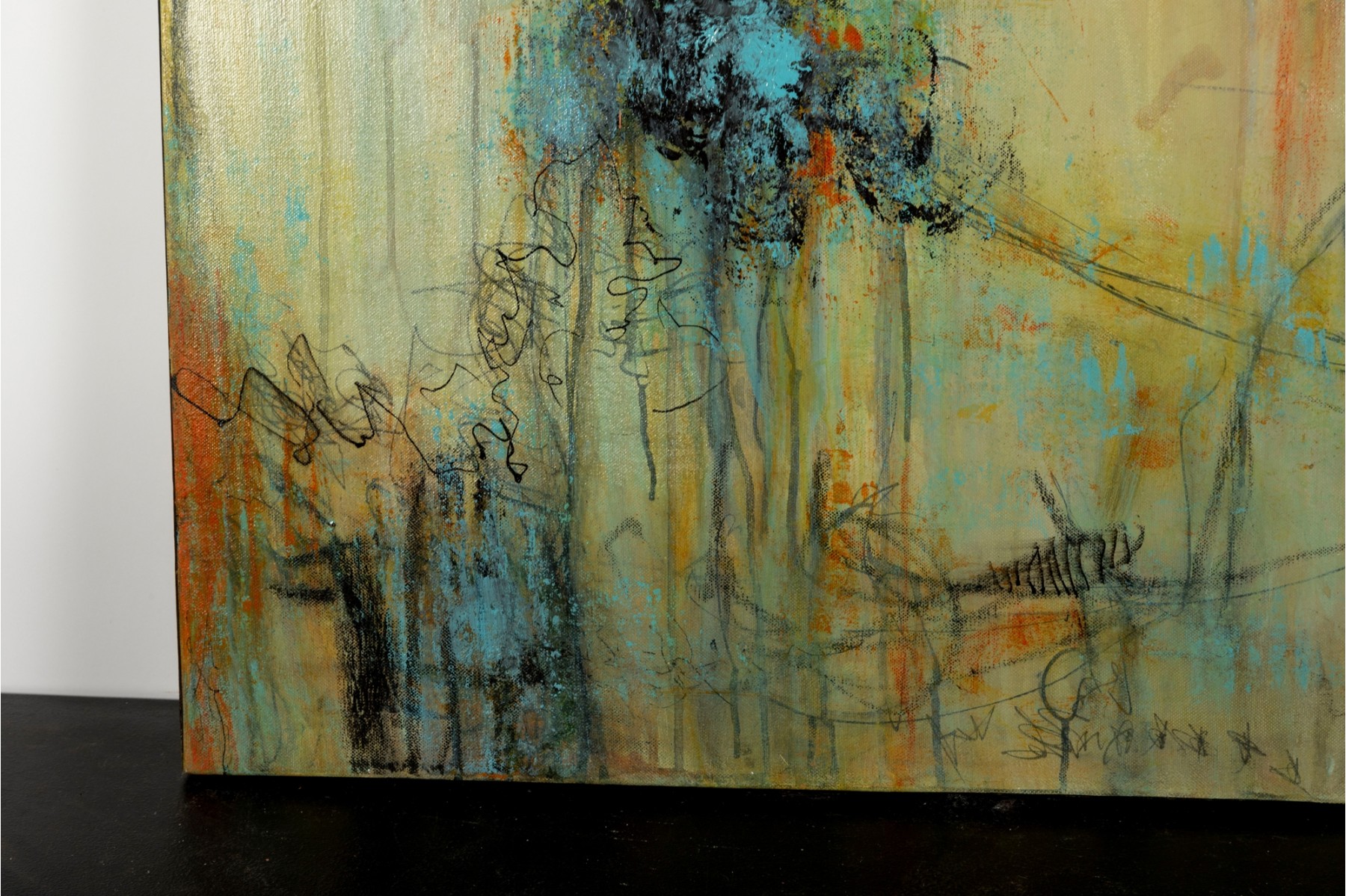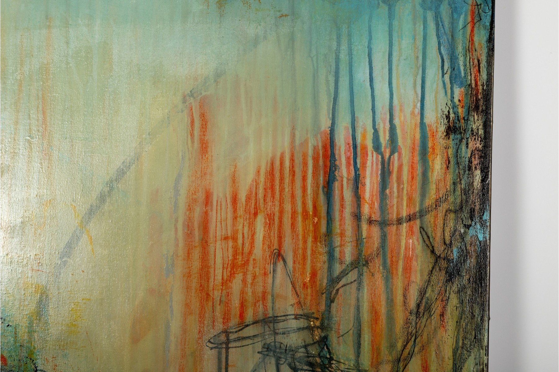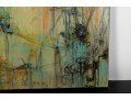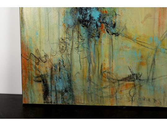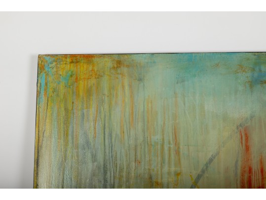 Don Mertz (American [NC], 20th C.) "Next Rest Area 43 Miles" acrylic on canvas featuring an abstract composition with striated hues of yellow, blue, and orange against a light yellow ground accented with gestural linework and textural blue and black forms. Signed and titled on the verso. The canvas is mounted to a stretcher, unframed.