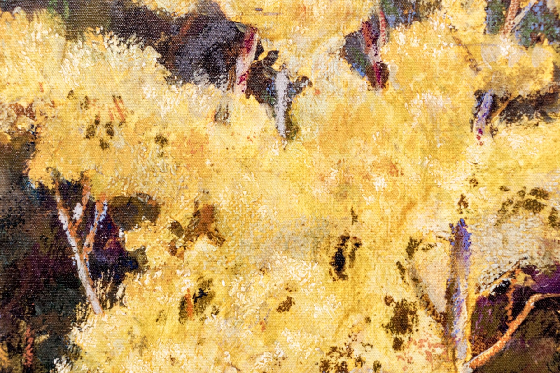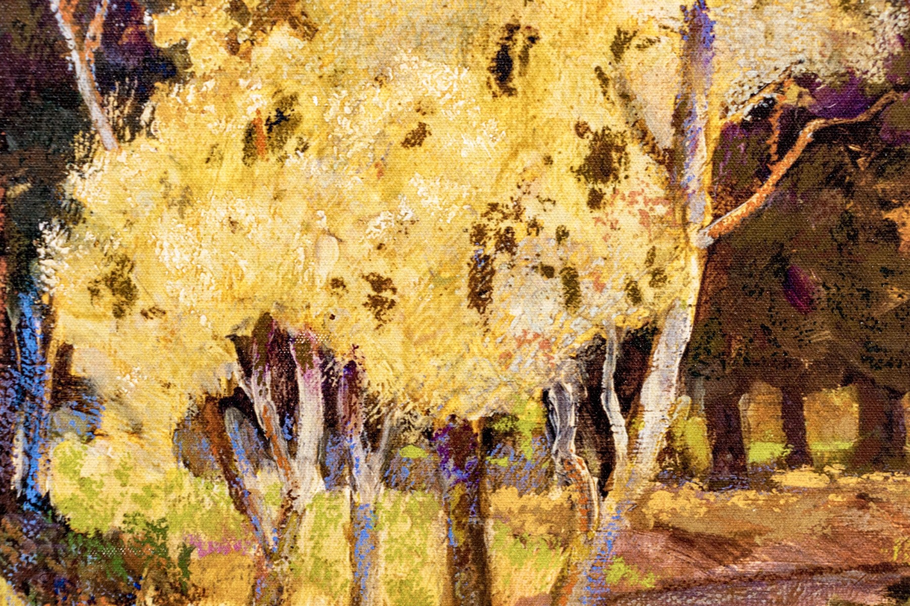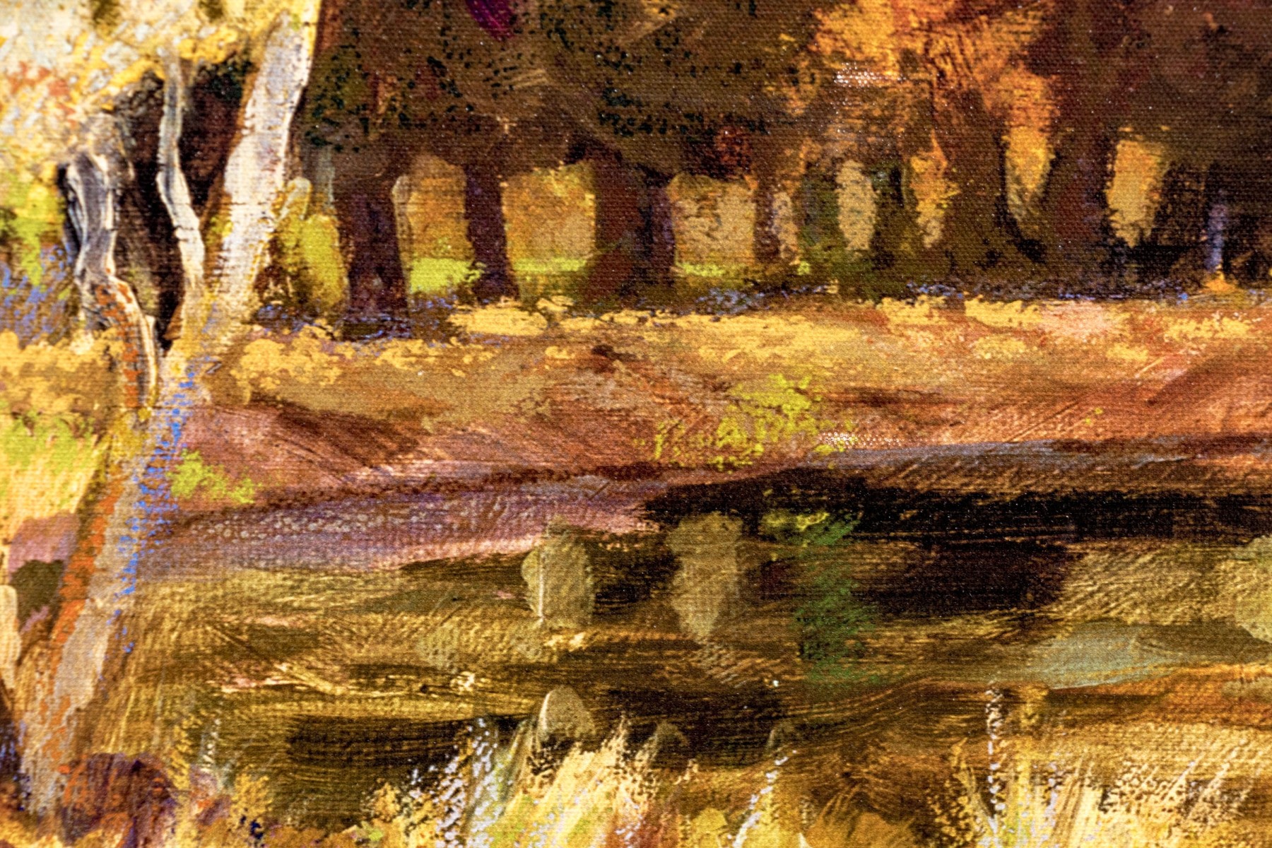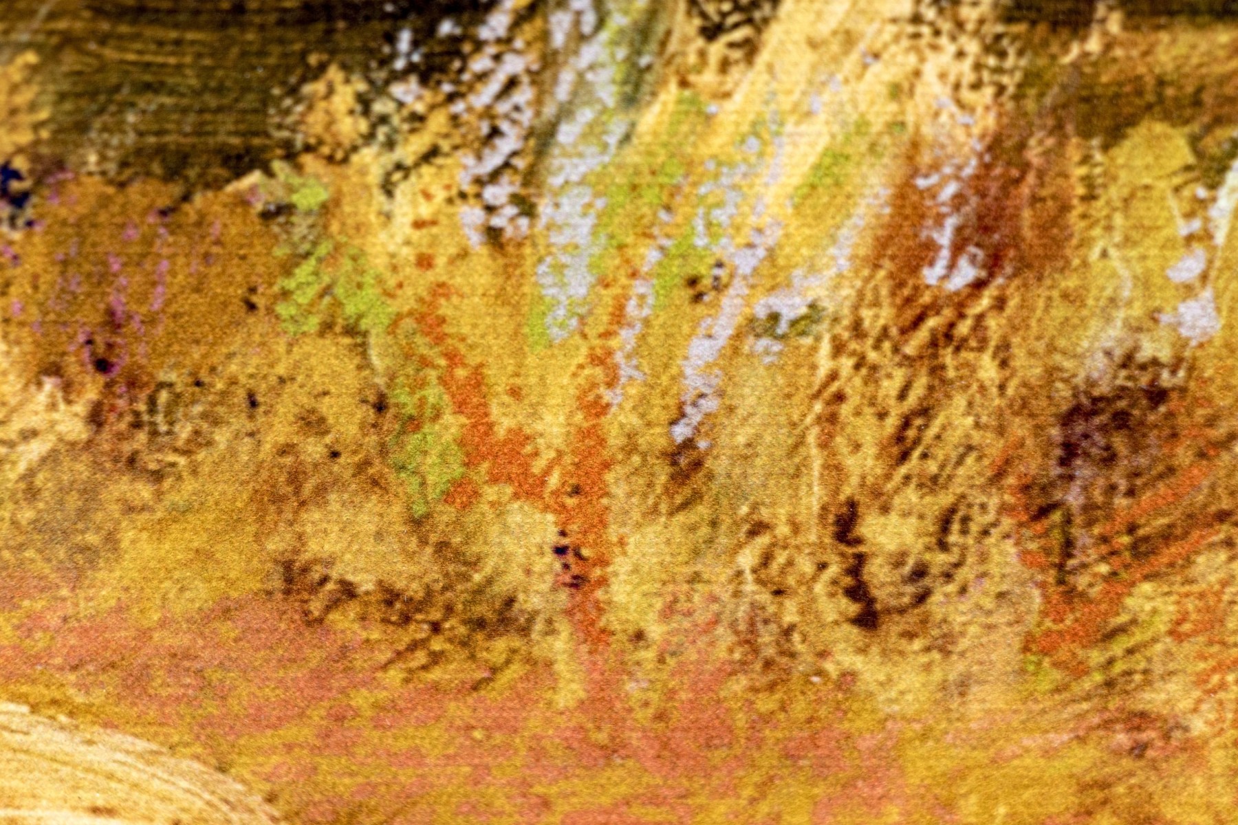 The Impressionist style giclee on canvas depicts a serene autumnal landscape with trees having polychromatic foliage ranging from bright yellows and lush oranges to evergreen trees with green bristles.