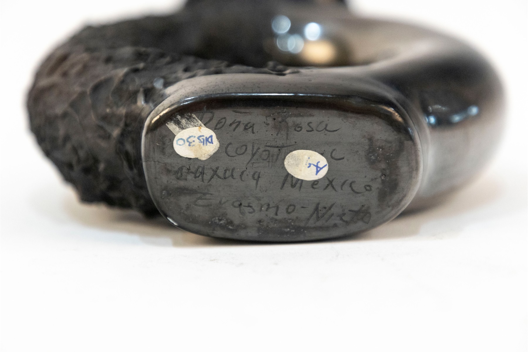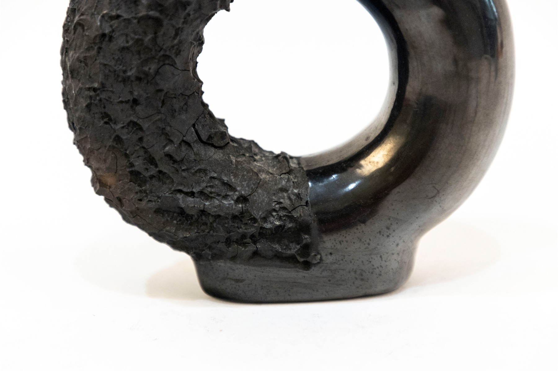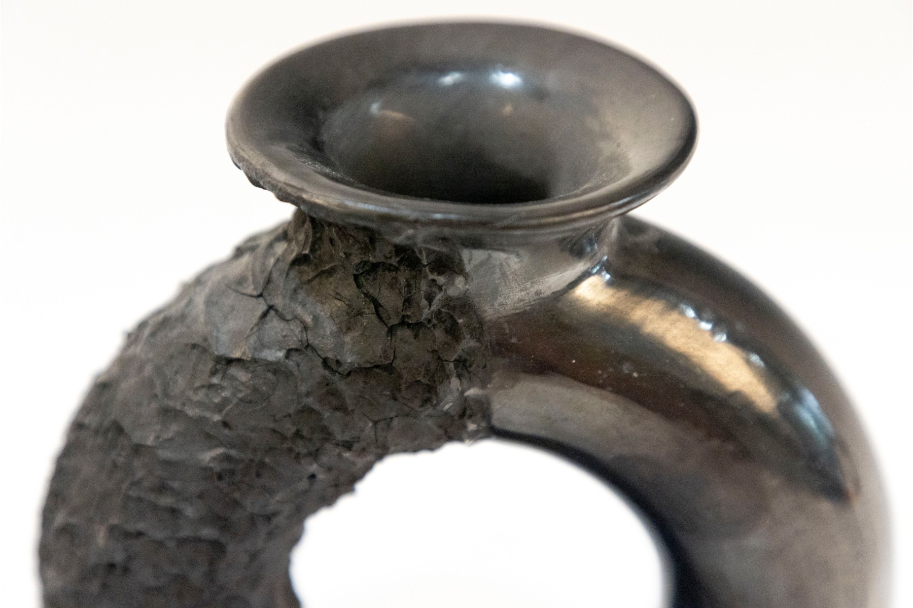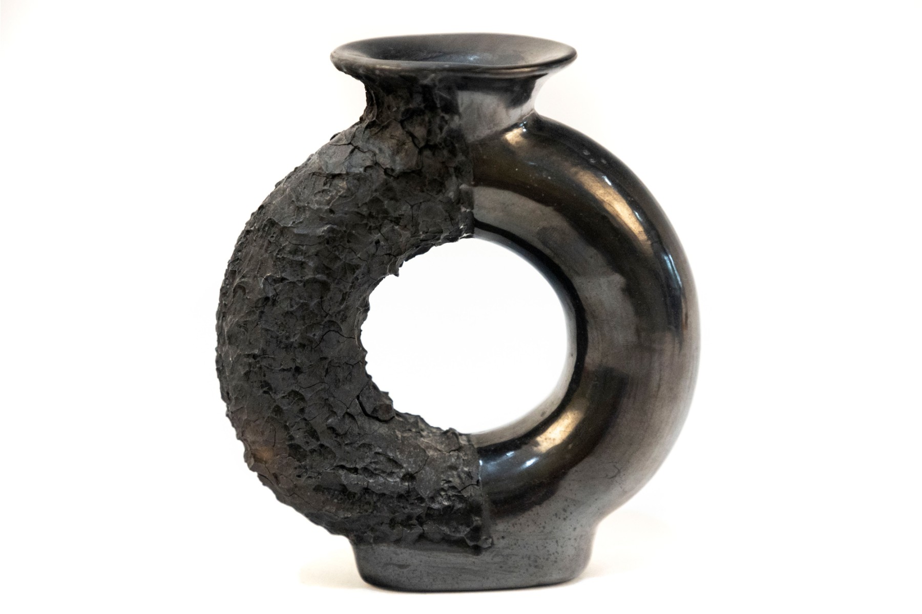 Dona Rosa is noted for inventing a new local pottery type entitled, "Barro Negro" or simply "Black Pottery" specific to Oaxaca, Mexico — and is known for its alluring glossy sheen. Shown here is a unique example in the form of a circular vase displaying blended textures, signed by Dona Rosa herself.