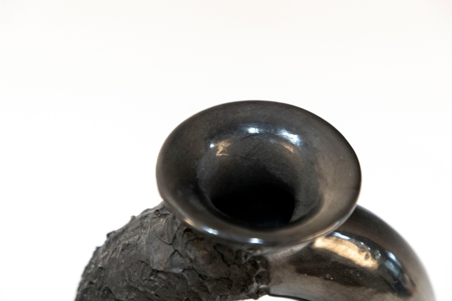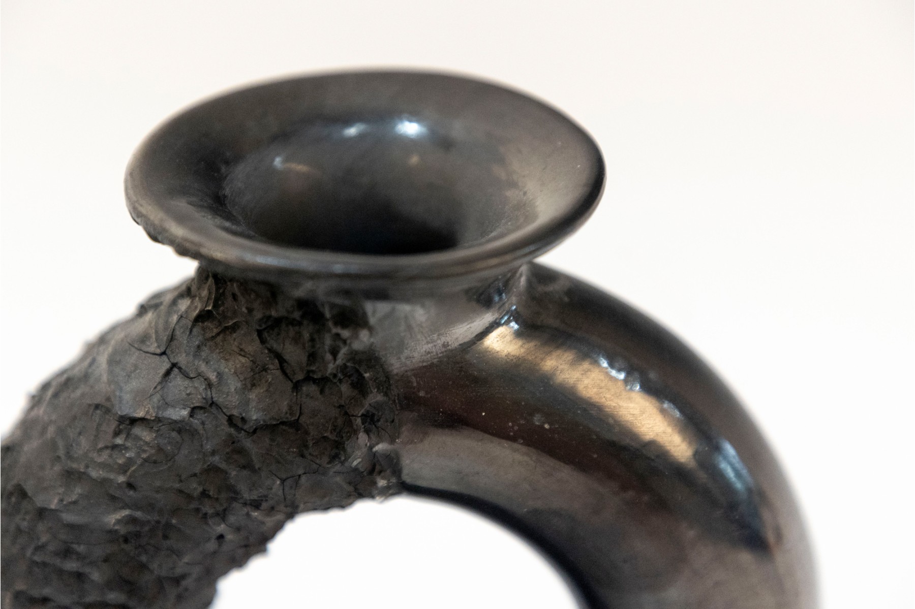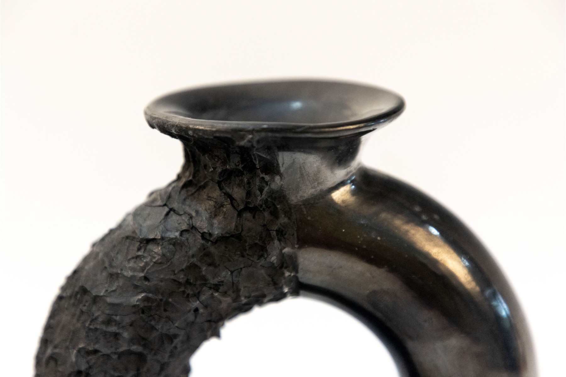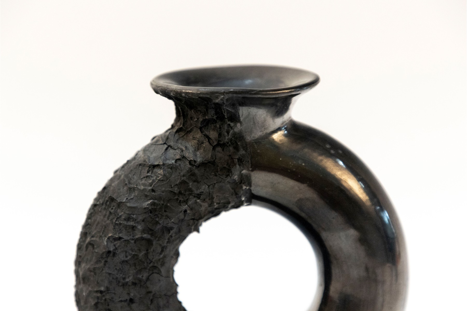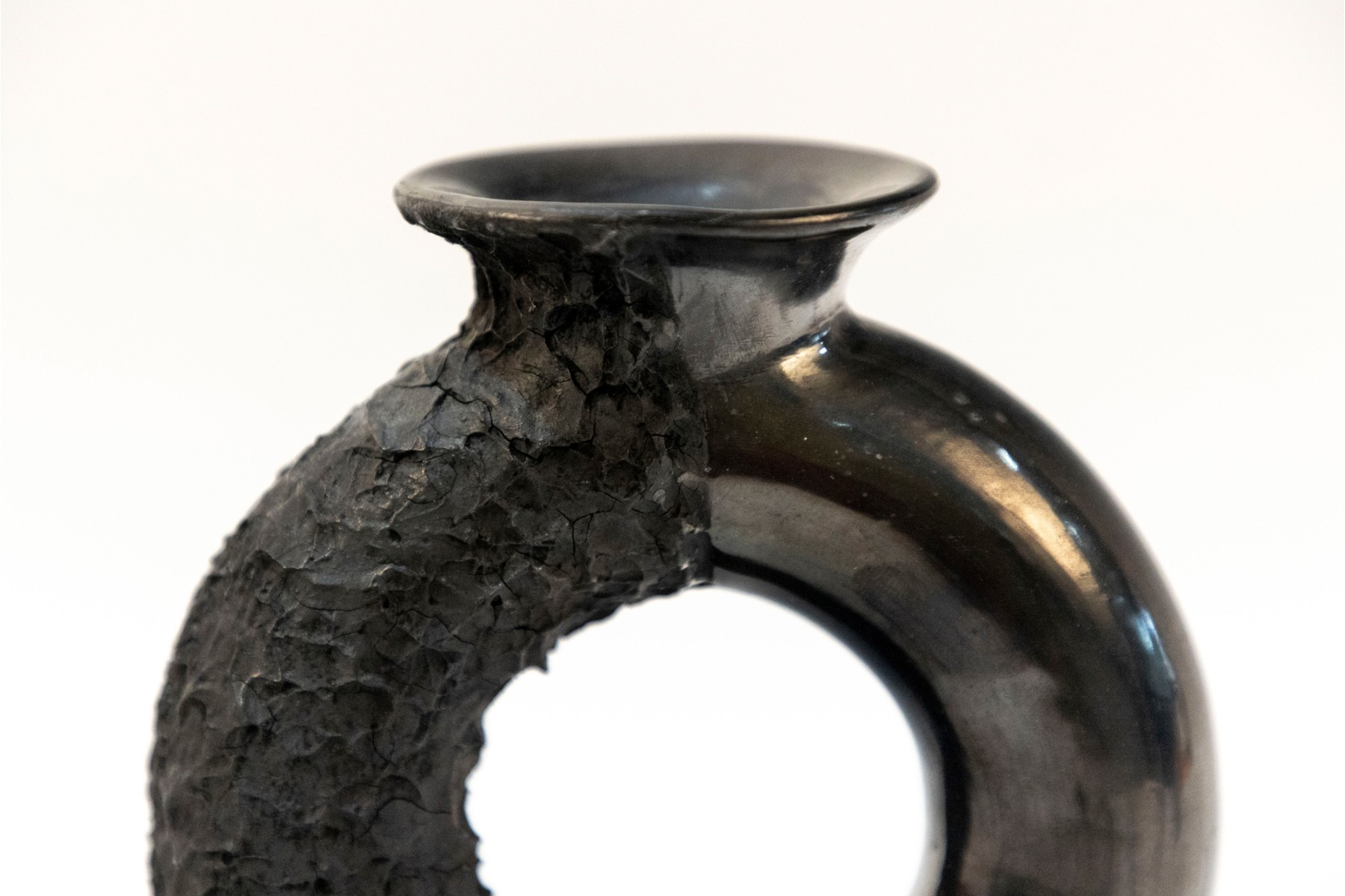 Dona Rosa is noted for inventing a new local pottery type entitled, "Barro Negro" or simply "Black Pottery" specific to Oaxaca, Mexico — and is known for its alluring glossy sheen. Shown here is a unique example in the form of a circular vase displaying blended textures, signed by Dona Rosa herself.