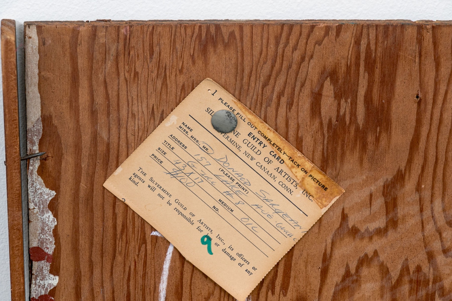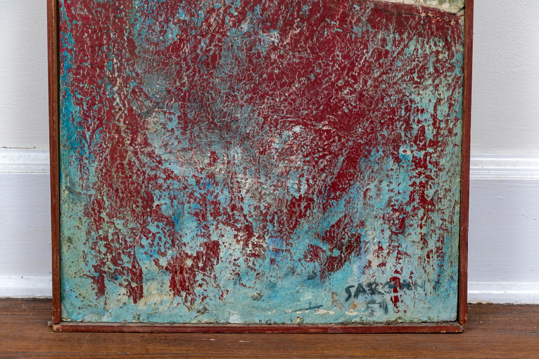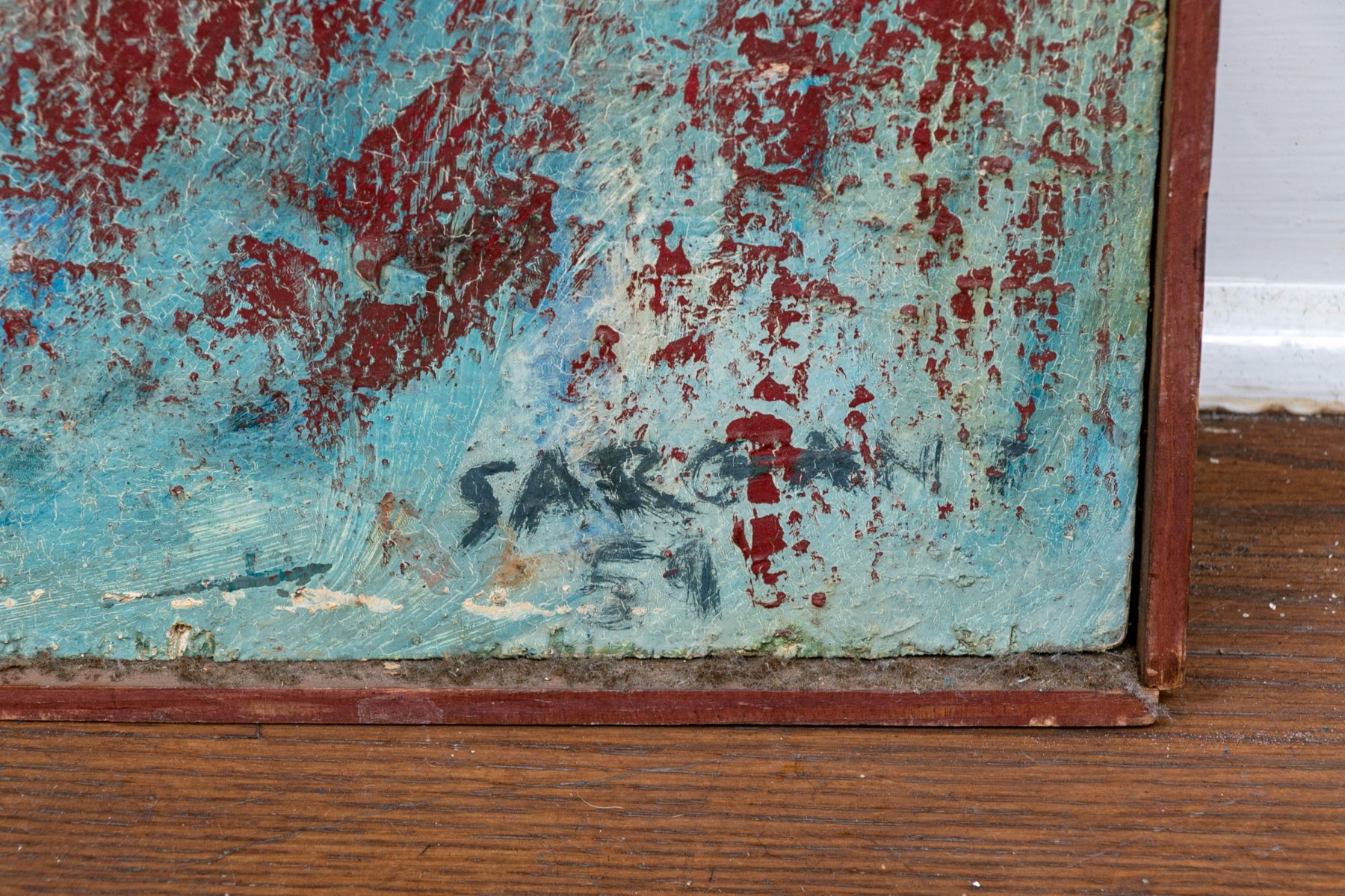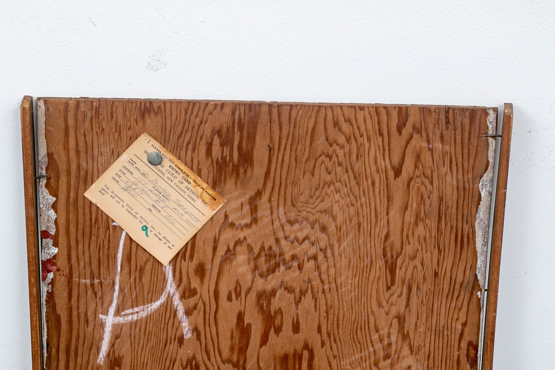 Condition: There is wear and losses to the painted finish, mostly in the areas with heavy impasto. The frame has been nailed into the panel and there is damage where the nails have come out with losses and cracks to the upper panel section which is loose and should be repaired and reaffixed. Despite wear the painting presents well.