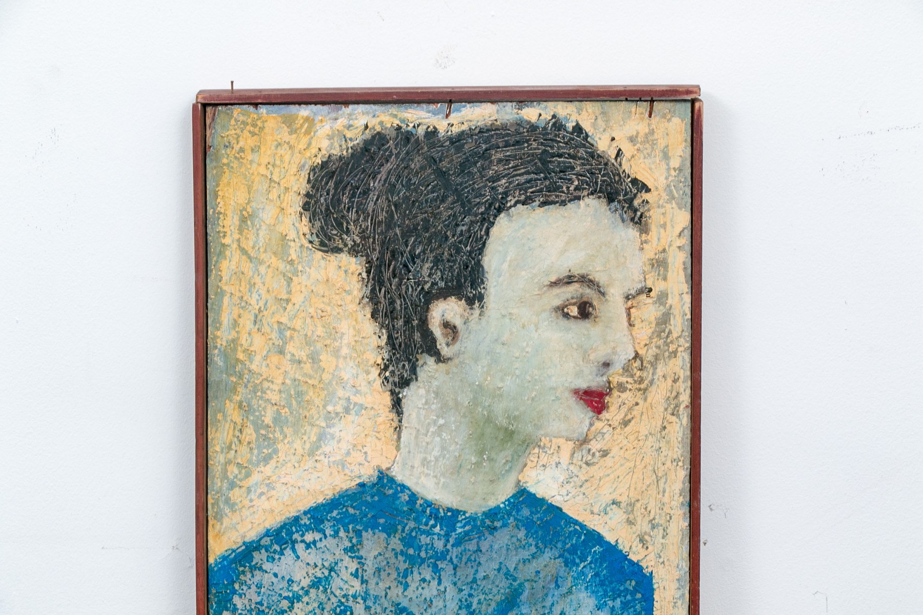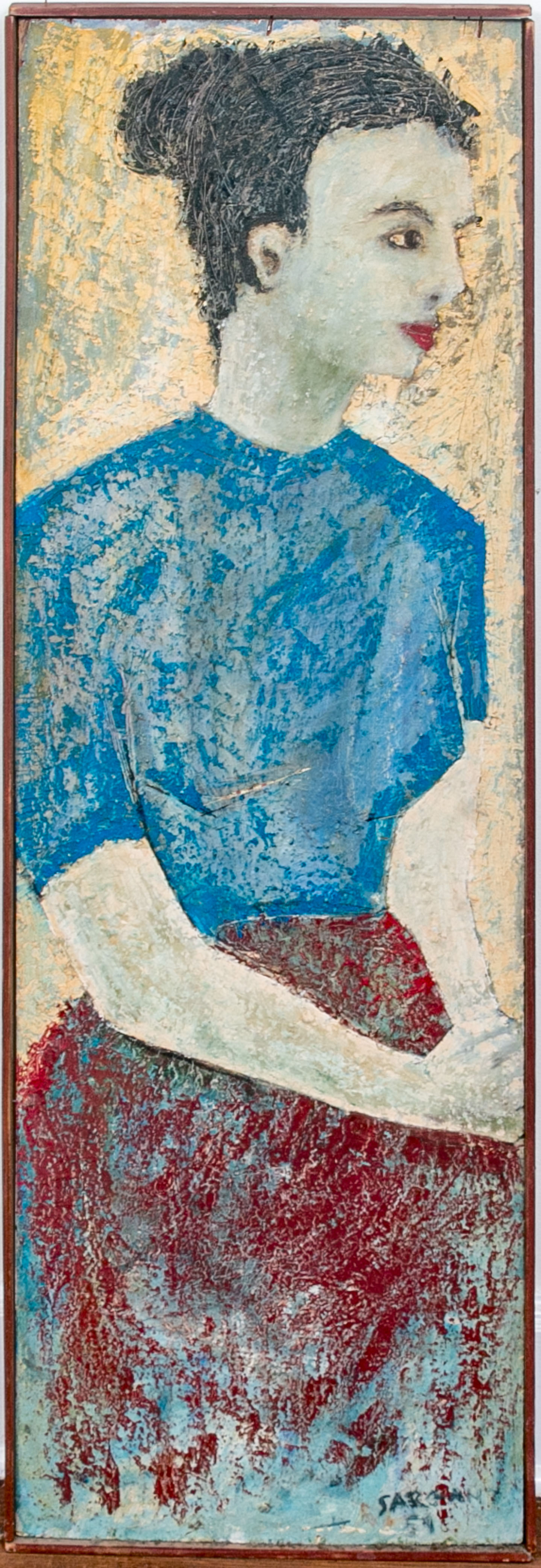 The painting depicts a woman in a blue top and red skirt with her hands clasped in profile.