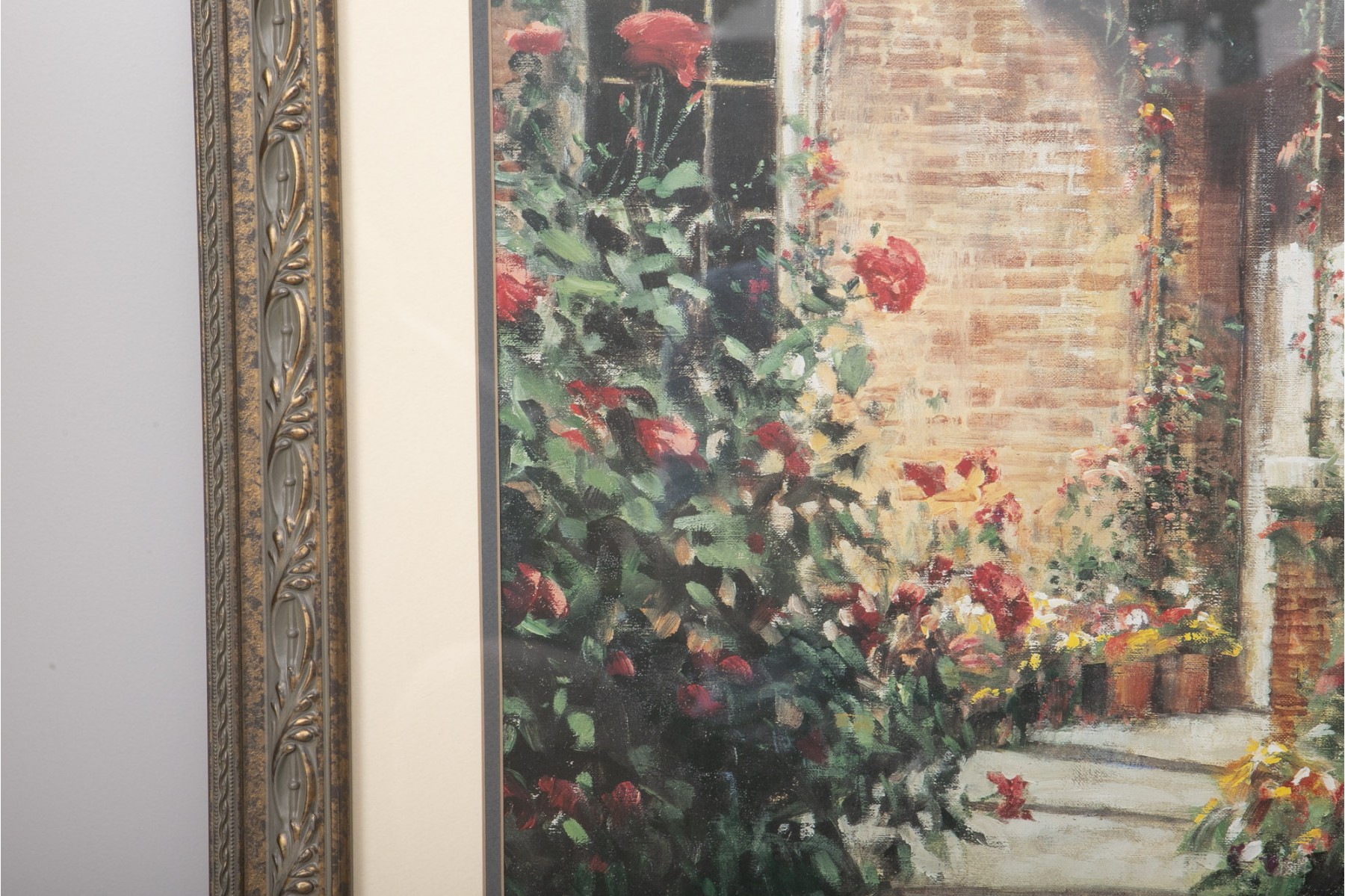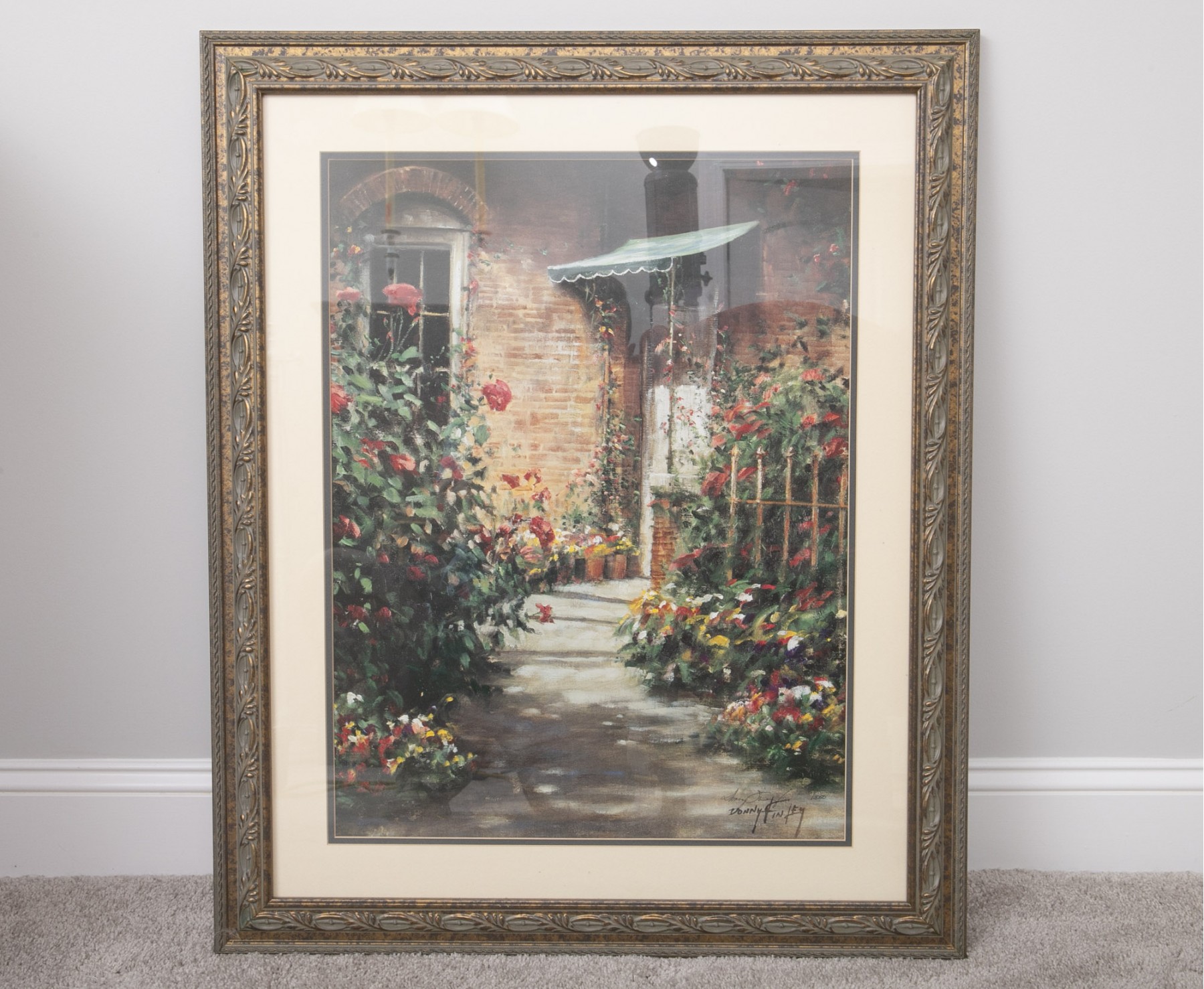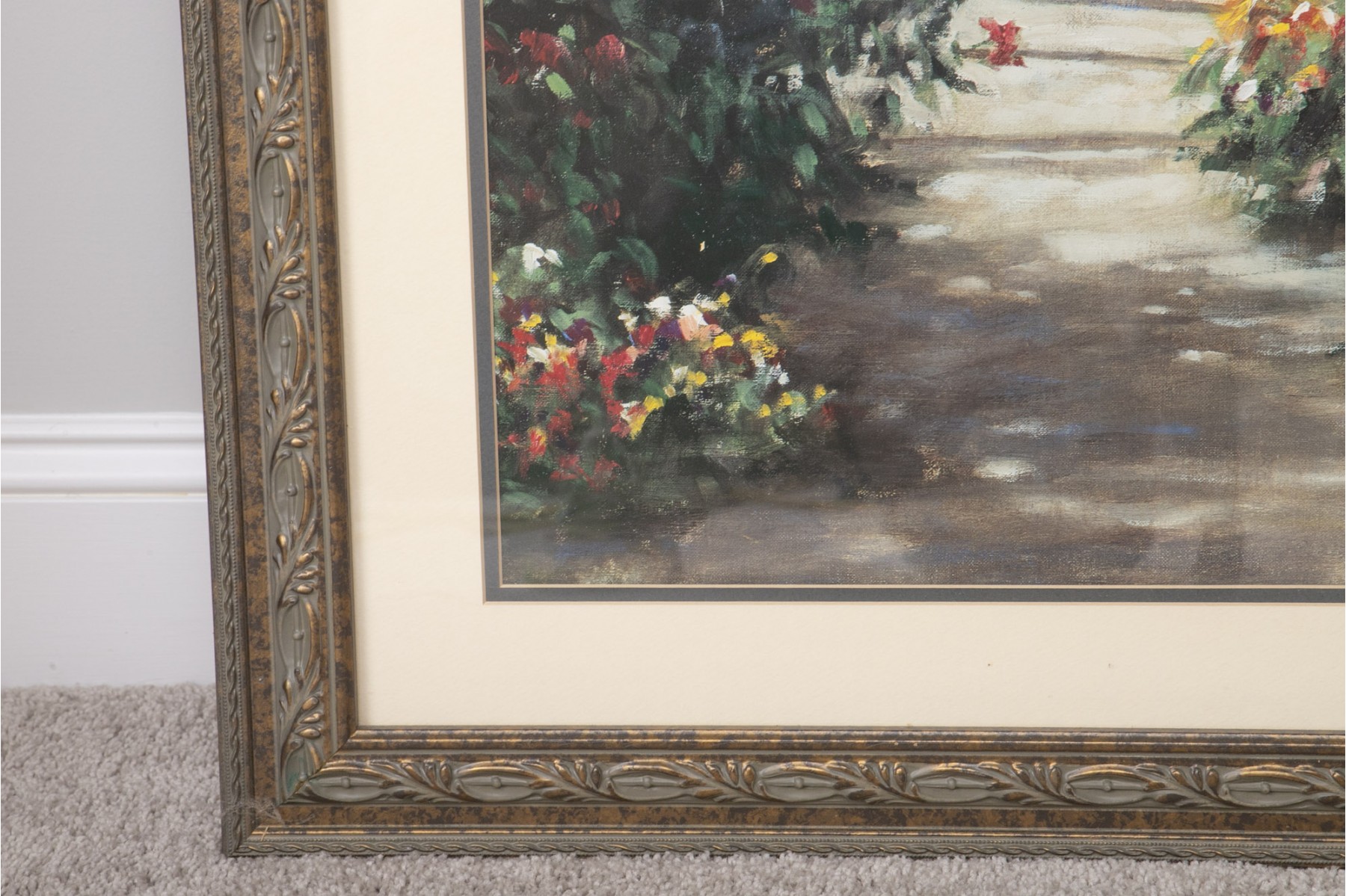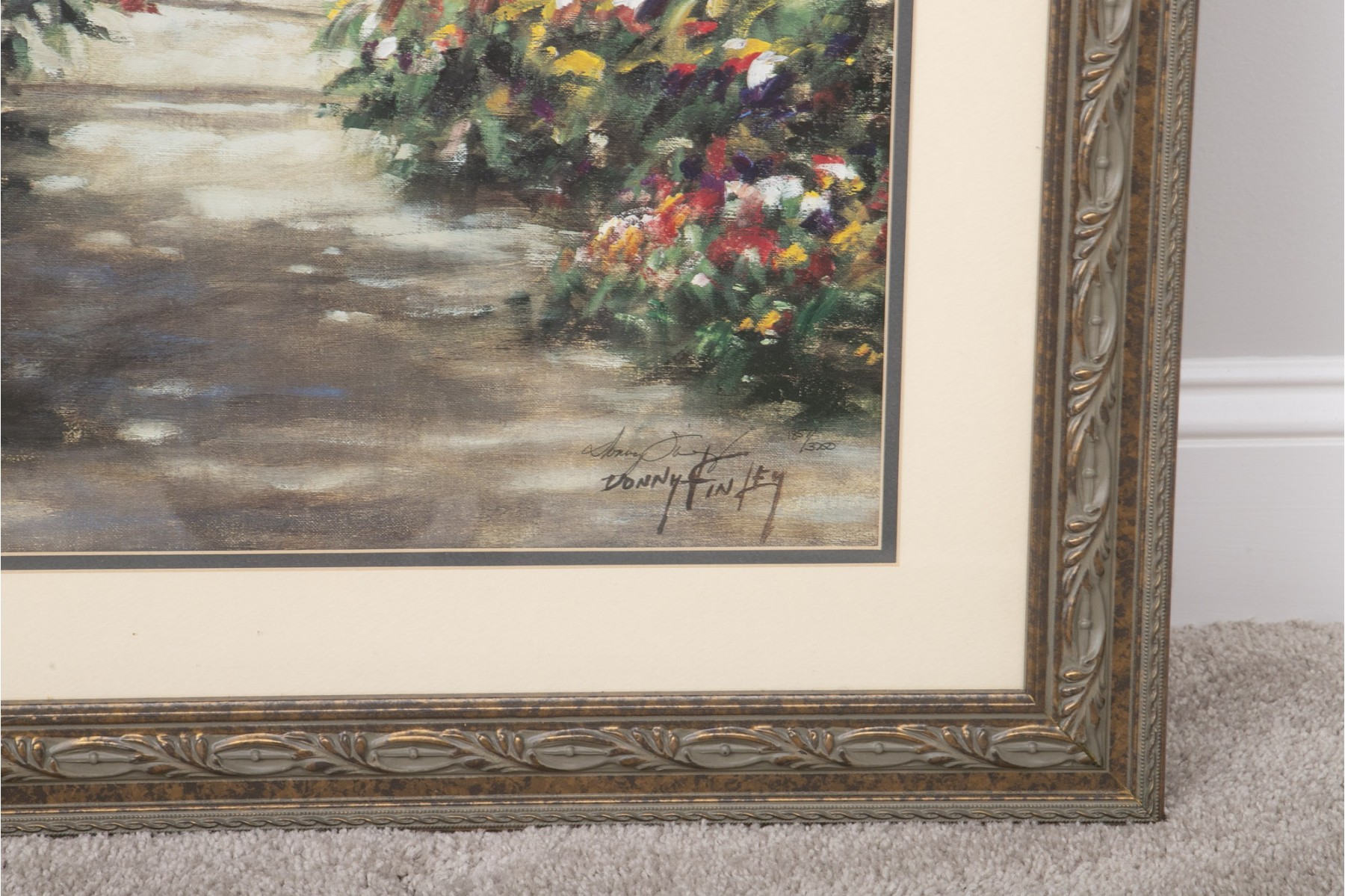 Donny Finley (American, b. 1951) print depicting a yard in front of a brick house burgeoning with lush pink, yellow, and white flowers along vibrant green foliage. Pen signed and numbered 1857/3750 lower right. Displayed behind glass with tiered white and gray mats in a gilt frame with foliate relief trims.
