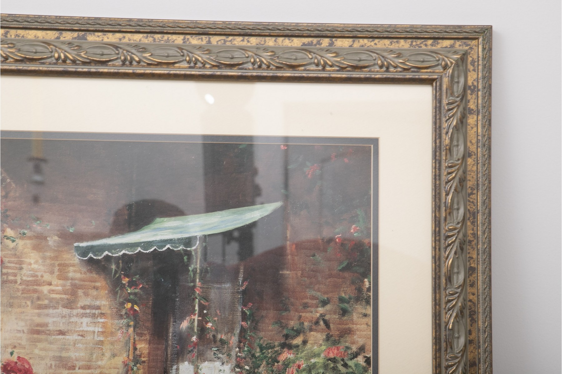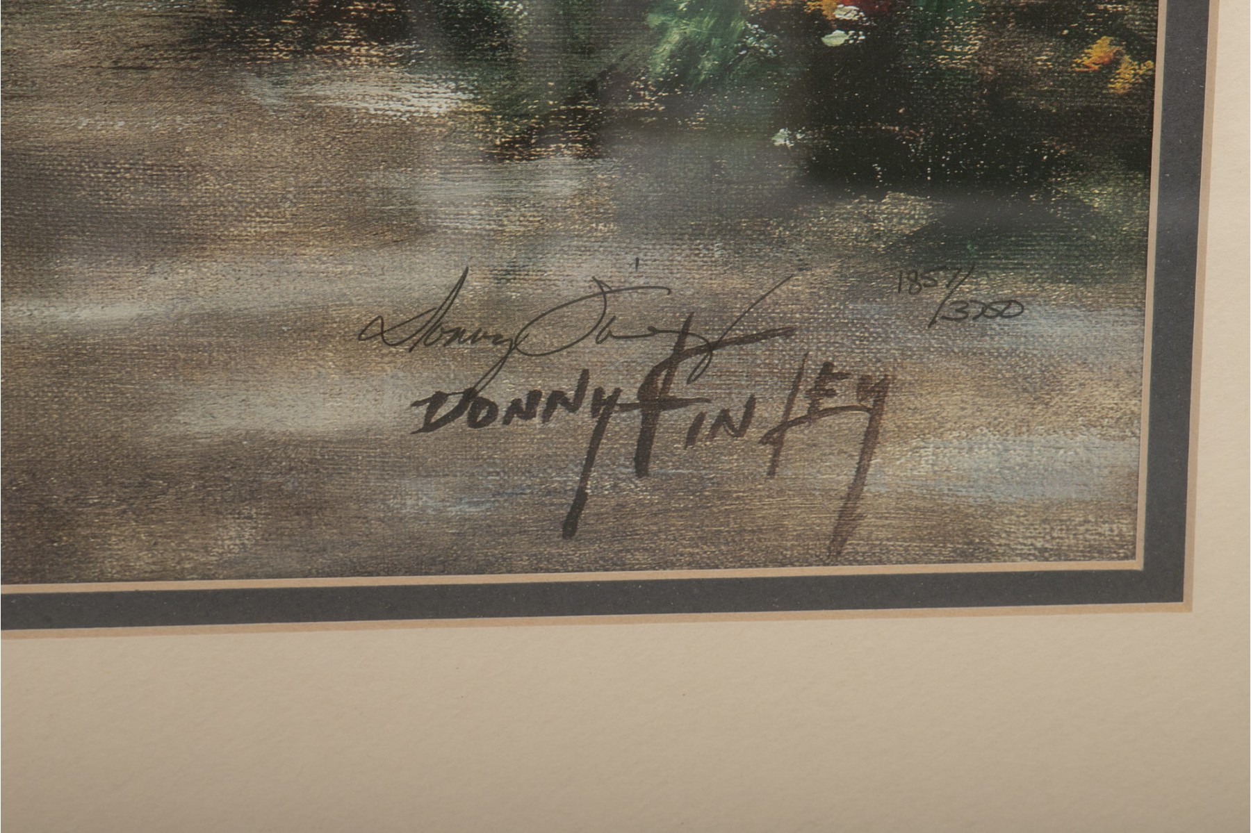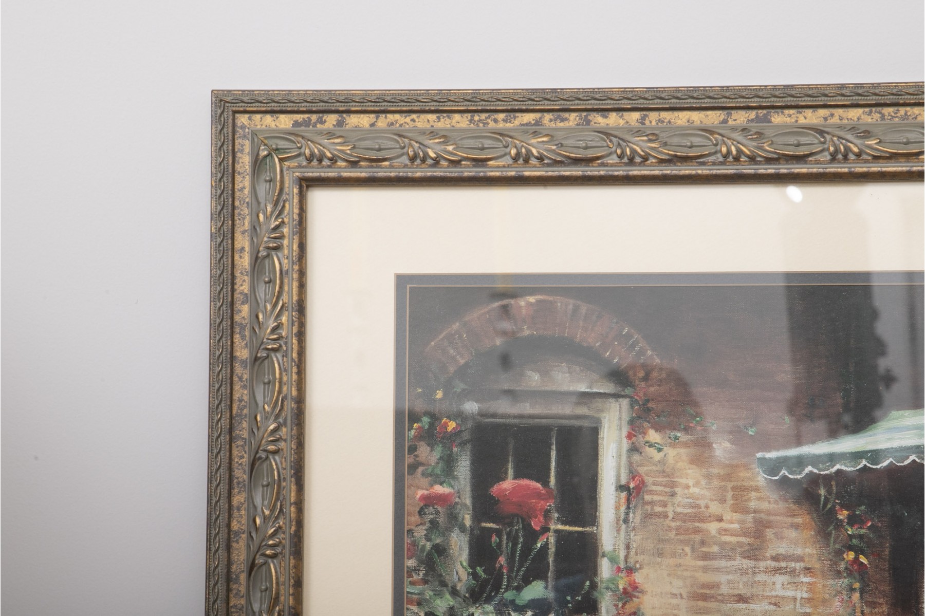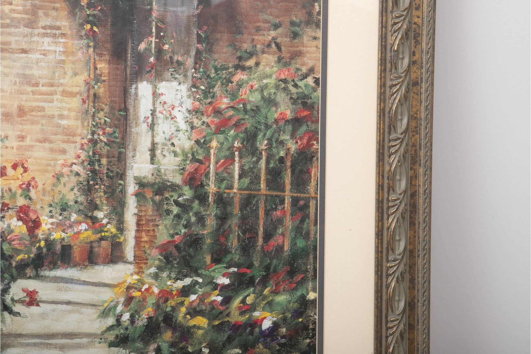 Donny Finley (American, b. 1951) print depicting a yard in front of a brick house burgeoning with lush pink, yellow, and white flowers along vibrant green foliage. Pen signed and numbered 1857/3750 lower right. Displayed behind glass with tiered white and gray mats in a gilt frame with foliate relief trims.