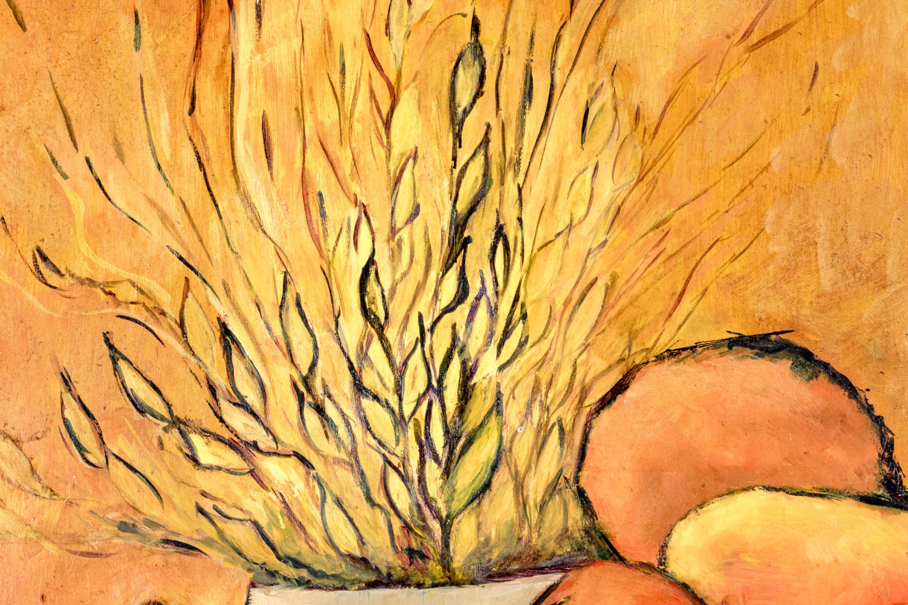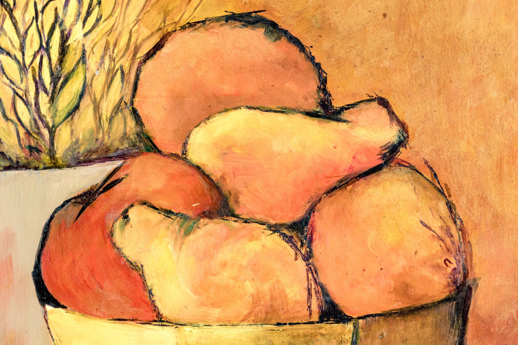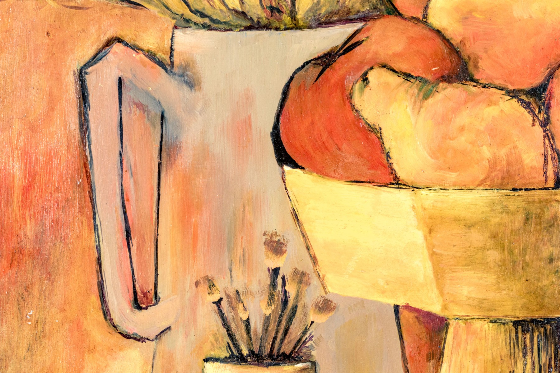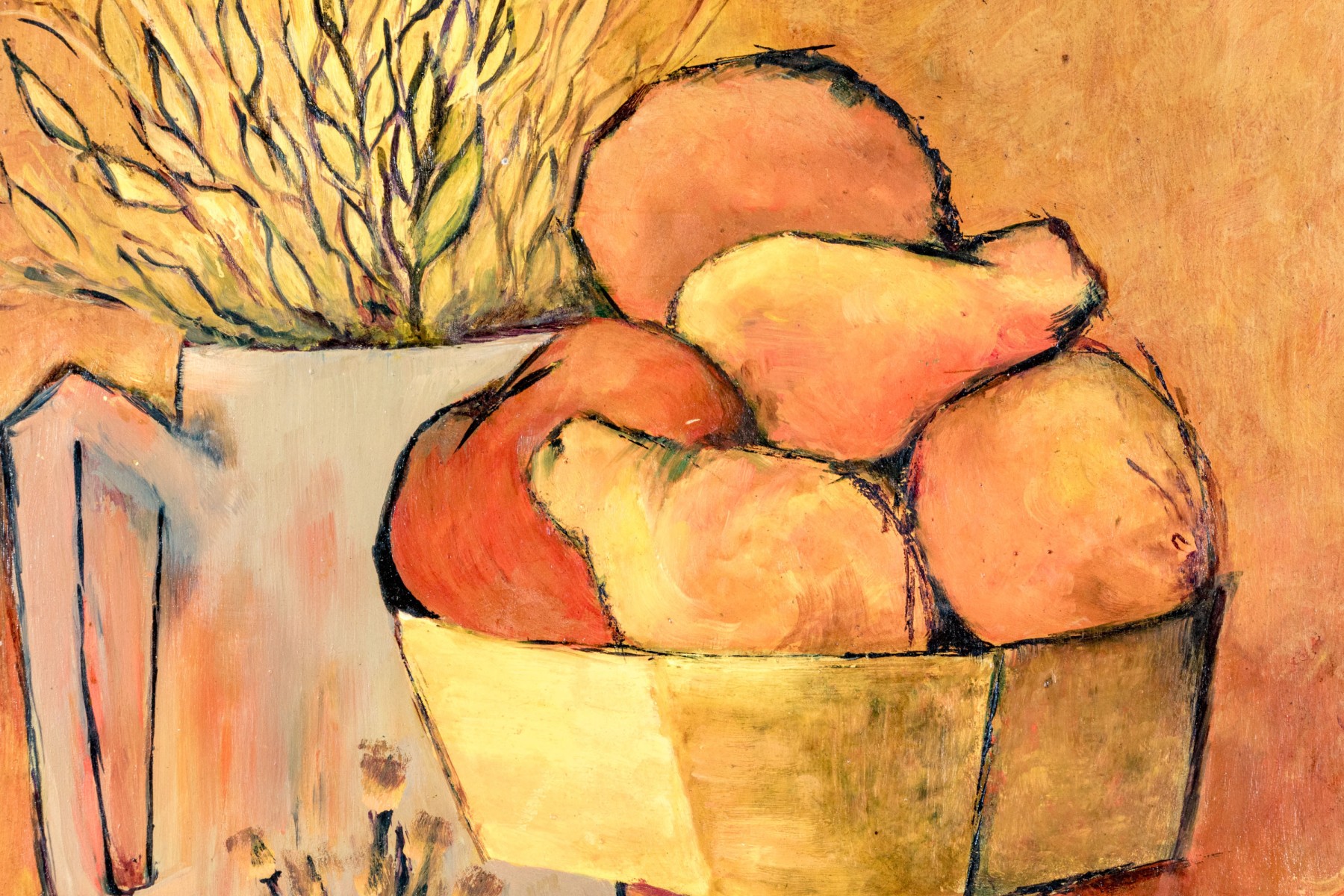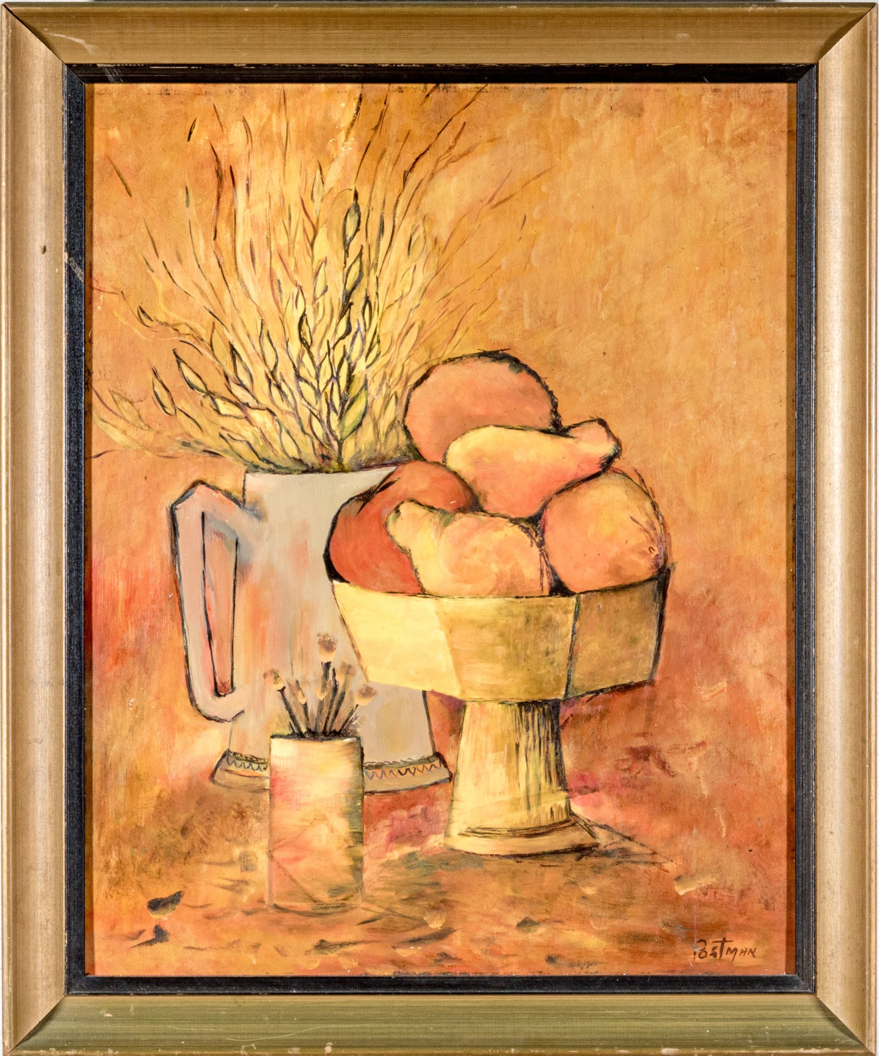 A handsome oil on board painting depicting a still life scene with a compote bowl with fruit and vegetables including a tomato, pear and orange. Additionally a water pitcher acts as a vase for a forsythia topiary with a smaller cylindrical vase with flowers in the front.