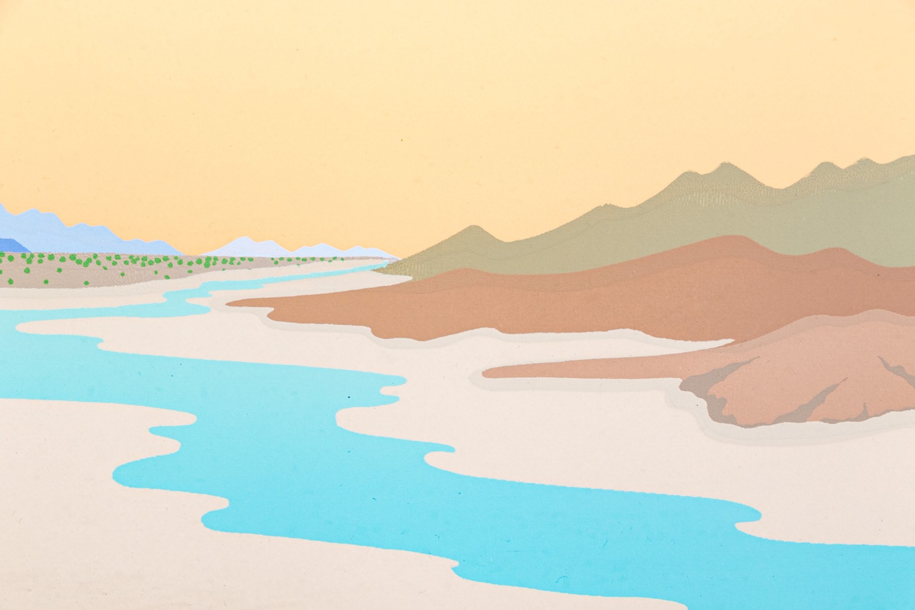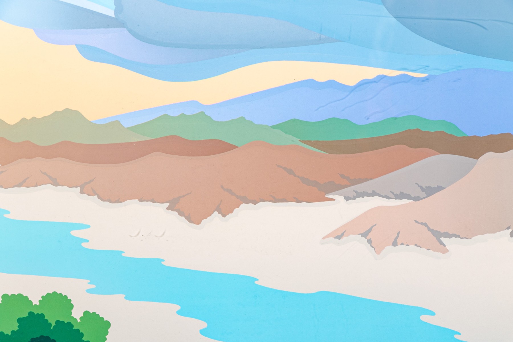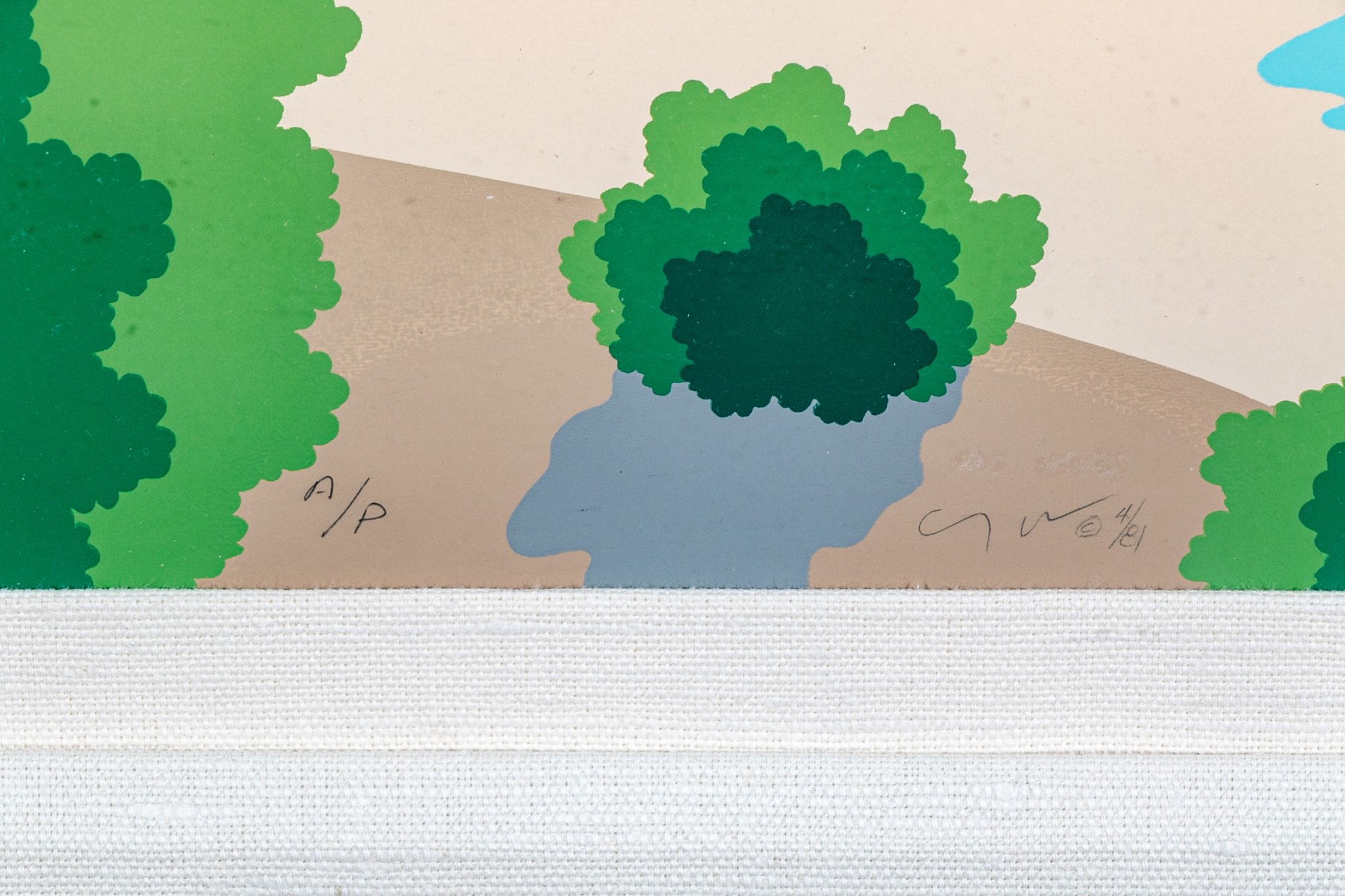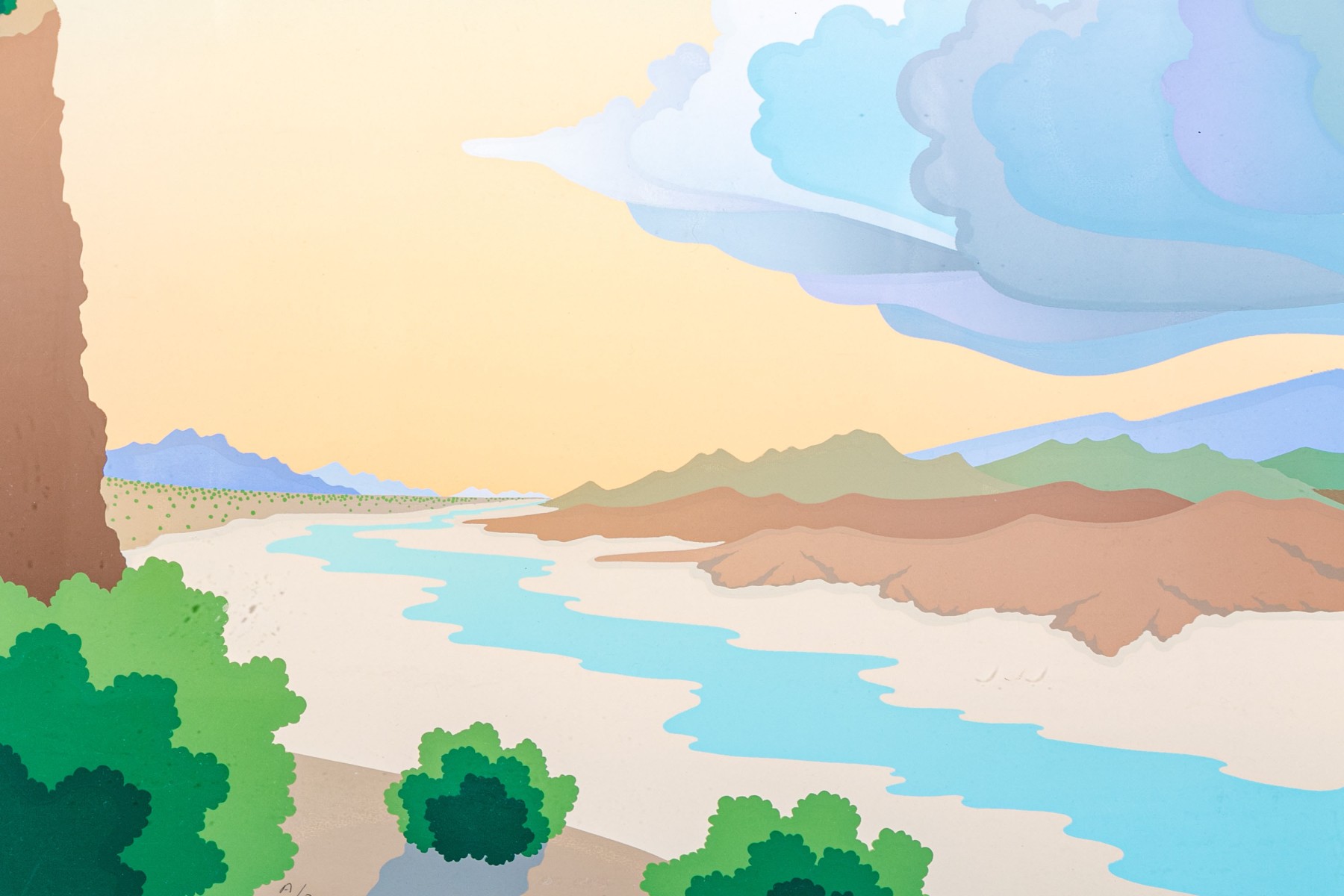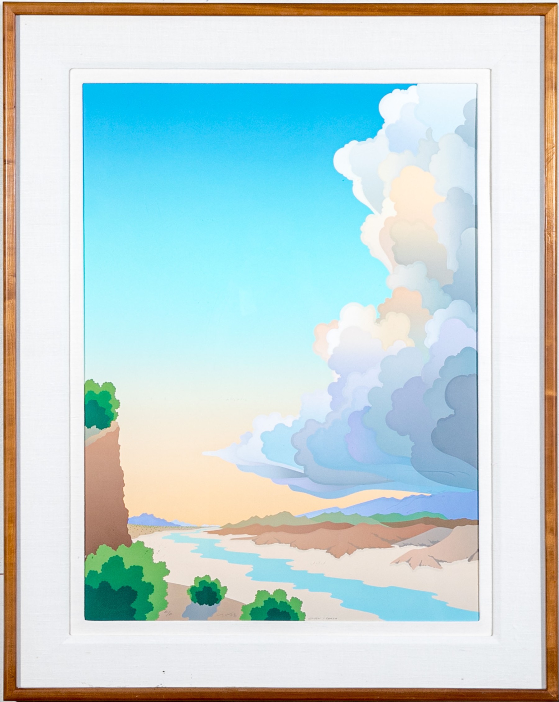 Signed and dated 9/81 lower center, numbered A/P lower left, titled lower right. An American West landscape that the artist is known for. Here a river wends its way through a desert landscape under a cloudy sky. Presented in a wood frame with linen mat and glass.