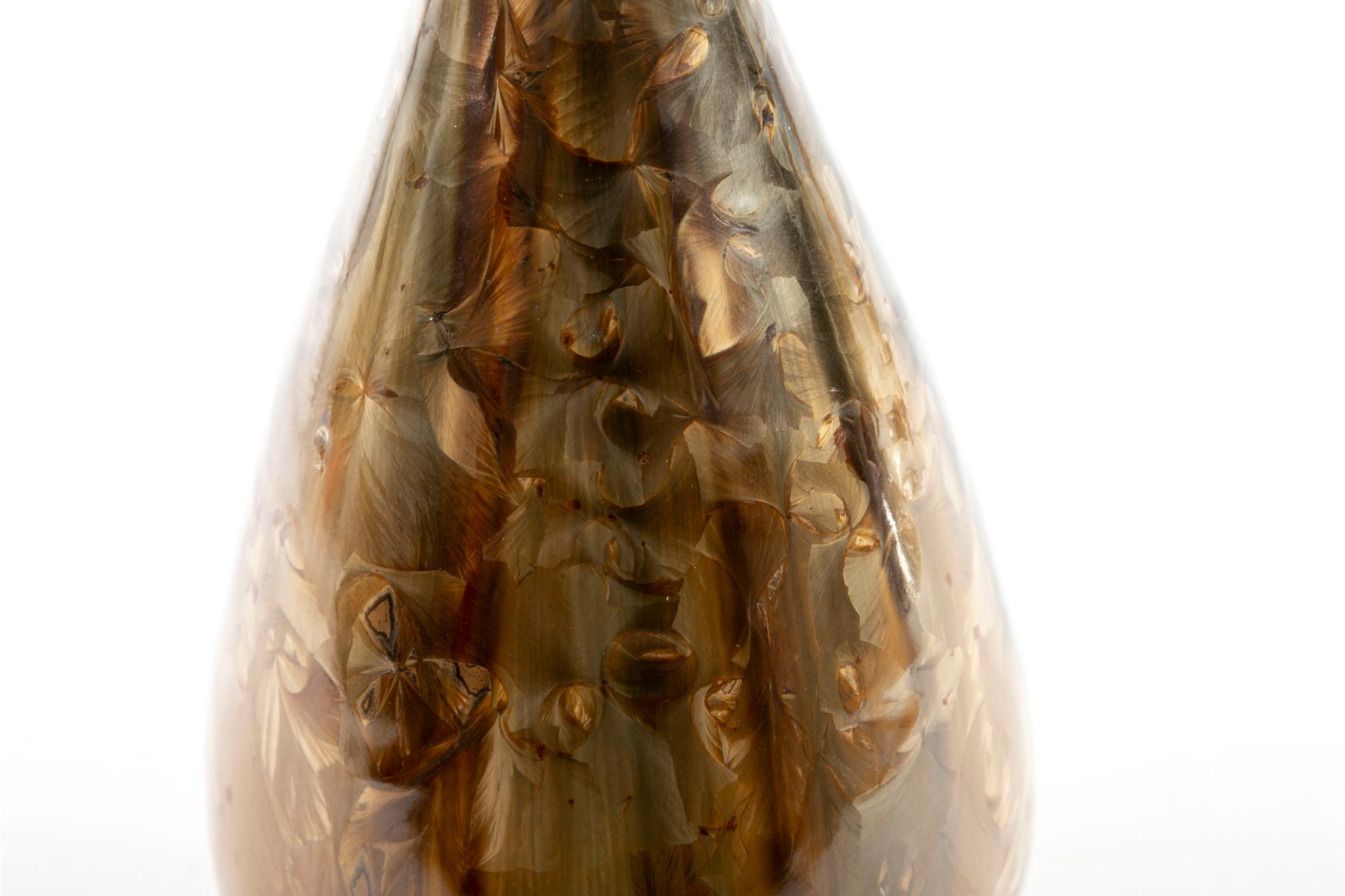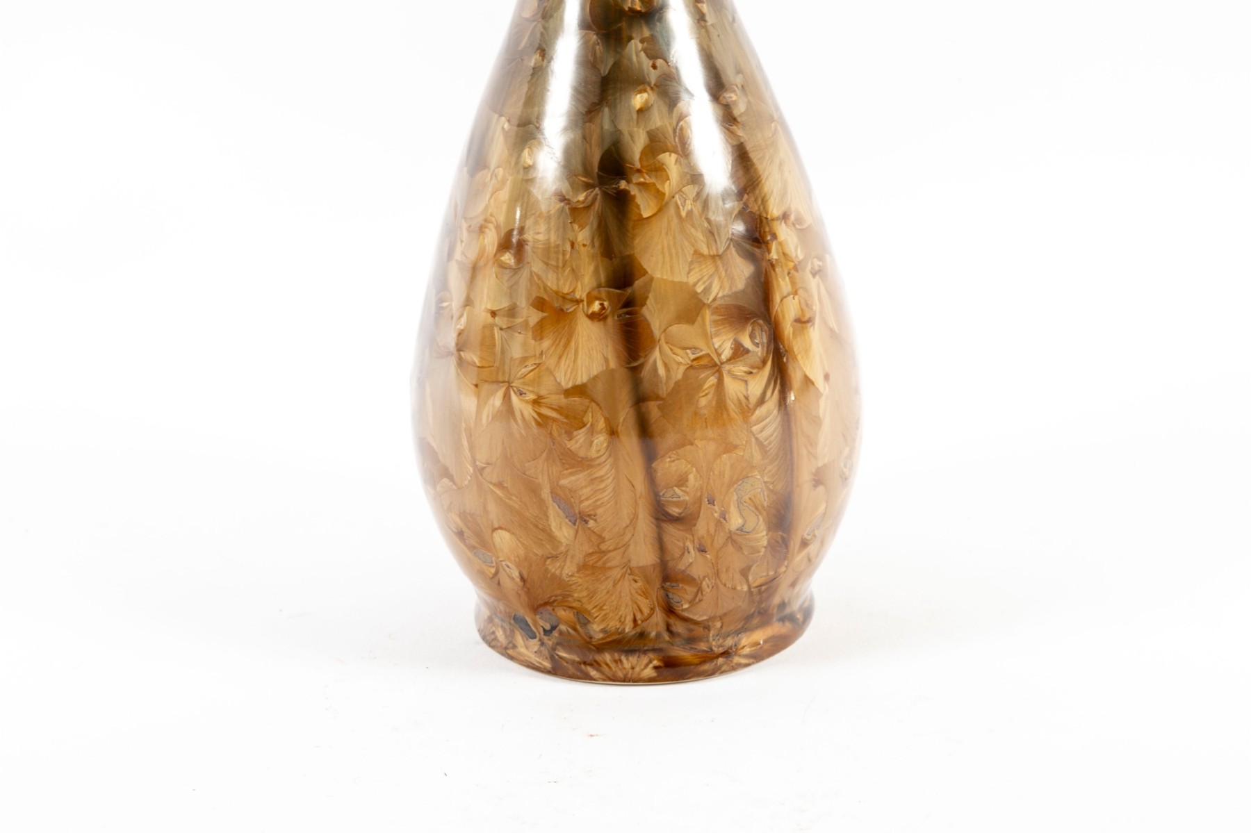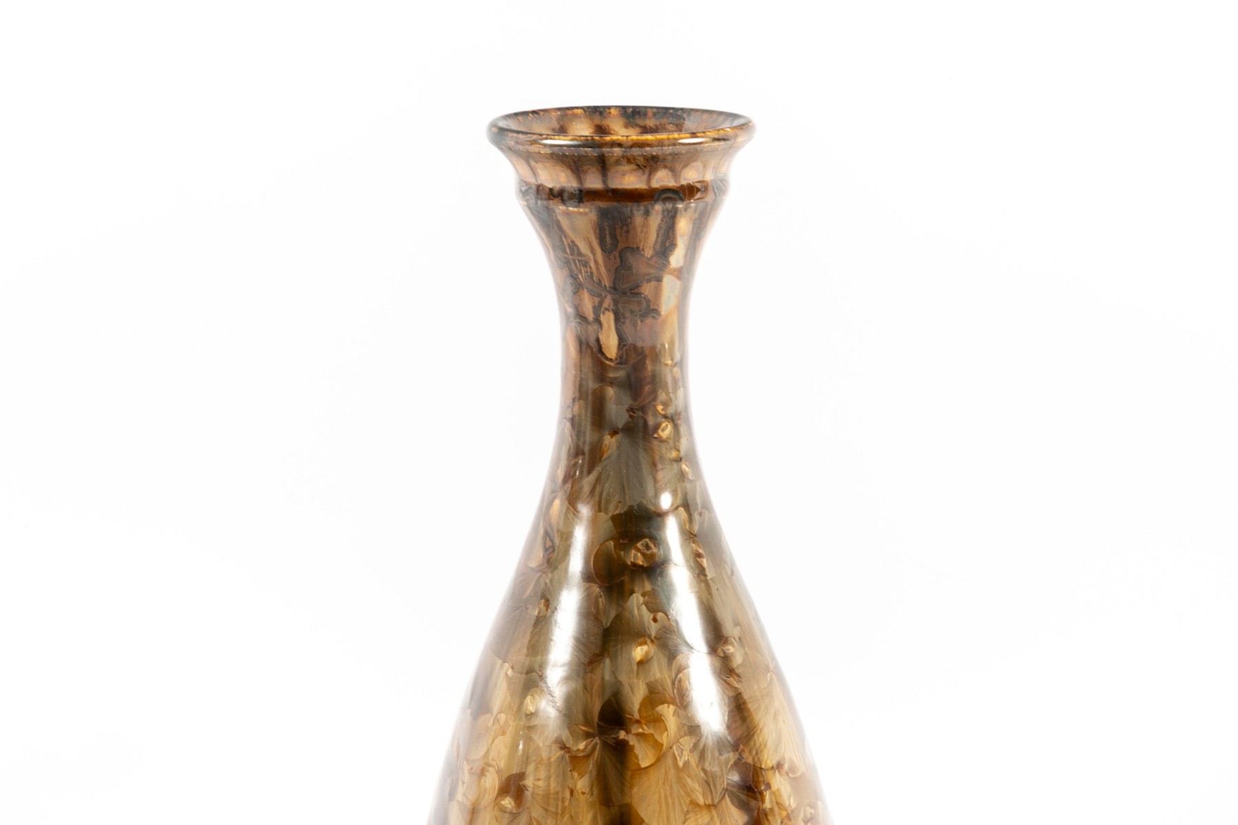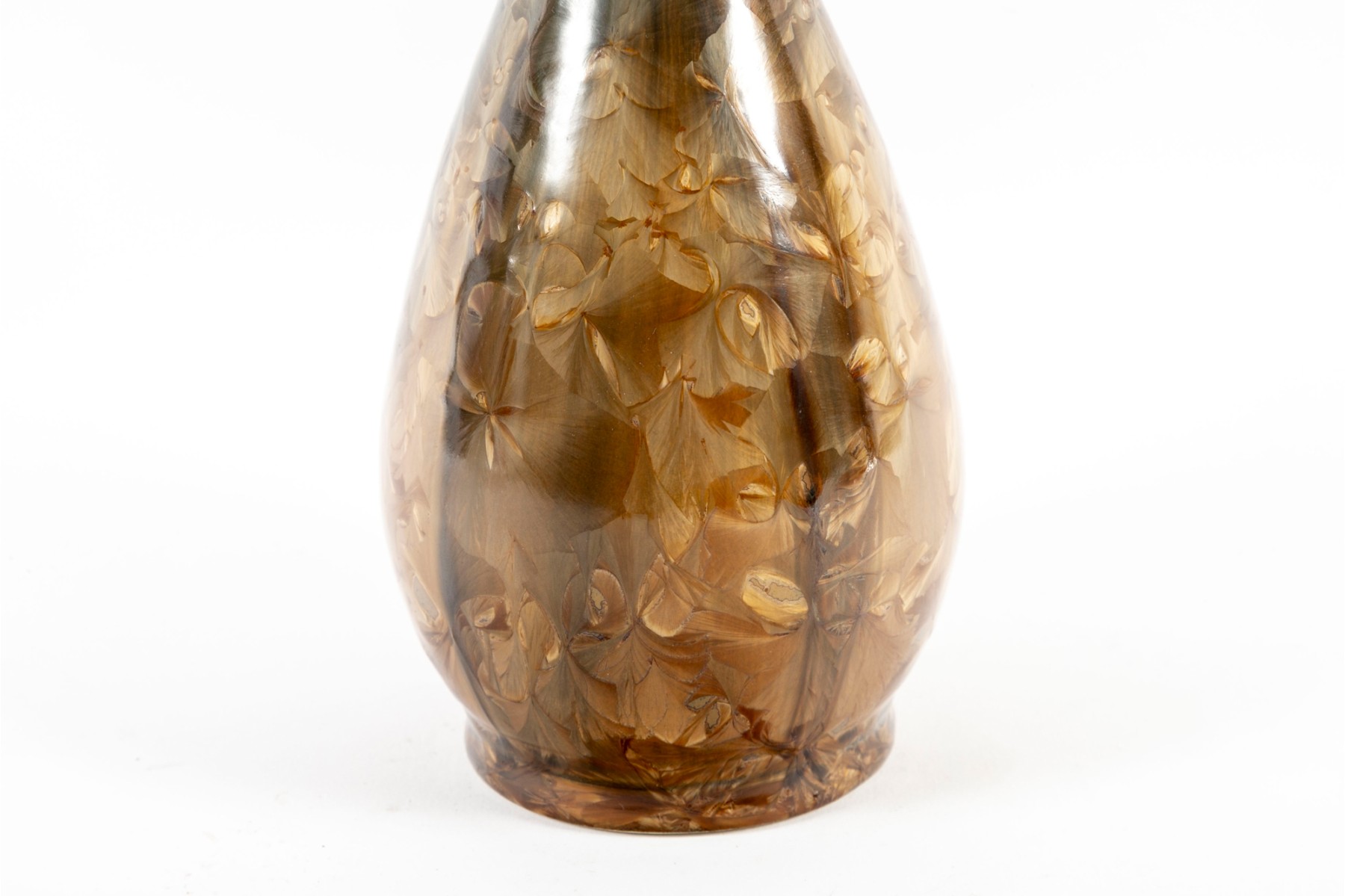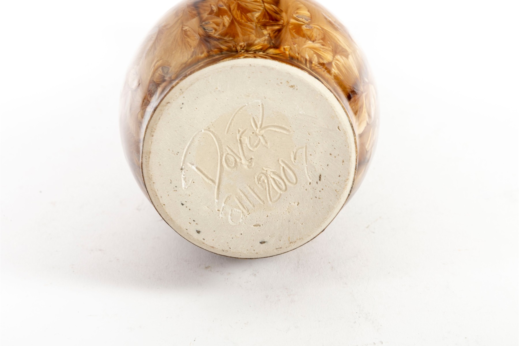 A porcelain vase crafted by Dover Pottery of North Carolina. Emboldened by a crystalline silica glaze in a rich amber, this bud vase makes for excellent decoration.