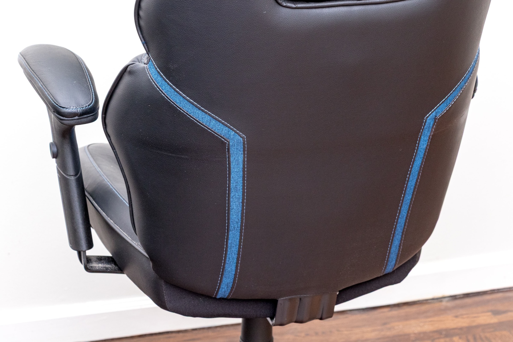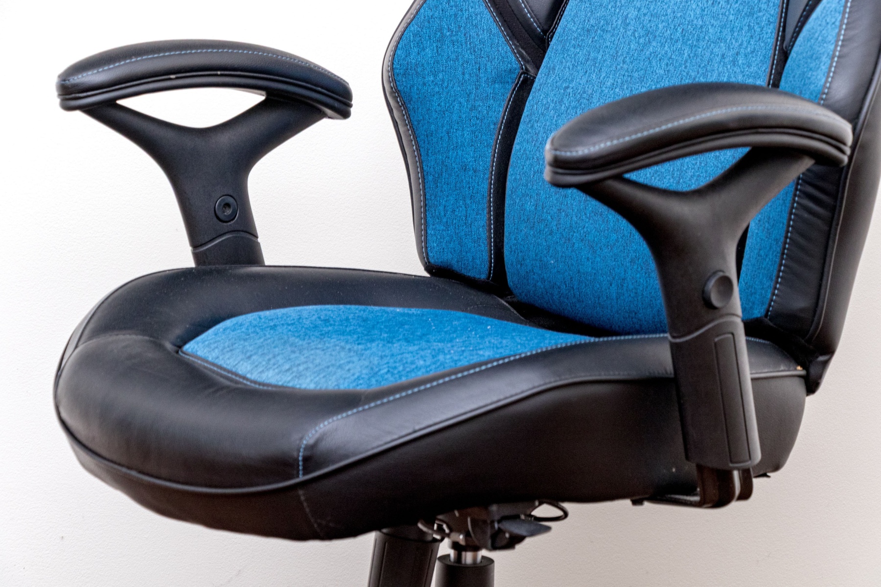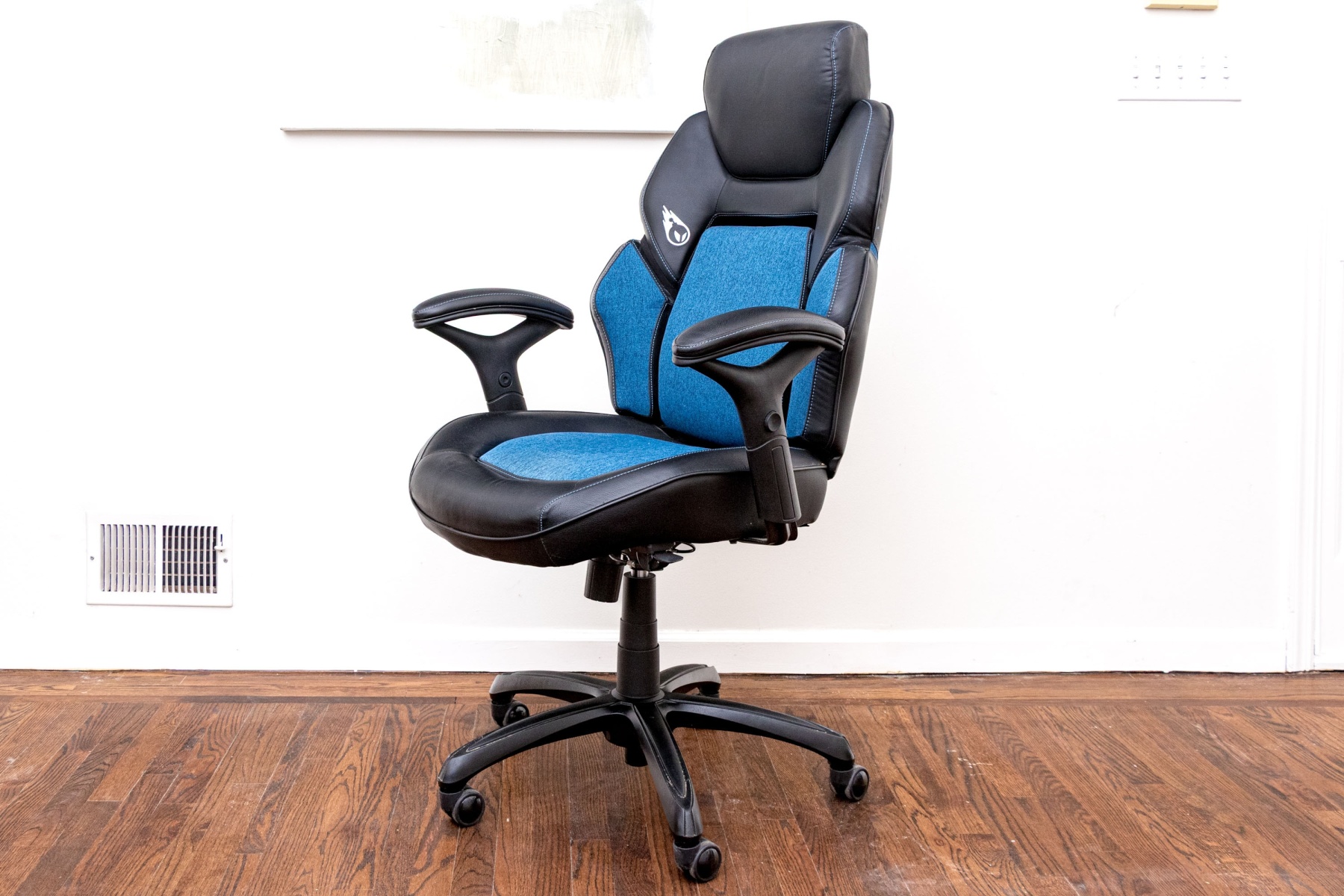 A stylish DPS 3D Insight gaming chair in black and blue, raised on five spokes with casters and adjustable height pedestal with adjustable seat and arms.